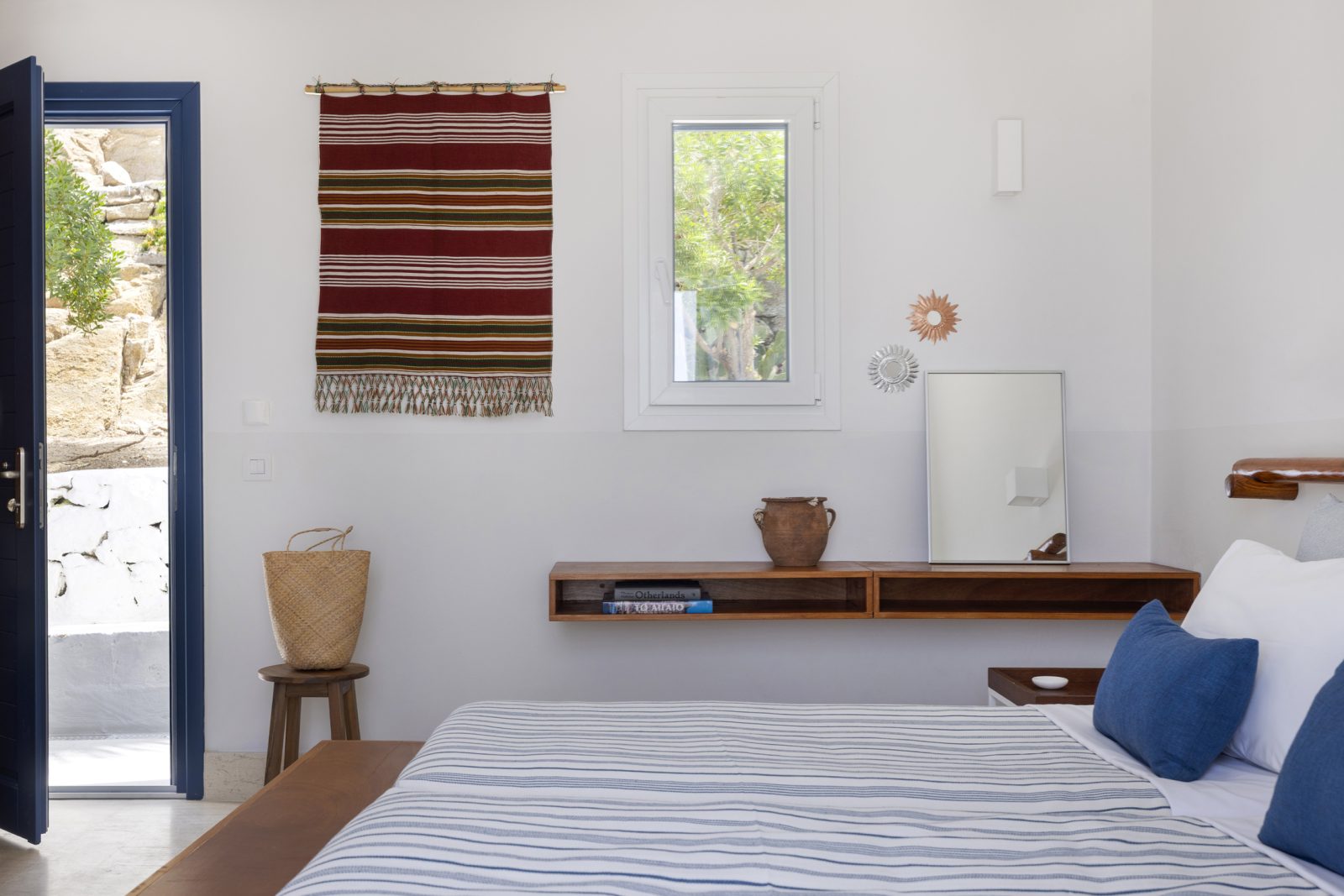 Soft furnishings such as fabrics, tapestries, and cushions have been carefully selected to echo traditional Mykonian craftsmanship, reinforcing the connection to local heritage.