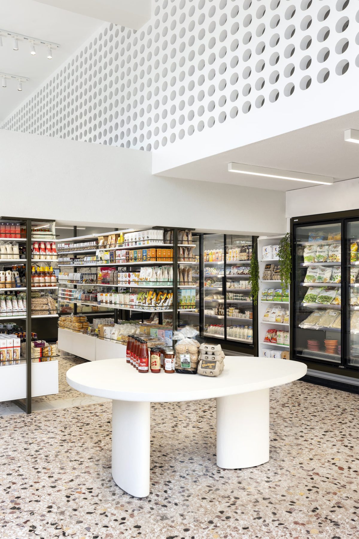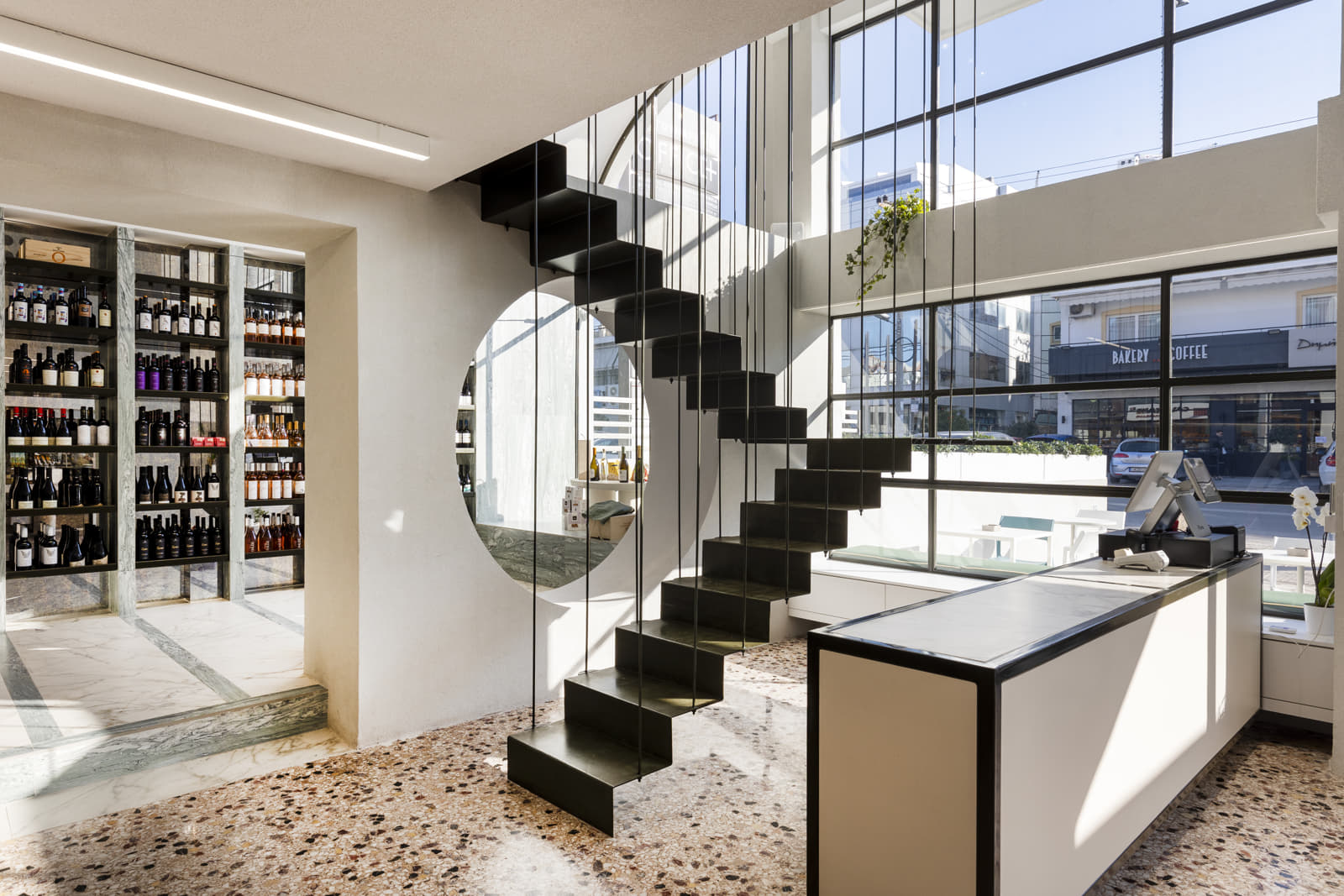 Το κατάστημα αναπτύσσεται κατά μήκος της όψης του στο δρόμο με μια ακολουθία χώρων, κεντρικά την είσοδο με το καφέ και σε γραμμική διάταξη τις ραφιέρες των προϊόντων και τα ψυγεία διατήρησης. Στα δύο άκρα της διάταξης τοποθετούνται το κρεοπωλείο και η κάβα αντίστοιχα.
