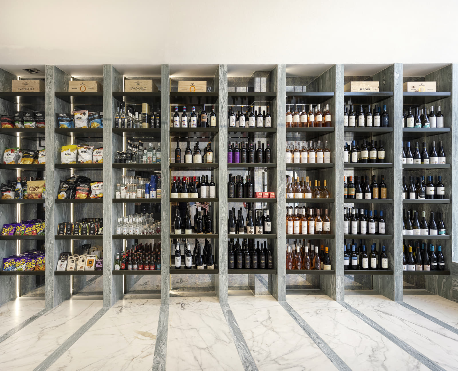 The store is developed along the street frontage with a sequence of spaces, centrally the entrance with the café and in a linear arrangement the product shelves and storage refrigerators. At either end of the layout are placed the butcher’s shop and the wine cellar respectively.