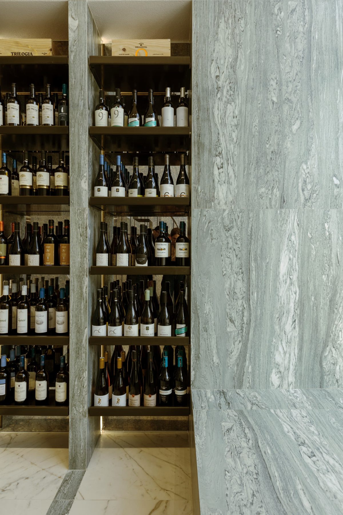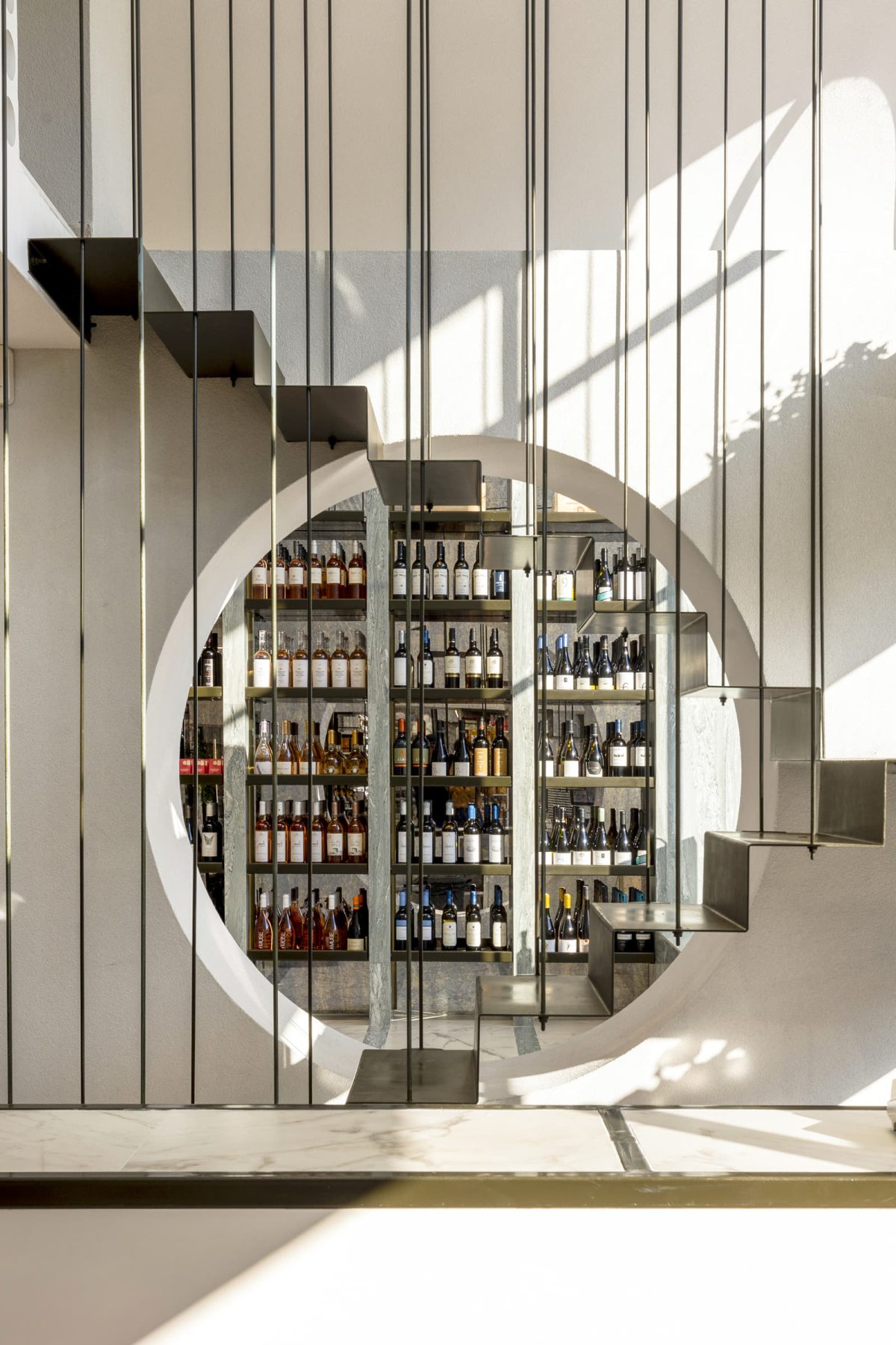 Διατηρώντας τη βιομηχανική αισθητική του κελύφους, χρησιμοποιήσαμε το μέταλλο ως βασικό στοιχείο σχεδιασμού για τη νέα διώροφη πρόσοψη, τη σκάλα, τις ραφιέρες, την κάβα και την επένδυση της επίπλωσης.