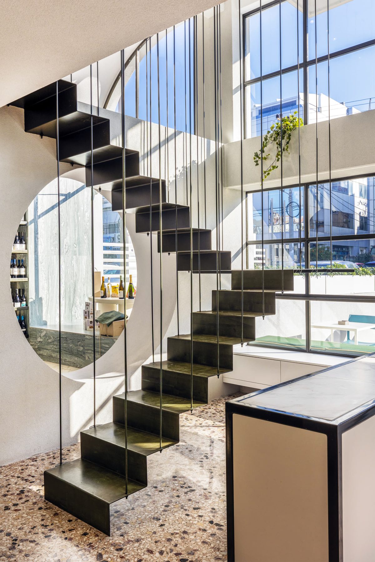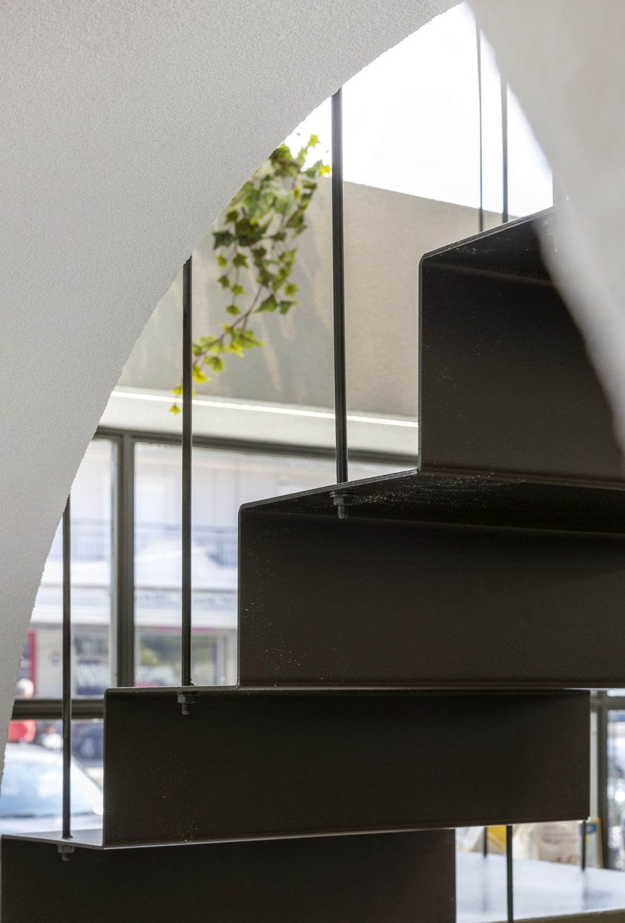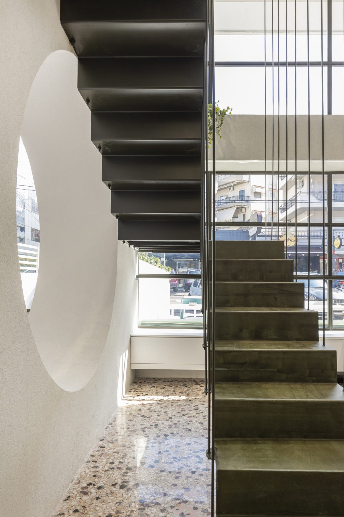 Ο σχεδιασμός της εσωτερικής κλίμακας εντείνει τη συγκρότηση του διπλού ύψους του χώρου με τις μεταλλικές ράβδους που την αναρτούν από την οροφή.