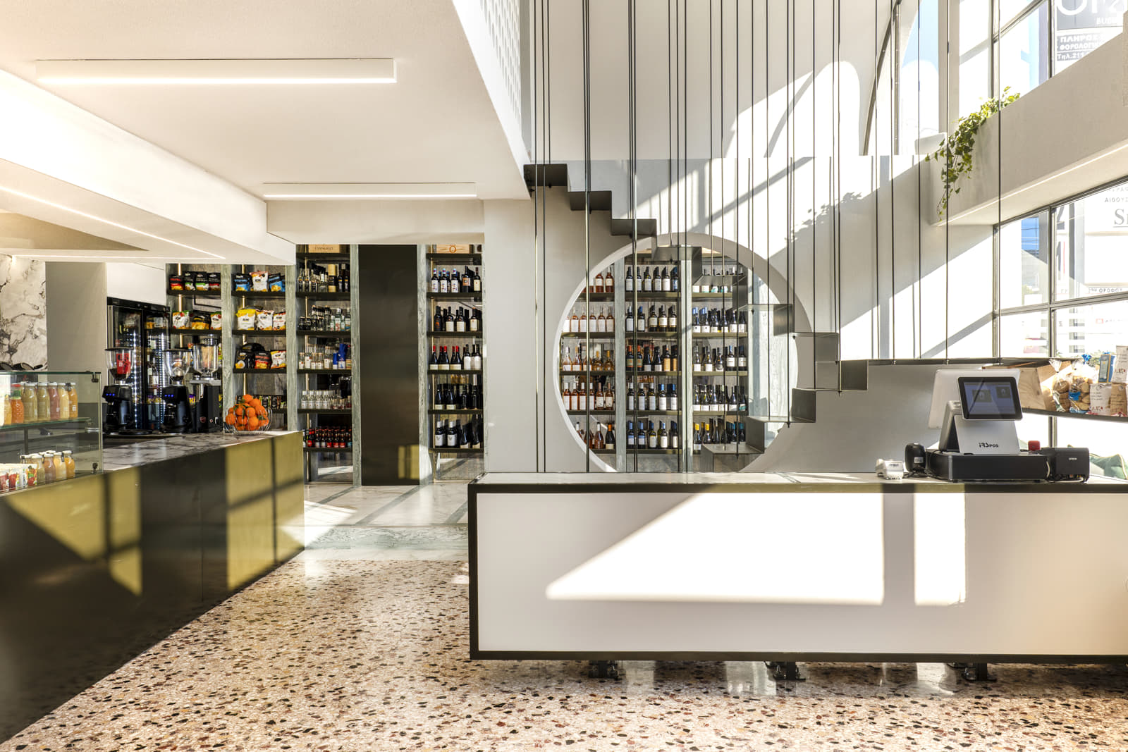 For the design of the Bonama Delicatessen, the SOUTH architecture team draws inspiration from the industrial aesthetic of the existing shell, the commercial character of the street, and the atmosphere of the Glyfada neighborhood. The interior space is a functional composition of raw materials, while the new two-story façade is perceived as the face of a modern marketplace.