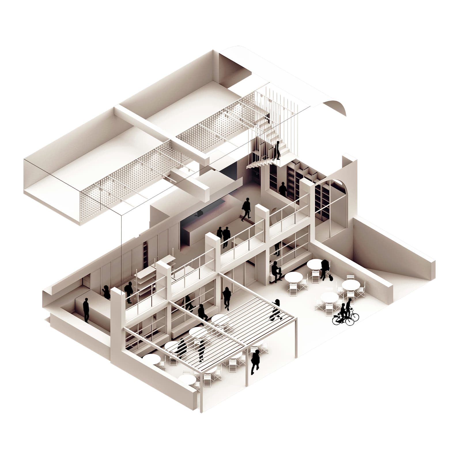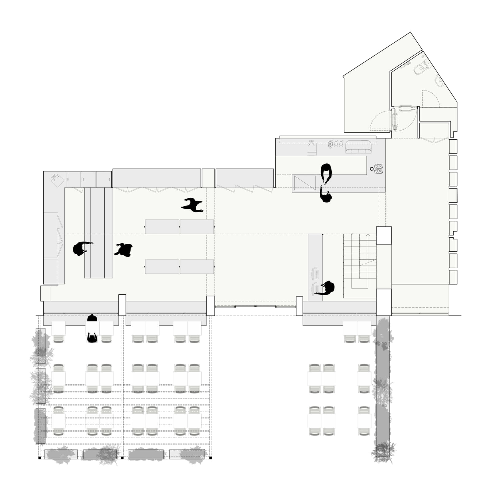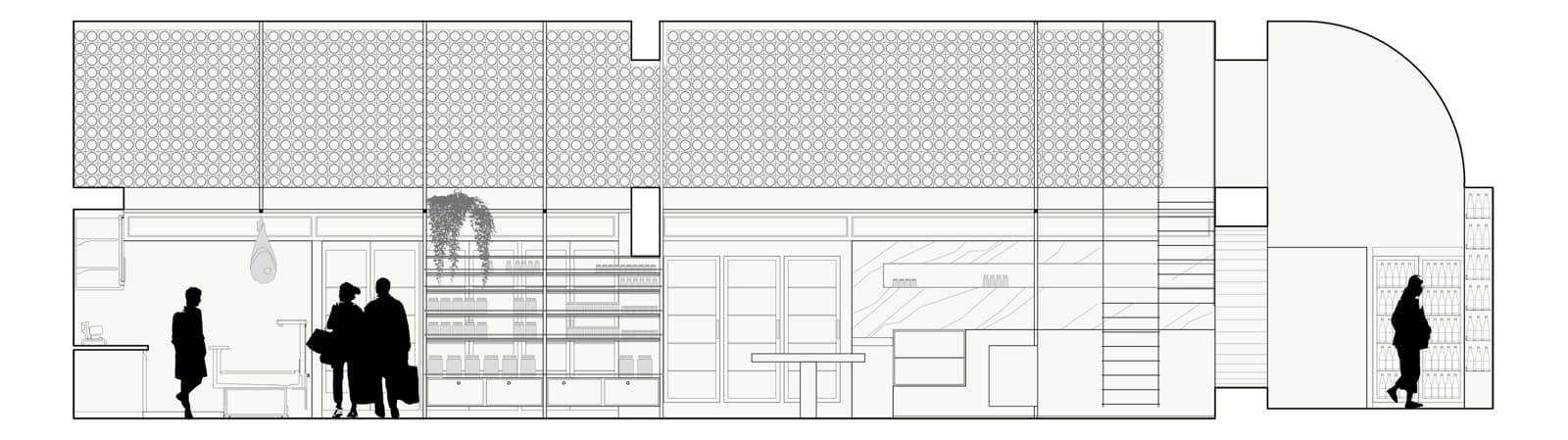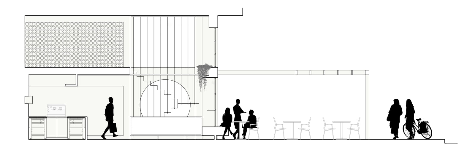 Thus, the storefront was designed with a dual use, with the interior side welcoming display shelves for product display and the exterior side extending outward as a fixed counter, part of the seating area. Thus, the fixed, transparent boundary of the façade blends the interior with the exterior.