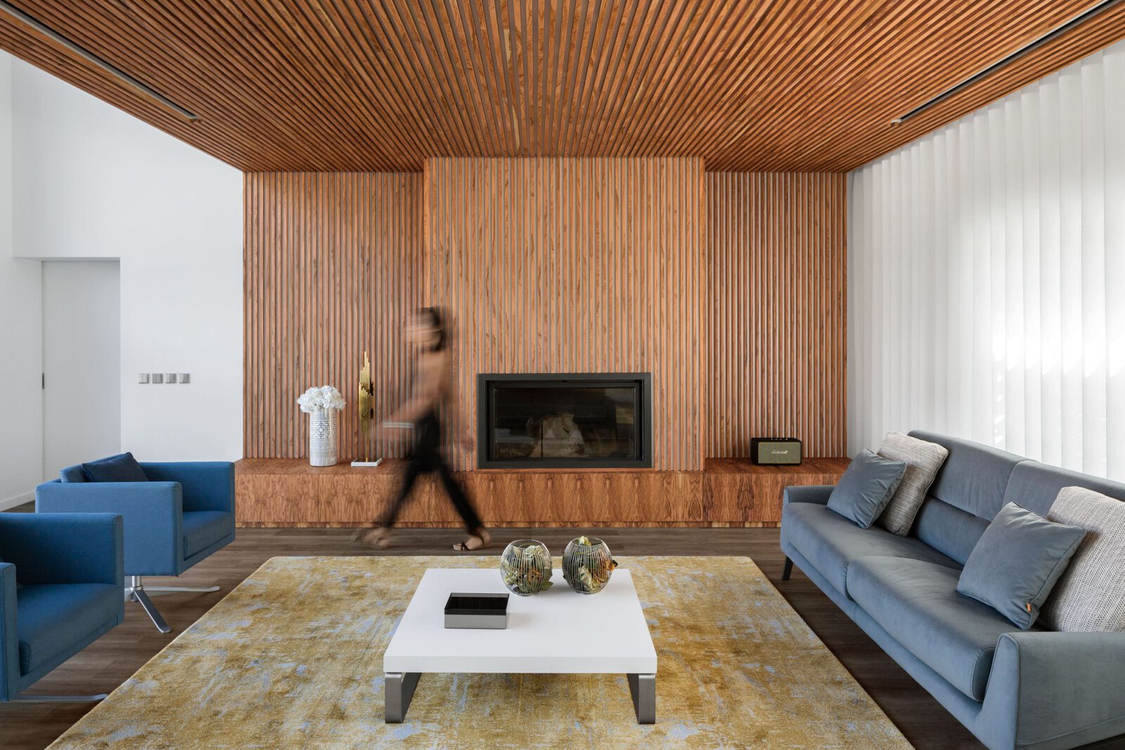 In order for this room to be effectively used, which did not happen before this intervention, it was essential to provide it with features of thermal and visual comfort, so that it gained human scale and, thus, the coldness of the exposed concrete was broken, with a double ceiling height. To this end, the ceiling height of the living area was reduced and a wooden slat was created capable of containing sounds and temperature, while clearly defining a comfortable living space, and distinguishing it from the dining area, frankly more related to the kitchen.