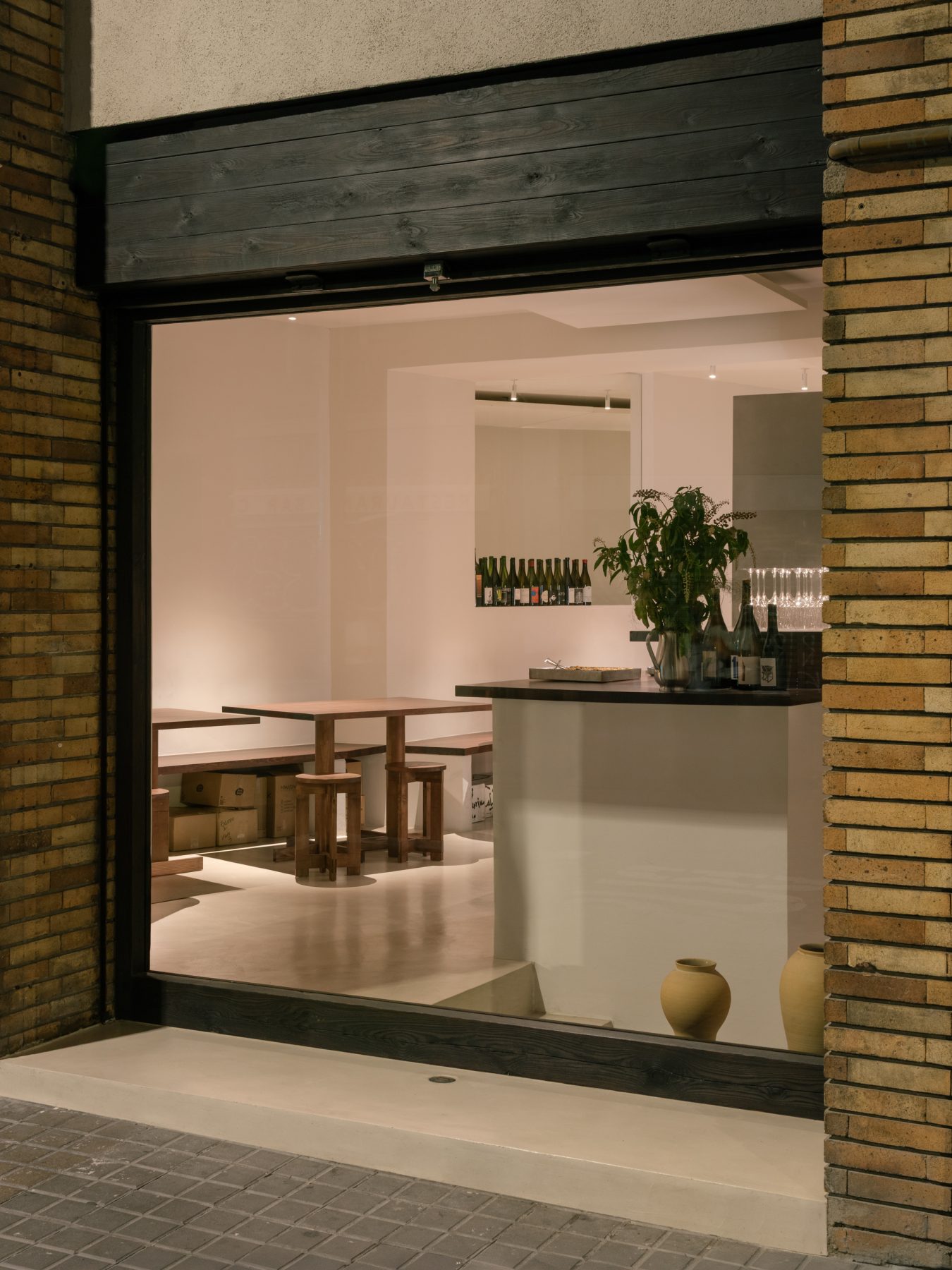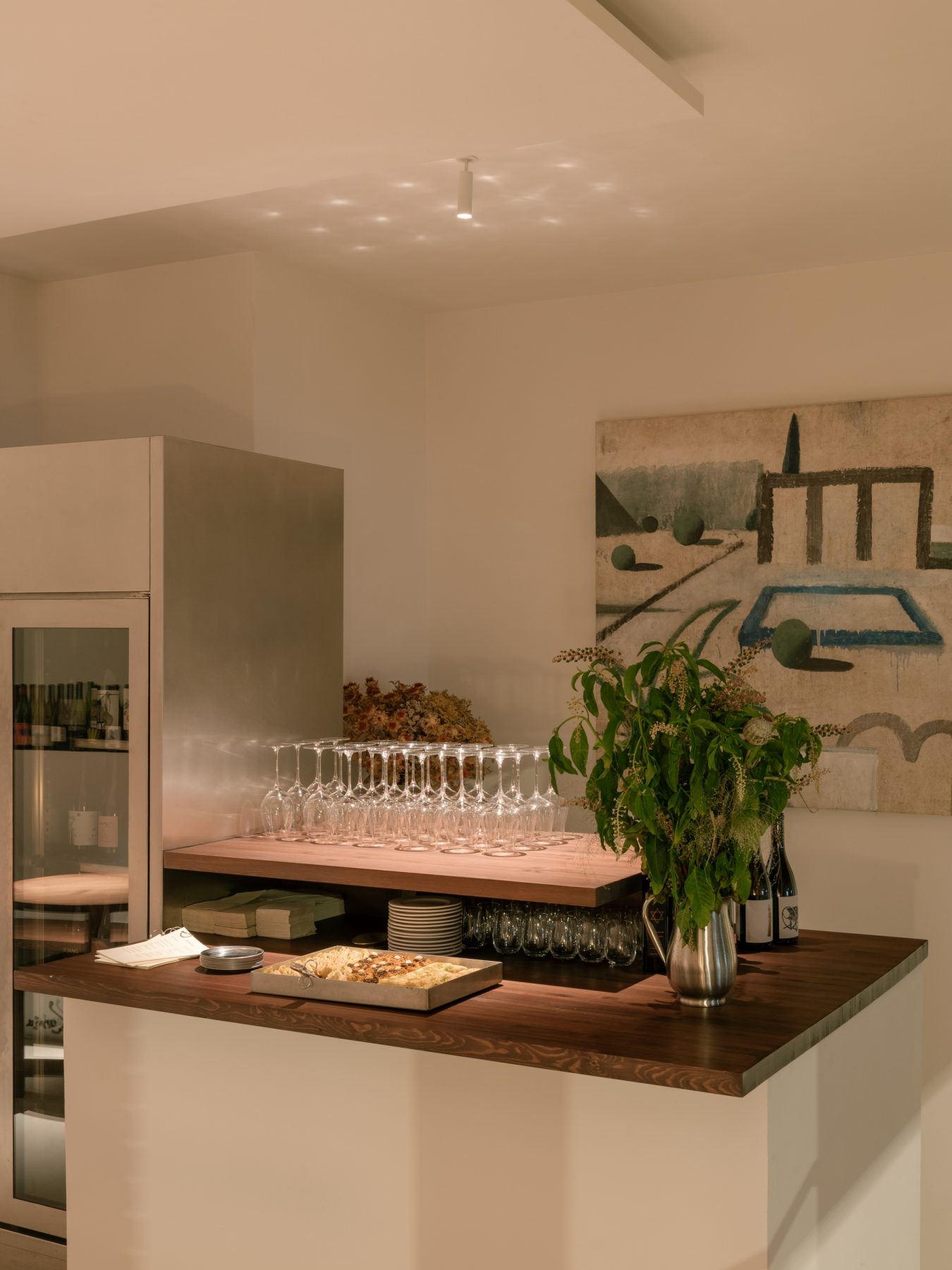Finally, when people enter through the door, they breathe in the characteristic scent of Arab grilling without seeing the kitchen; it’s hidden, but its presence is suggested by the plated dishes on the tables. The diner sits down, receives the menu and a drink, and glances at what has been served next door. There’s no indiscretion: everything is visible at that moment. The wines are presented on a backlit menu, and glasses, cups, plates, and cutlery are arranged before the only pictorial perspective in space: a painting about family memory in l’Ametlla de Segarra.