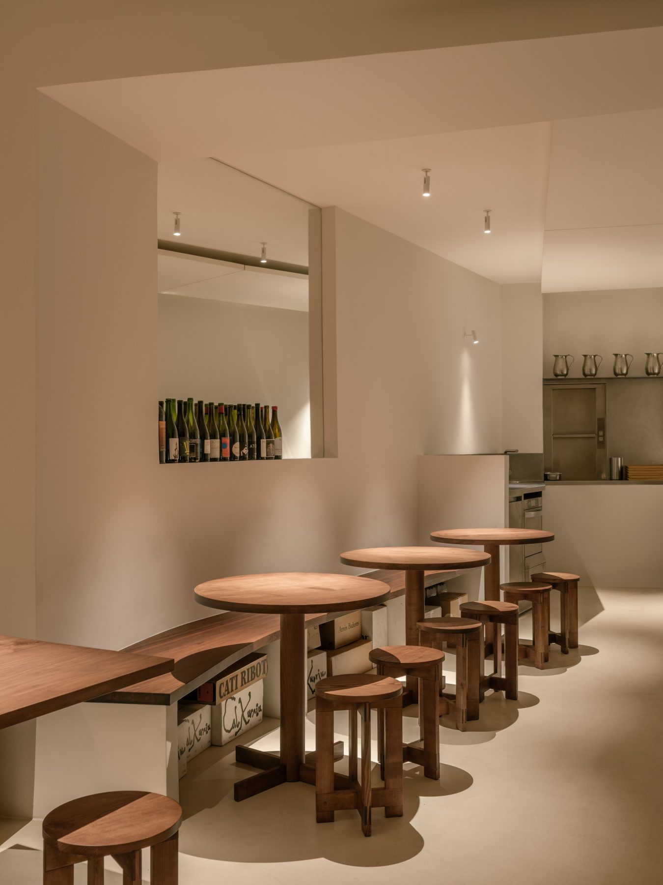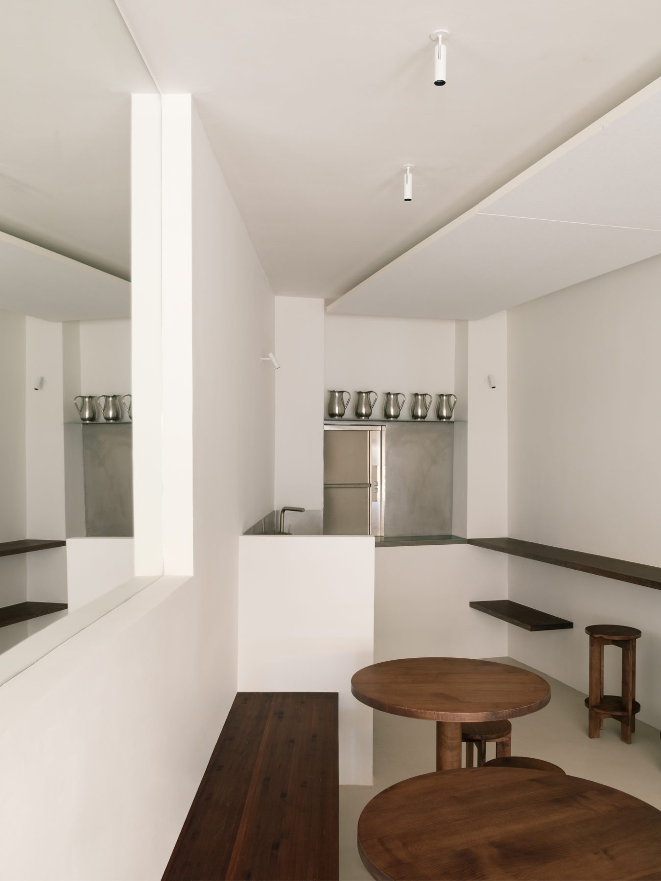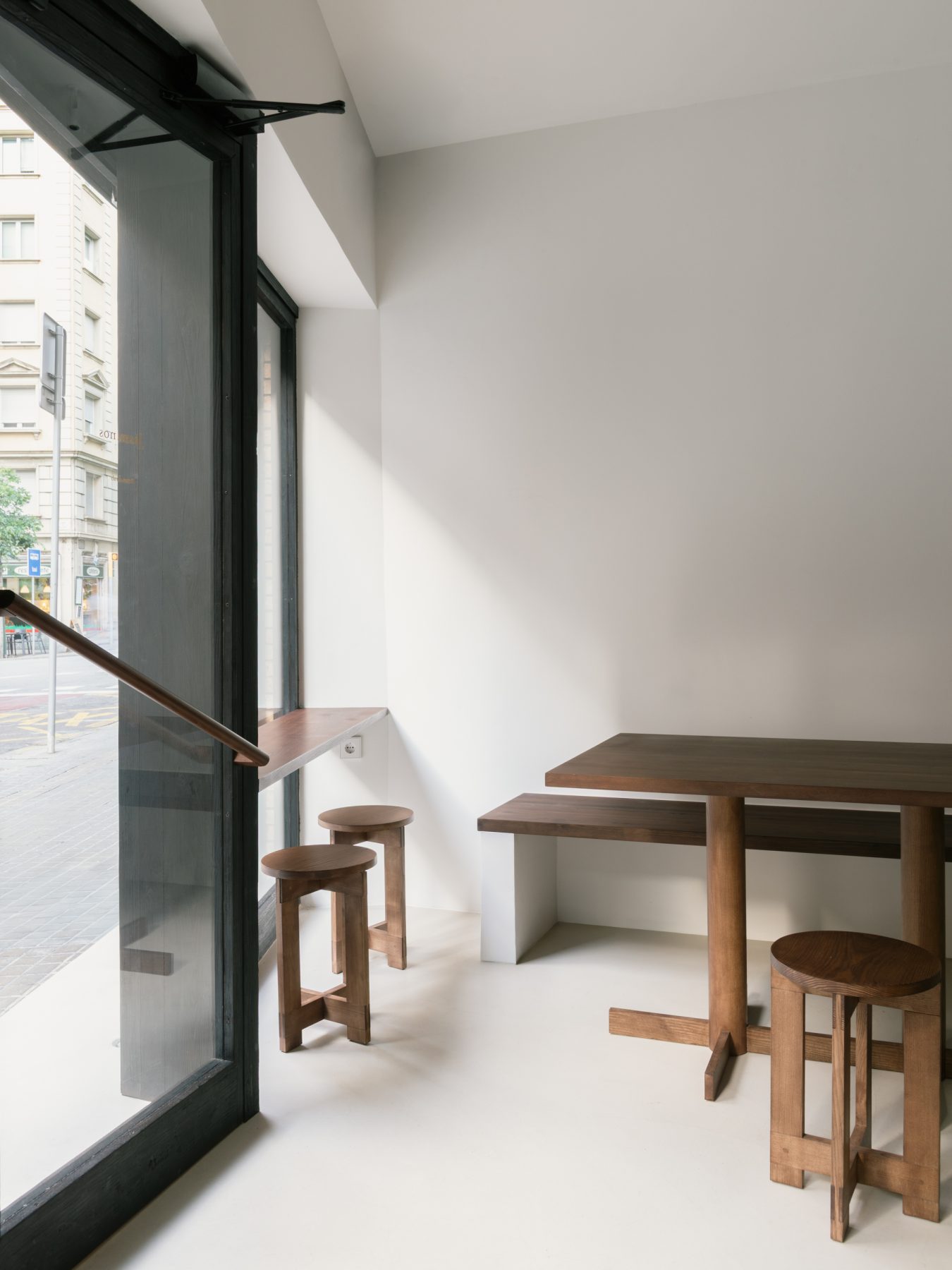 The furniture, composed of interlocking pieces, reacts to the solidity of bars and benches; the design of the tables and stools enters dialogue with the rest and creates a sequence of geometric forms visible from the shop window, inviting passersby in.
