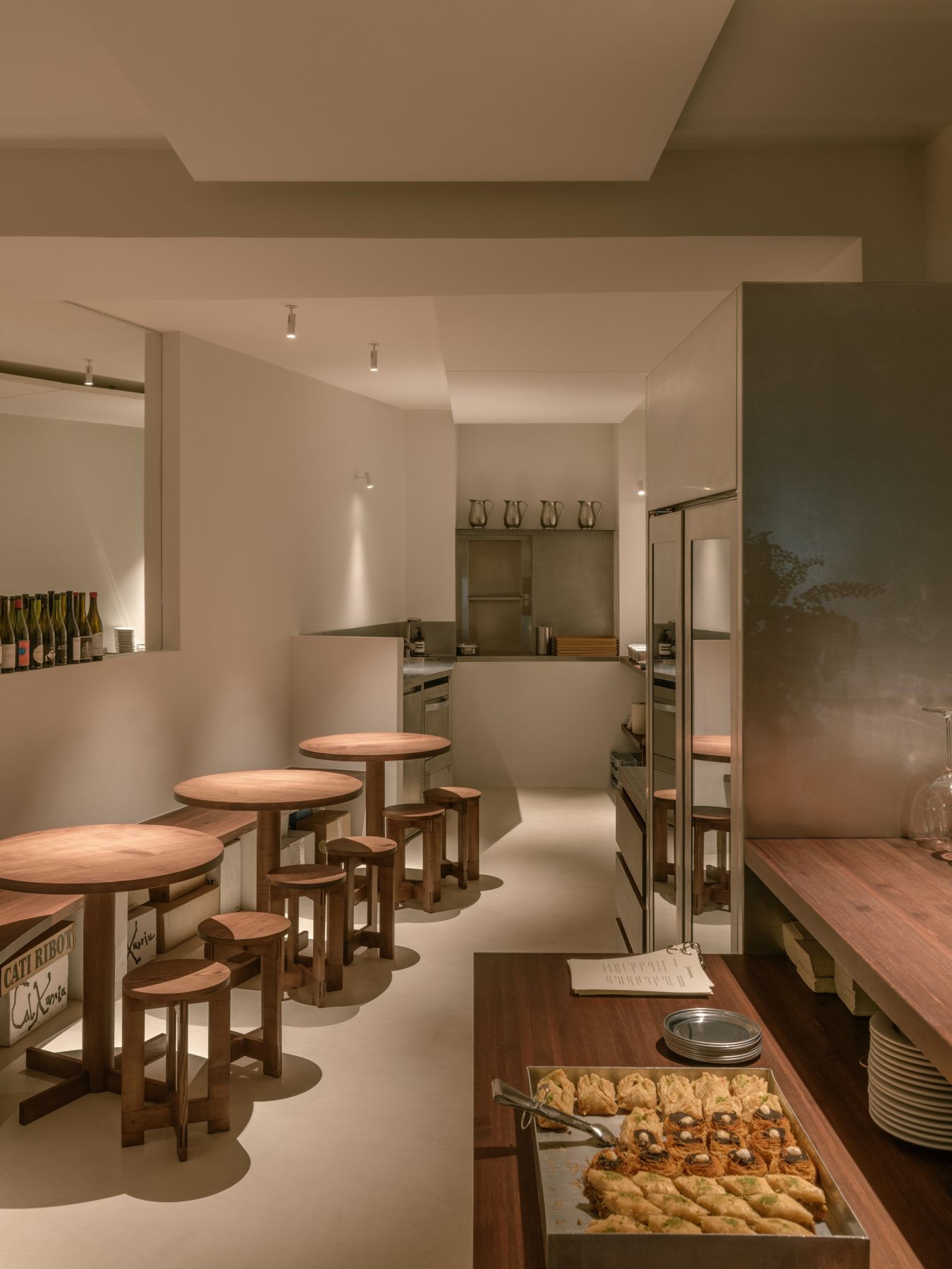This separation allowed the restaurant to be understood as a single space dedicated to eating, drinking, and sharing. Based on this premise, the design addressed the need by de-hierarchizing the space: removing any kind of frontality or central bar, and instead creating a perimeter occupied by a display, benches, a support kitchen, a dumbwaiter, a bar, a fridge, and an auxiliary table. All these pieces, connected in sequence, served one main purpose: to free the central space and make the tables and dinners the protagonists. The very meaning of a restaurant.