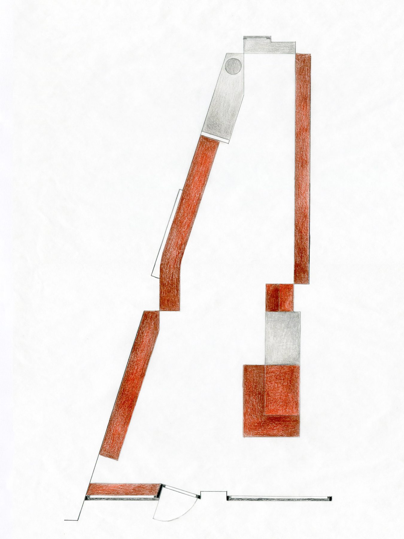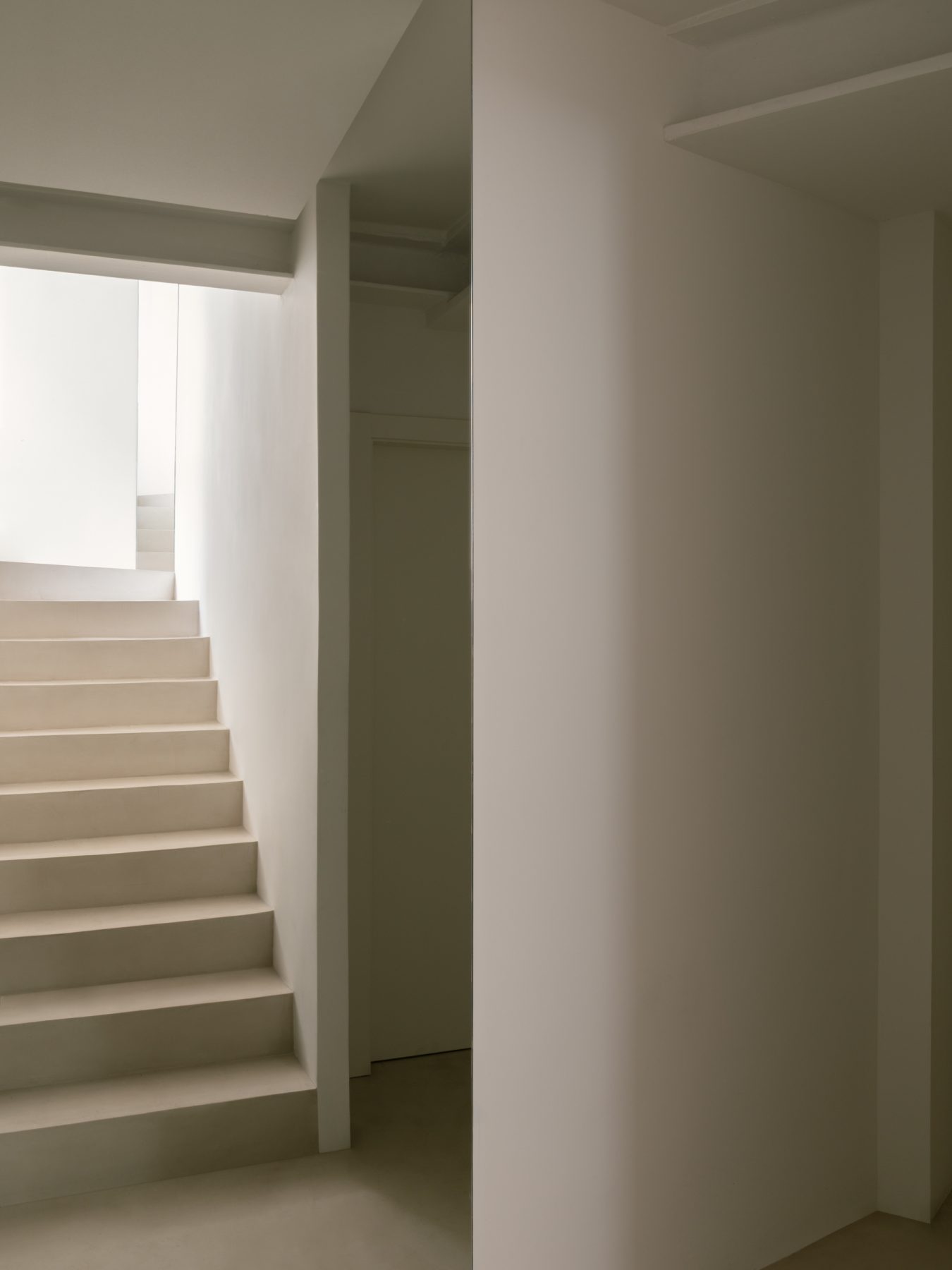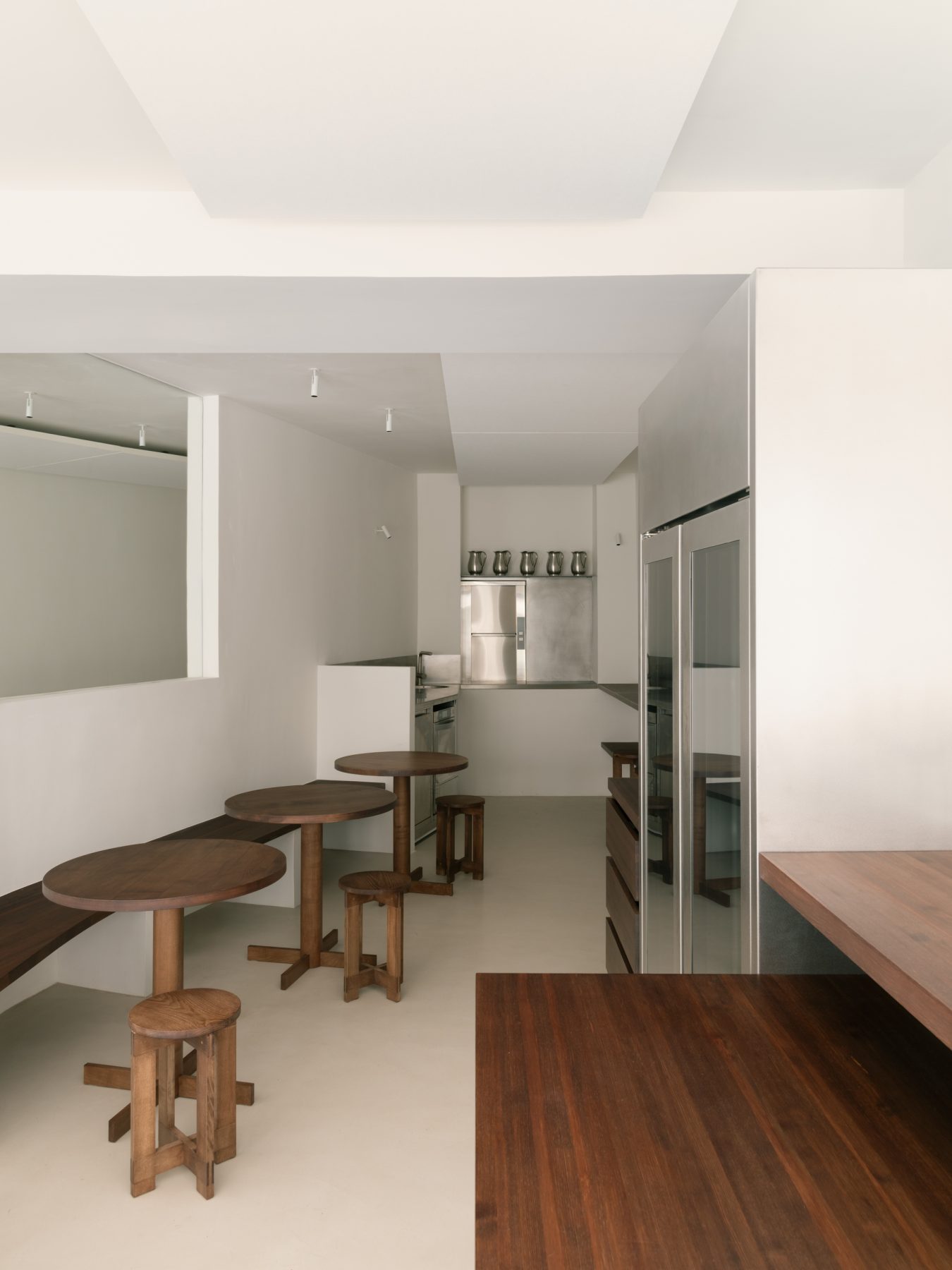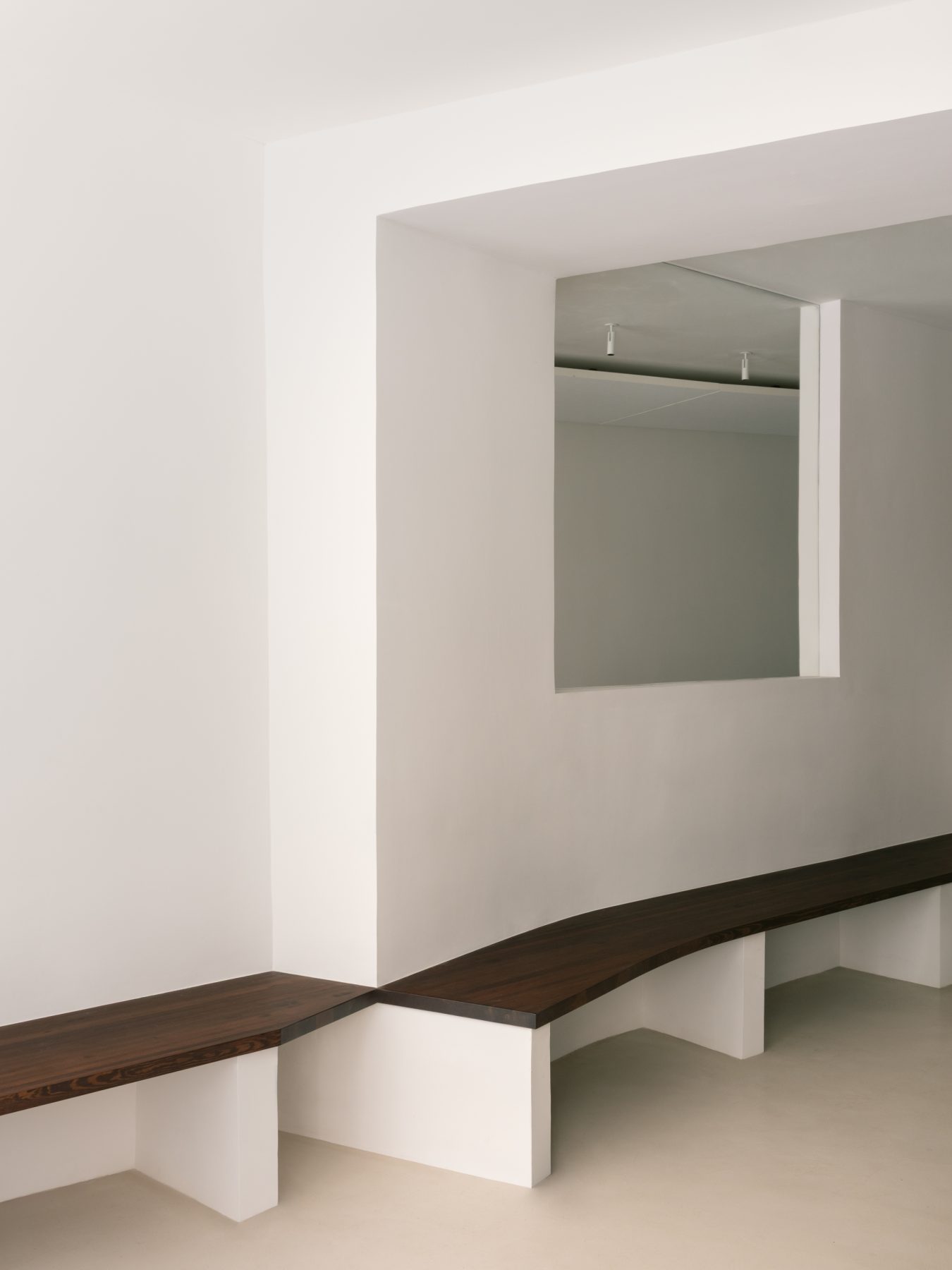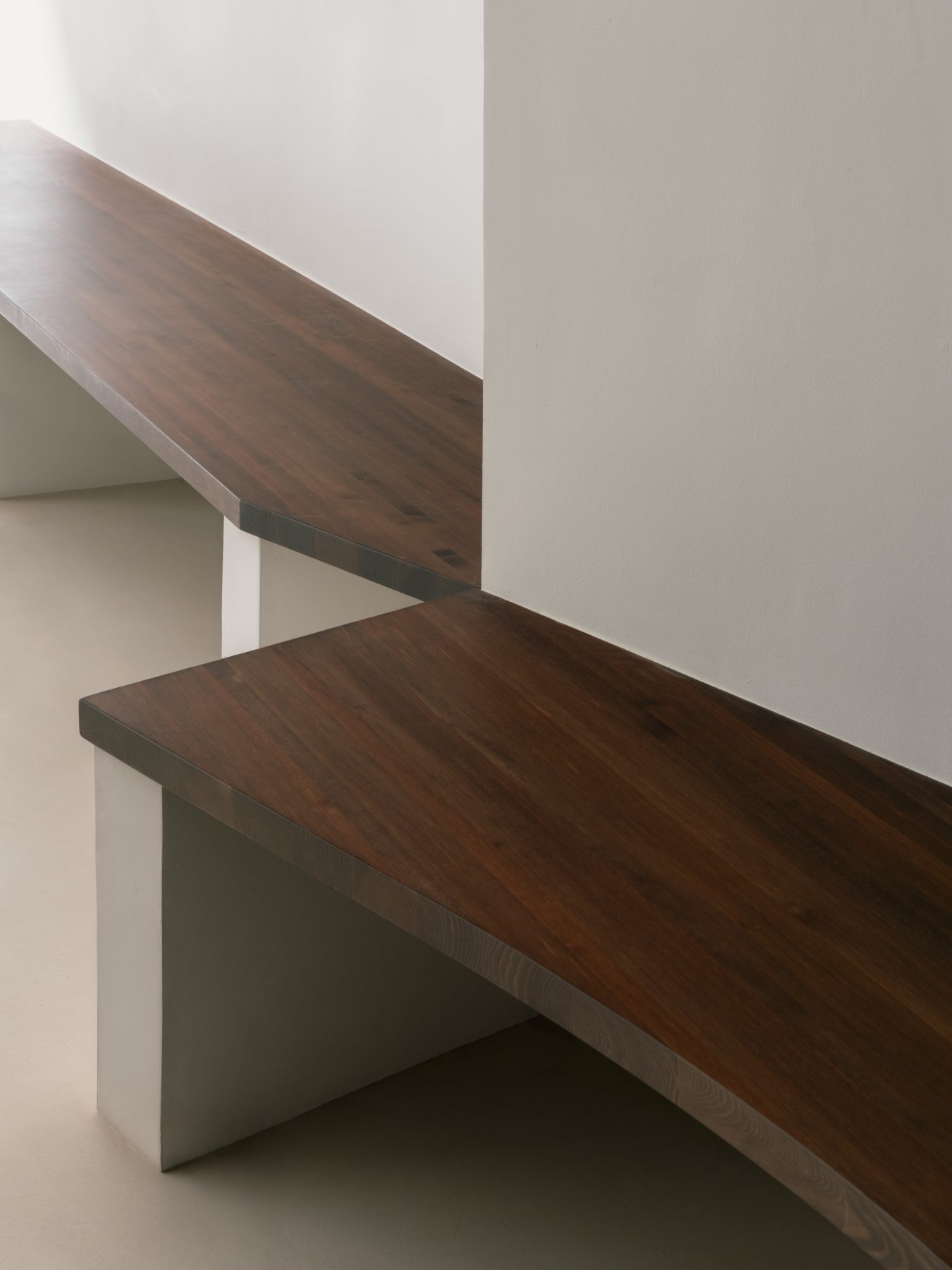 A bench running along the diagonal wall is gently broken at the corners with a soft, curved turn. Supports and dividers maintain a perpetual rhythm, as do all the heights: 45, 72, 94, and 120 cm. Lines of stability define a dimensional intent, so the entire space can always be transformed into a surface for eating or sitting.