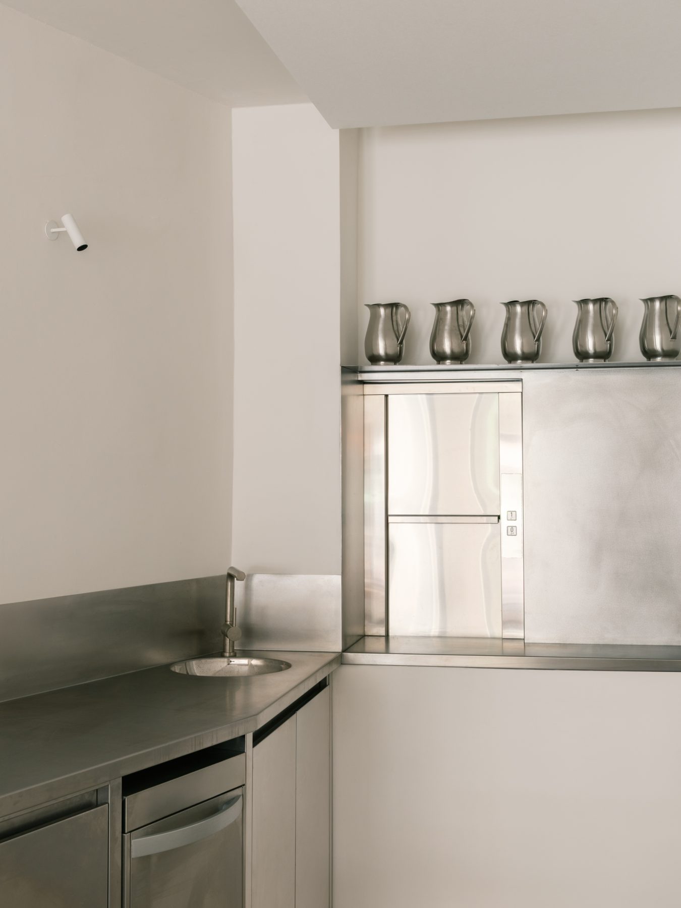 Historically, most restaurants concealed the kitchen, and this was also the case here. The kitchen, located in the basement, disappeared from the ground floor space: the area for the diners.