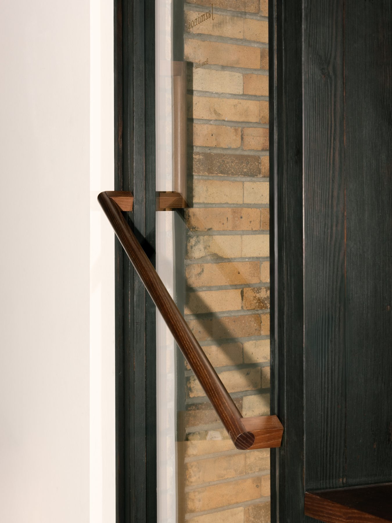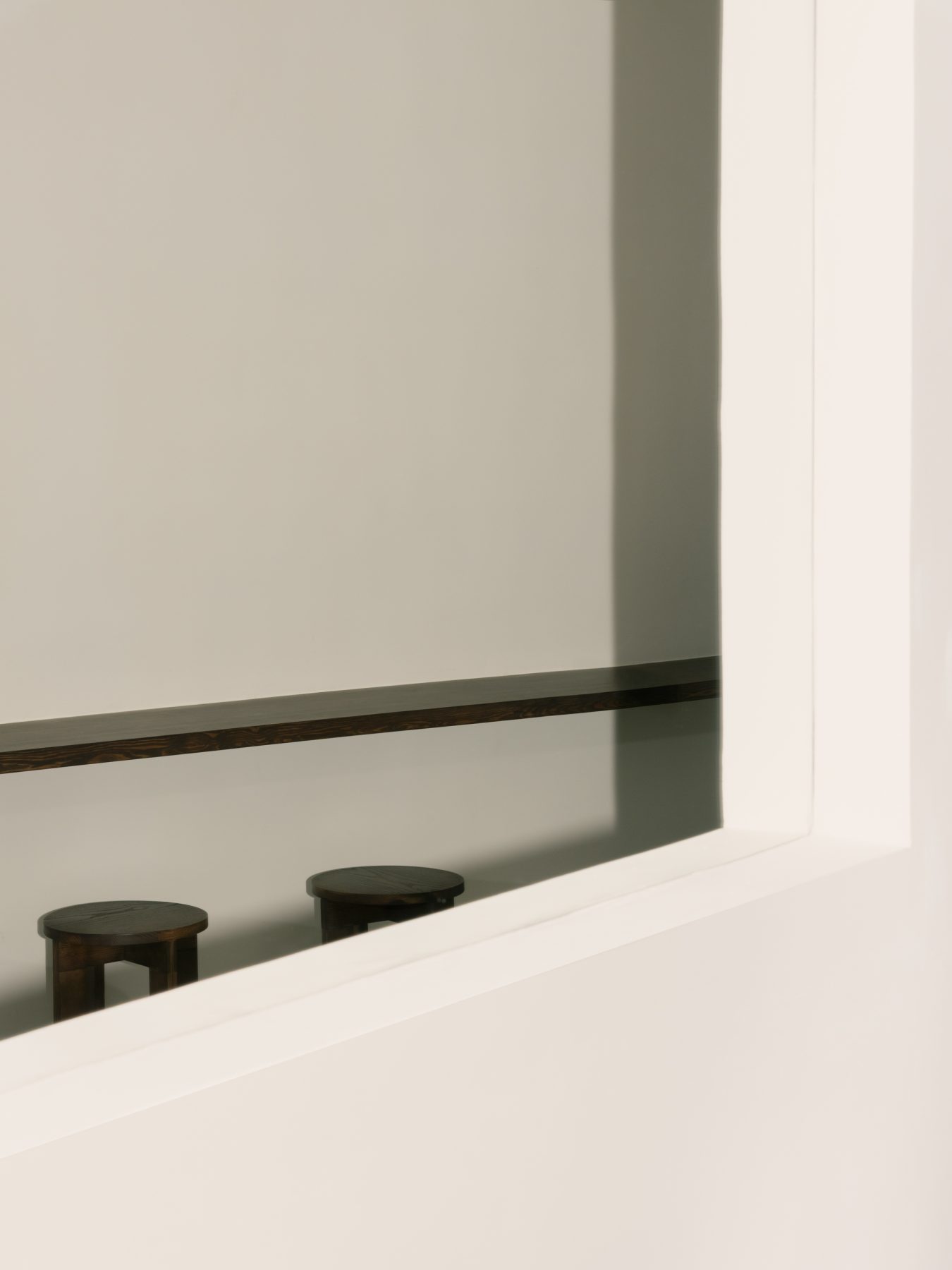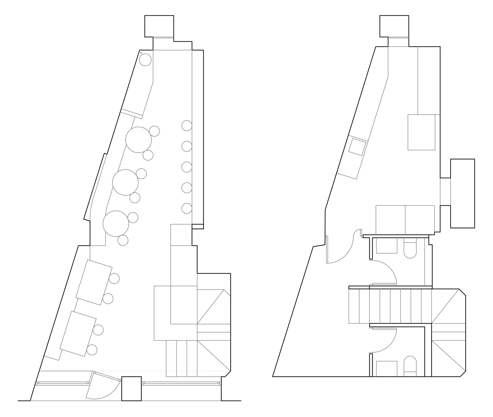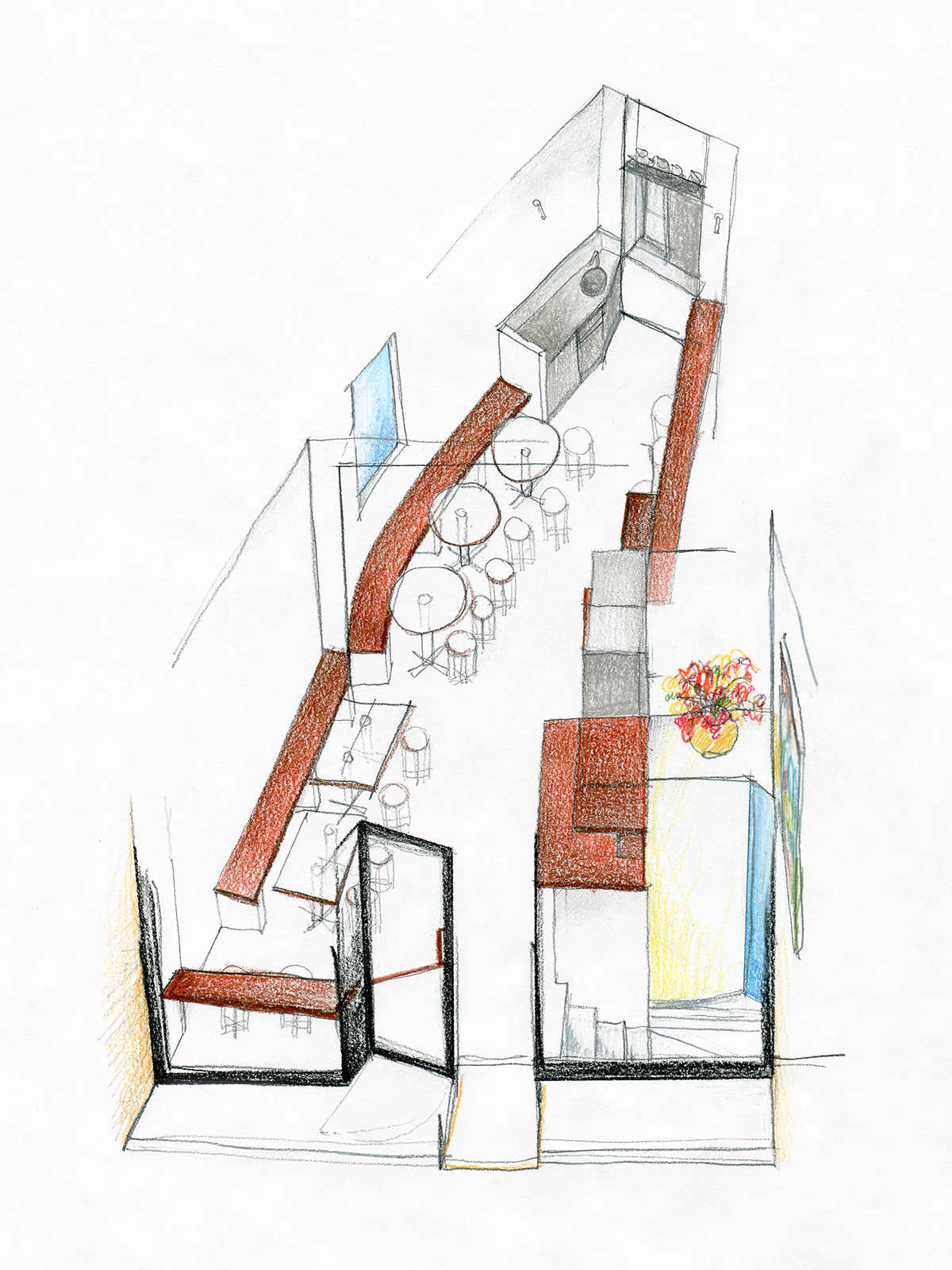 The trapezoidal shape of the space invited playful engagement with angles: from the two large façade windows, with the door disrupting their formal harmony, to every concave and convex turn.