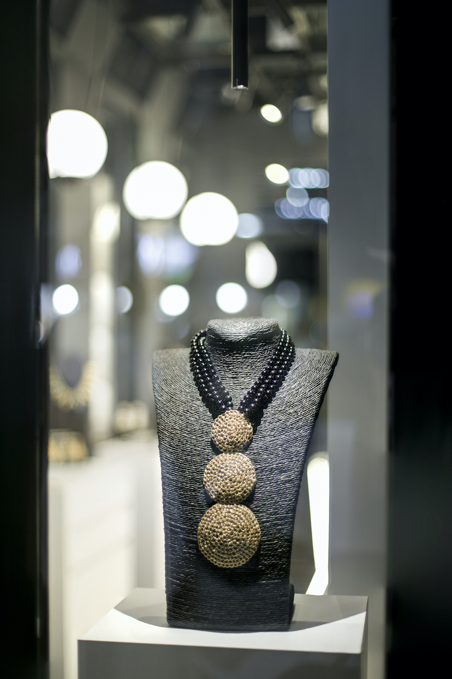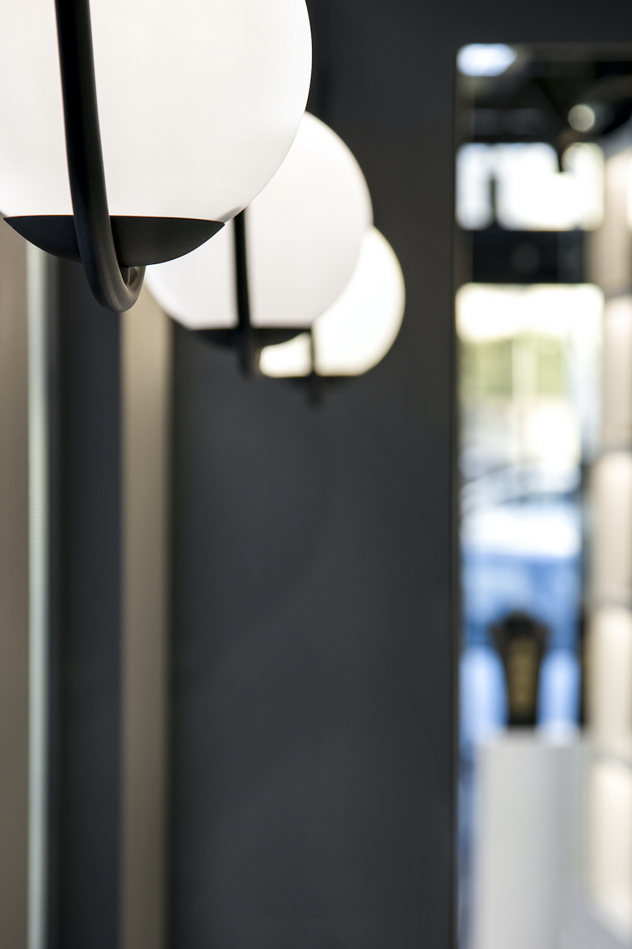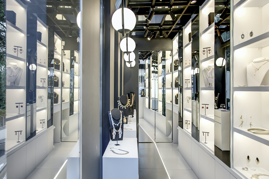 “The combination of mirrors in three directions enhances the game of illusions about boundaries. The mirrors are placed strategically: opposite the entrance to create a sense of depth, opposite the windows to reflect the light and to mirror the jewelry, and on the ceiling to merge the boundaries”, explain the interior designers.