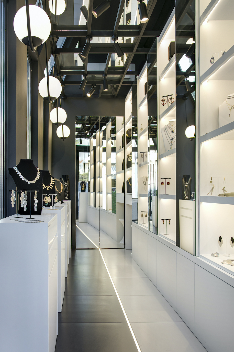 The mirrors, the lighting and the black-and-white contrast are the key features of the design. The jewelry store is split in two by a linear light running along the floor.