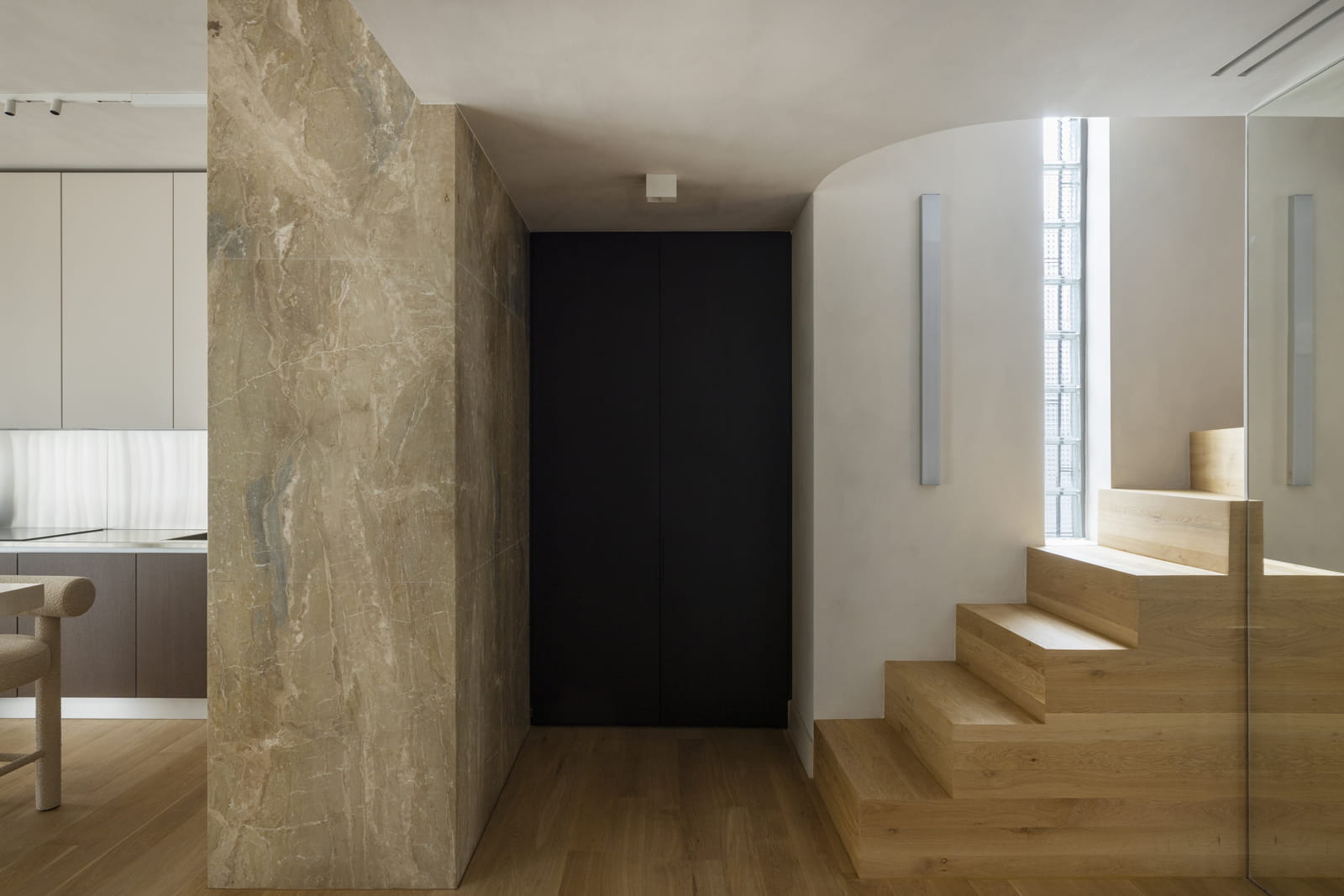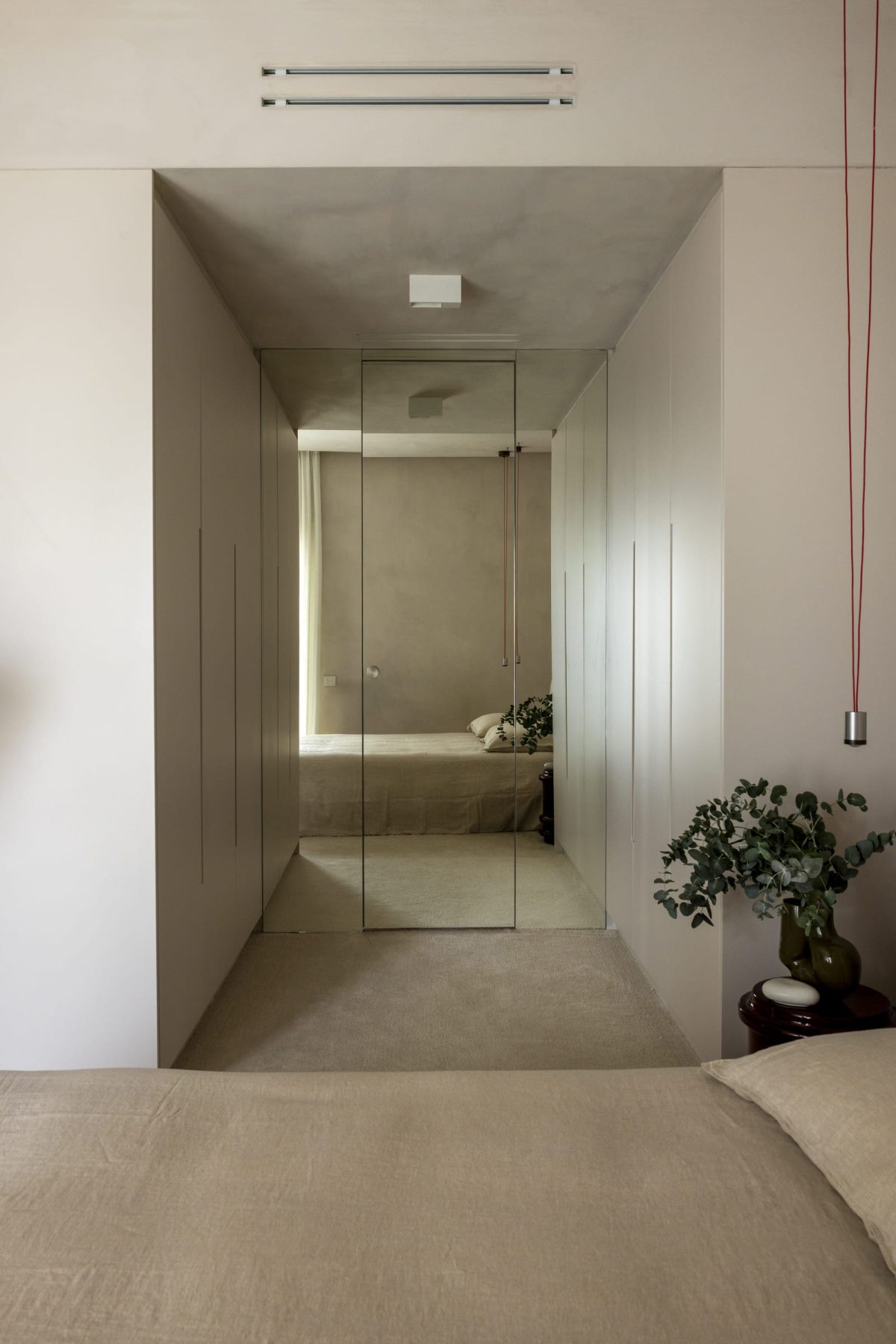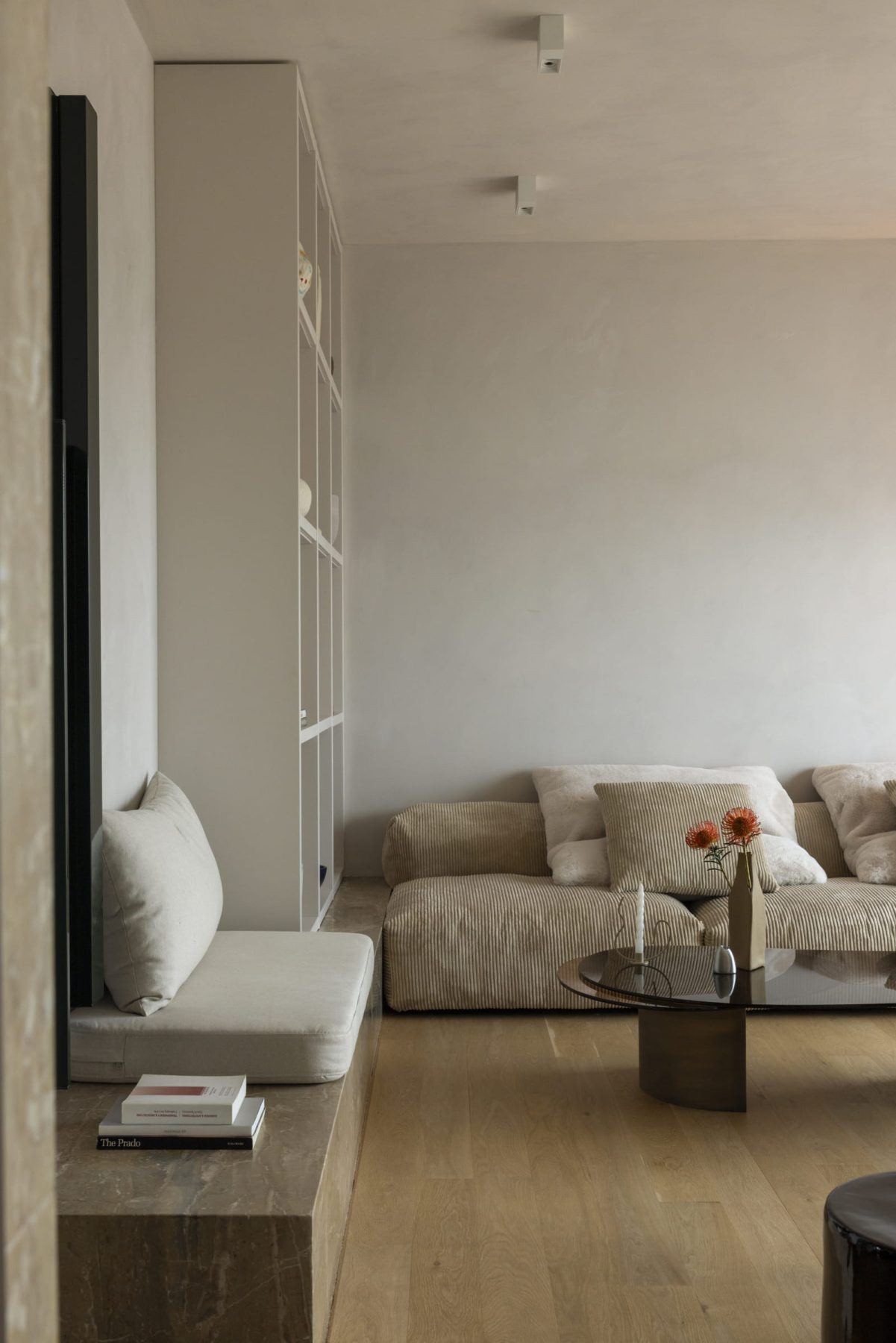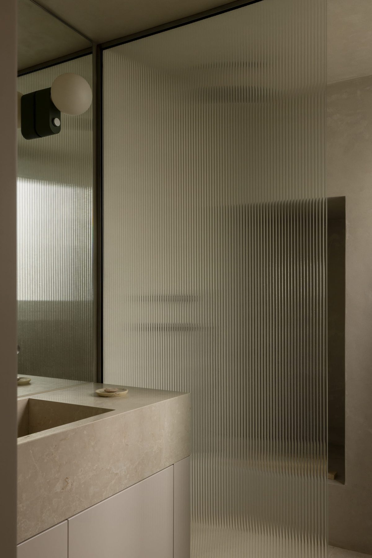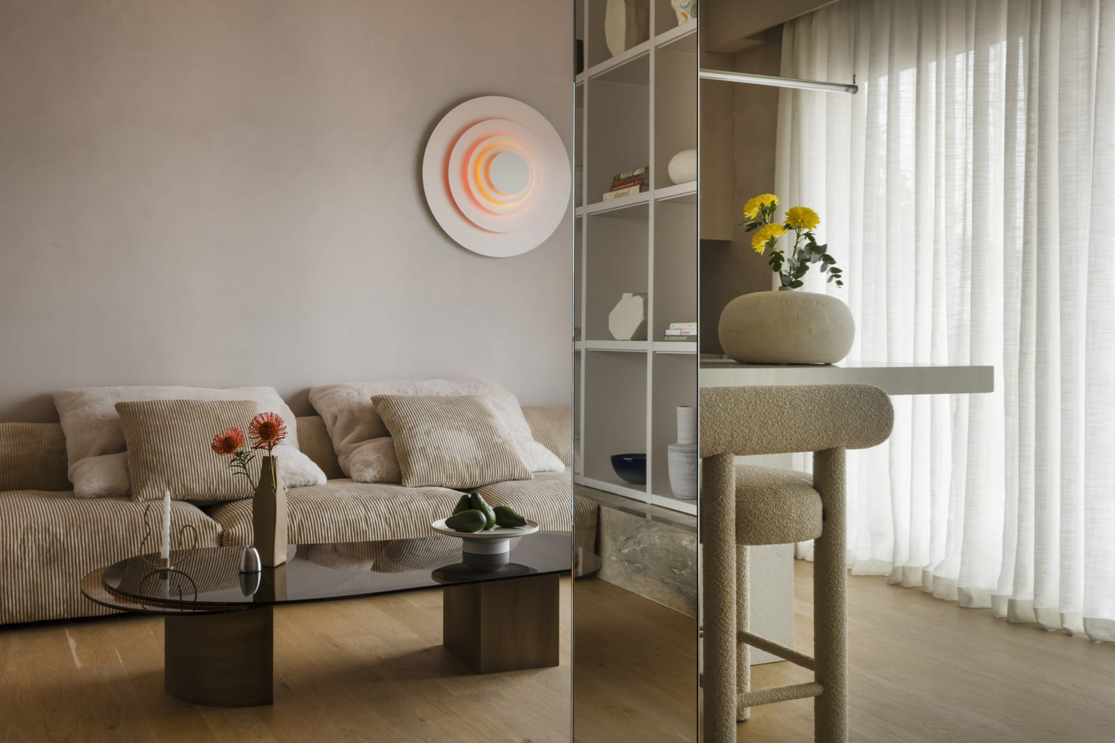 Η μετάβαση προς τους ιδιωτικούς χώρους σηματοδοτείται από μια ηθελημένη επιβράδυνση: η χρωματική παλέτα γίνεται πιο ήπια, οι υφές πιο μαλακές και τα αντικείμενα λιγοστά, δημιουργώντας ένα περιβάλλον ησυχίας που απορροφά τον αστικό θόρυβο.