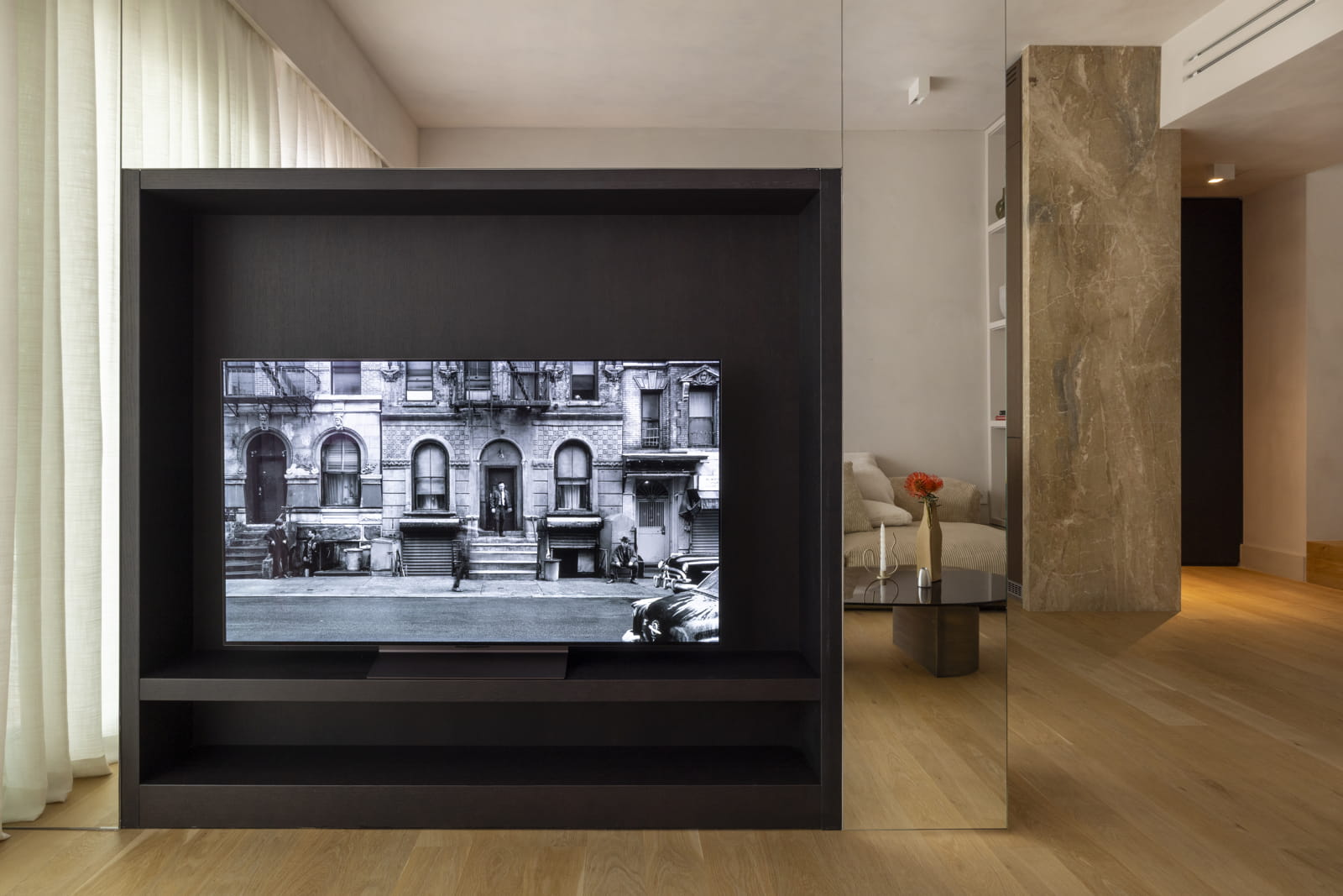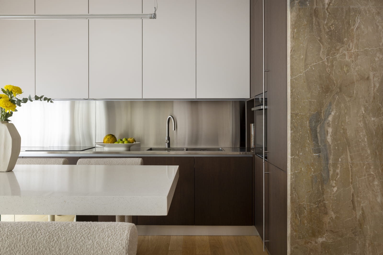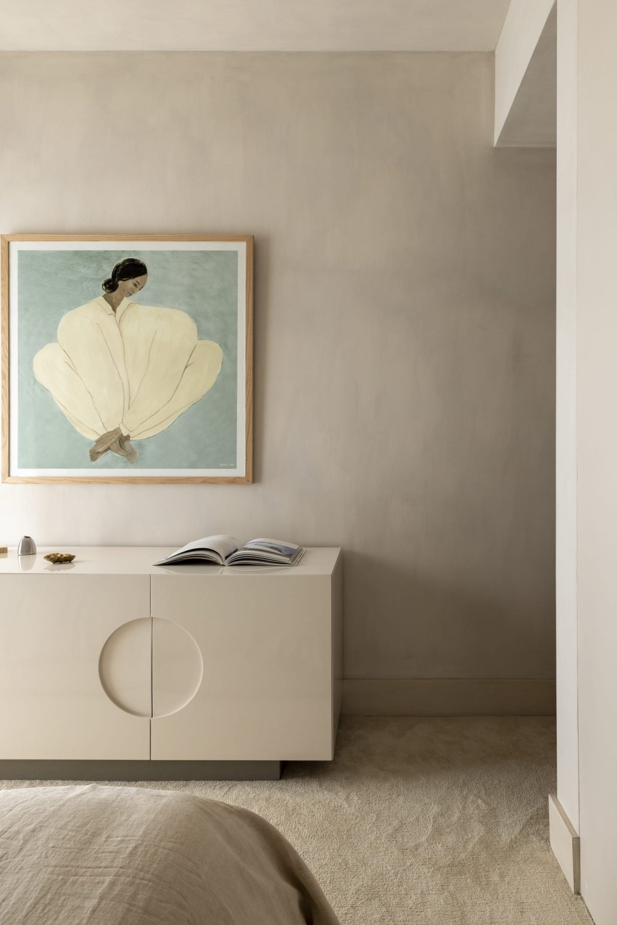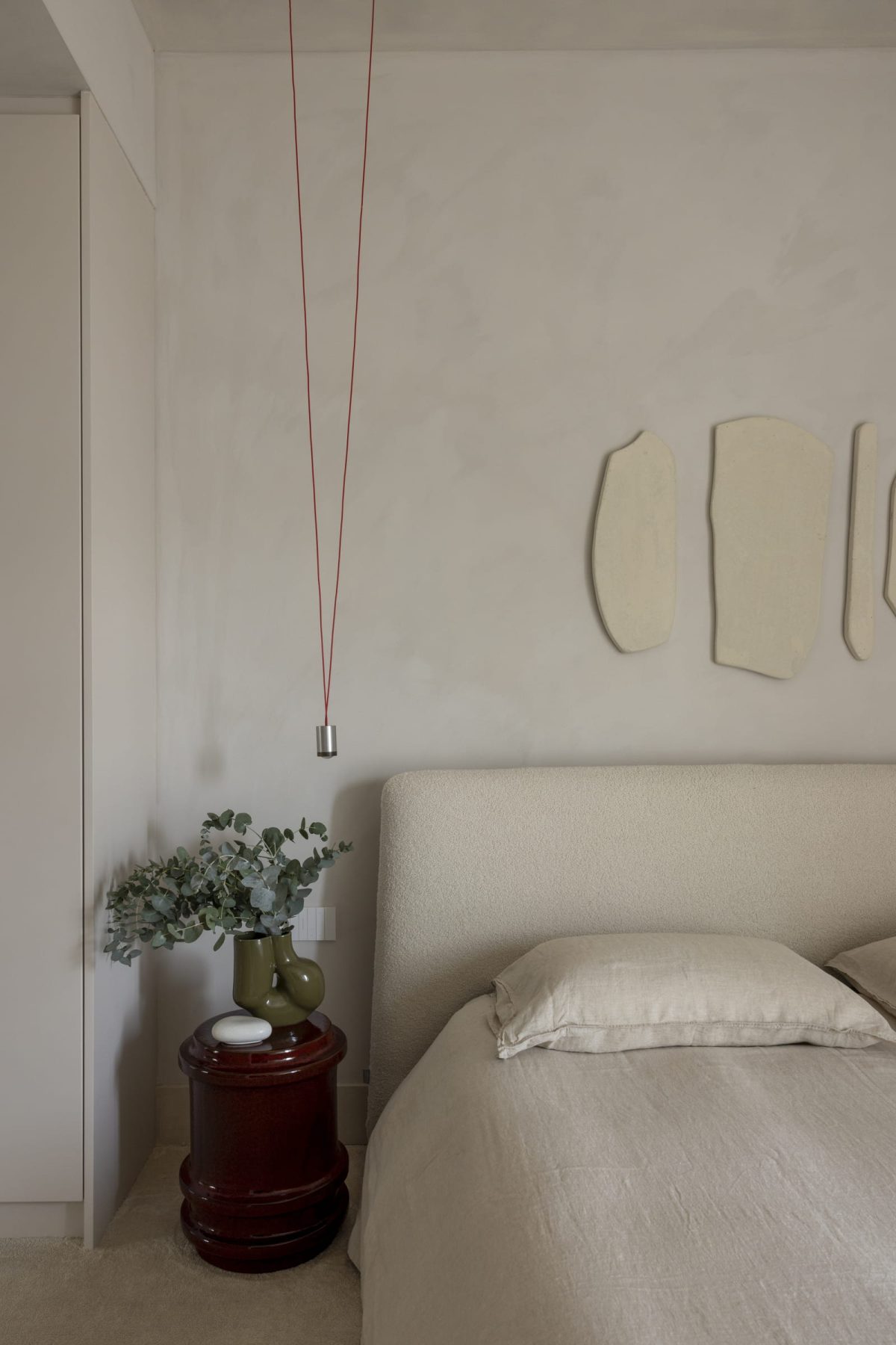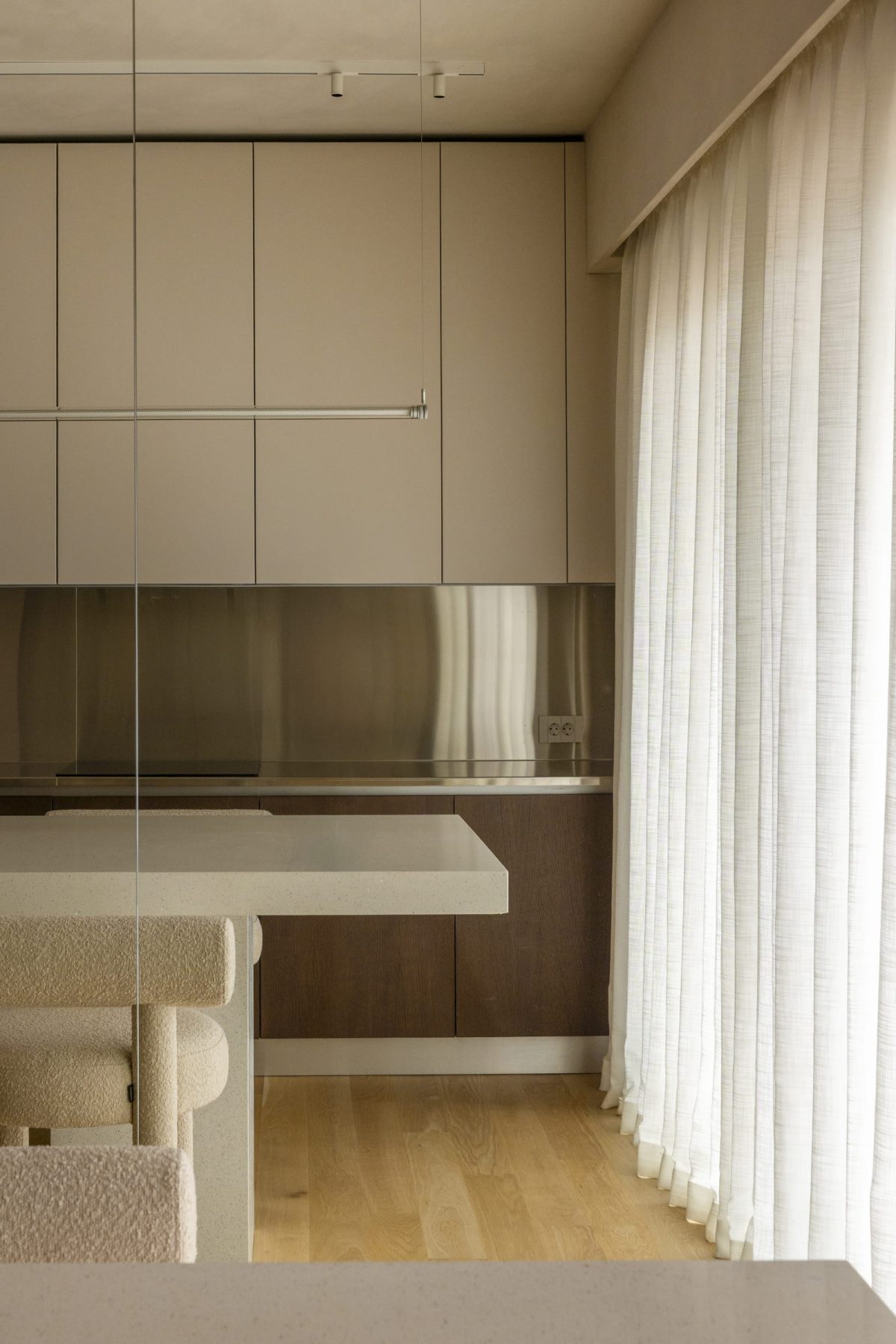 Η μετάβαση προς τους ιδιωτικούς χώρους σηματοδοτείται από μια ηθελημένη επιβράδυνση: η χρωματική παλέτα γίνεται πιο ήπια, οι υφές πιο μαλακές και τα αντικείμενα λιγοστά, δημιουργώντας ένα περιβάλλον ησυχίας που απορροφά τον αστικό θόρυβο.