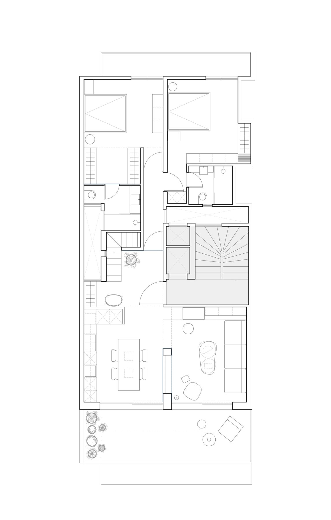 Η αρχική, κατακερματισμένη κάτοψη αποδομήθηκε, επιτρέποντας στον χώρο διημέρευσης να αναπτυχθεί στο μπροστινό τμήμα του διαμερίσματος και να αξιοποιήσει στο μέγιστο το ανατολικό φυσικό φως.