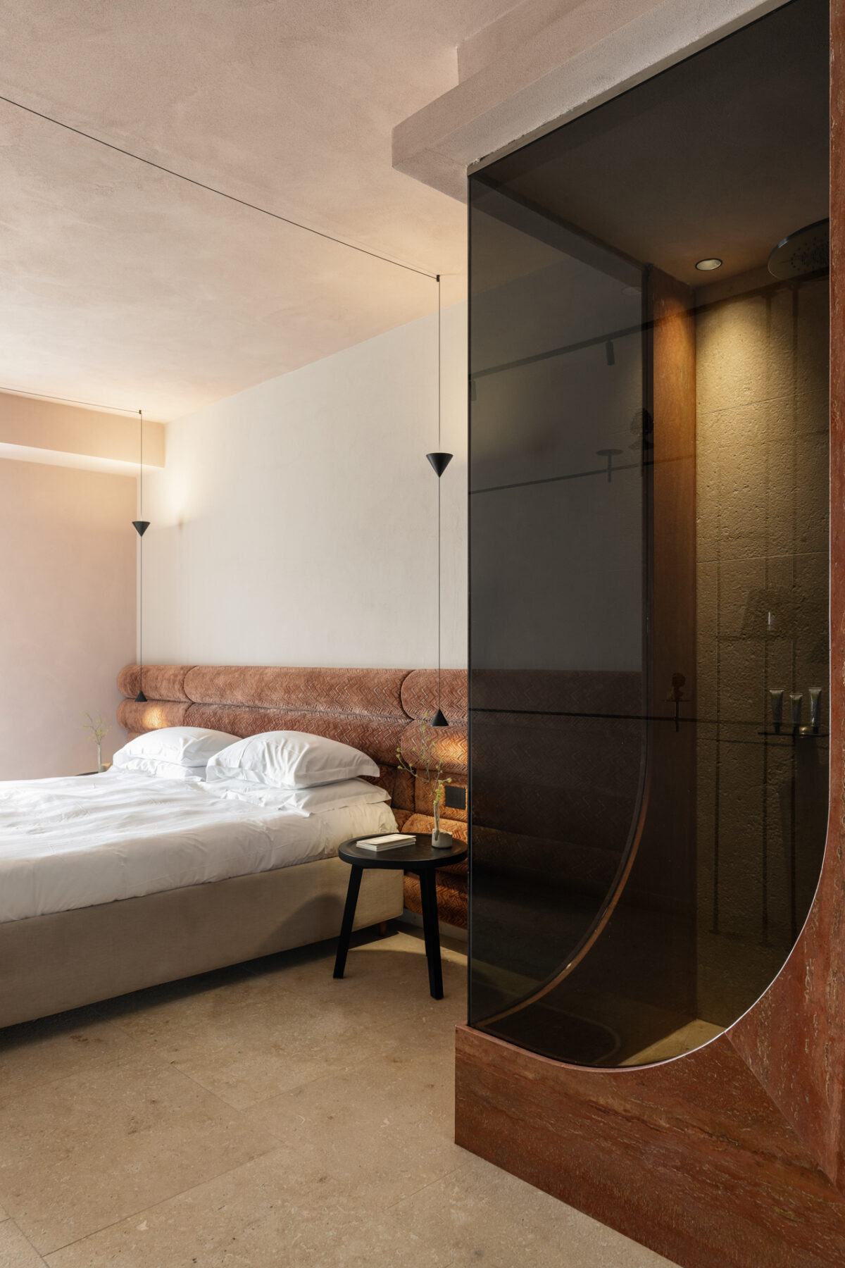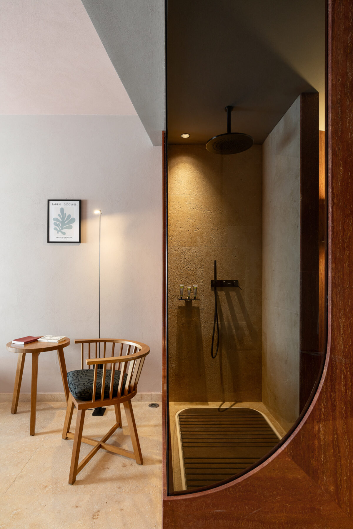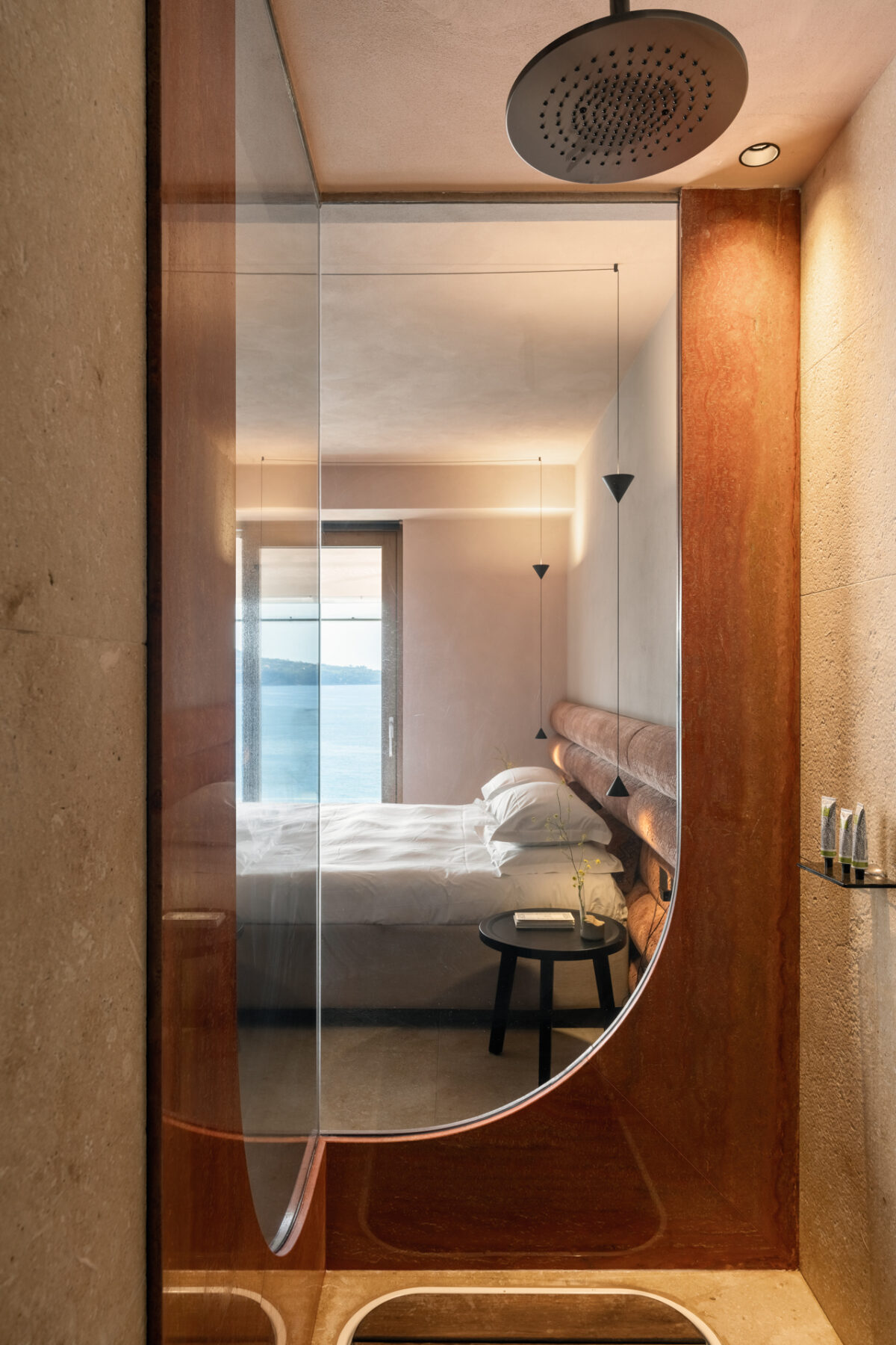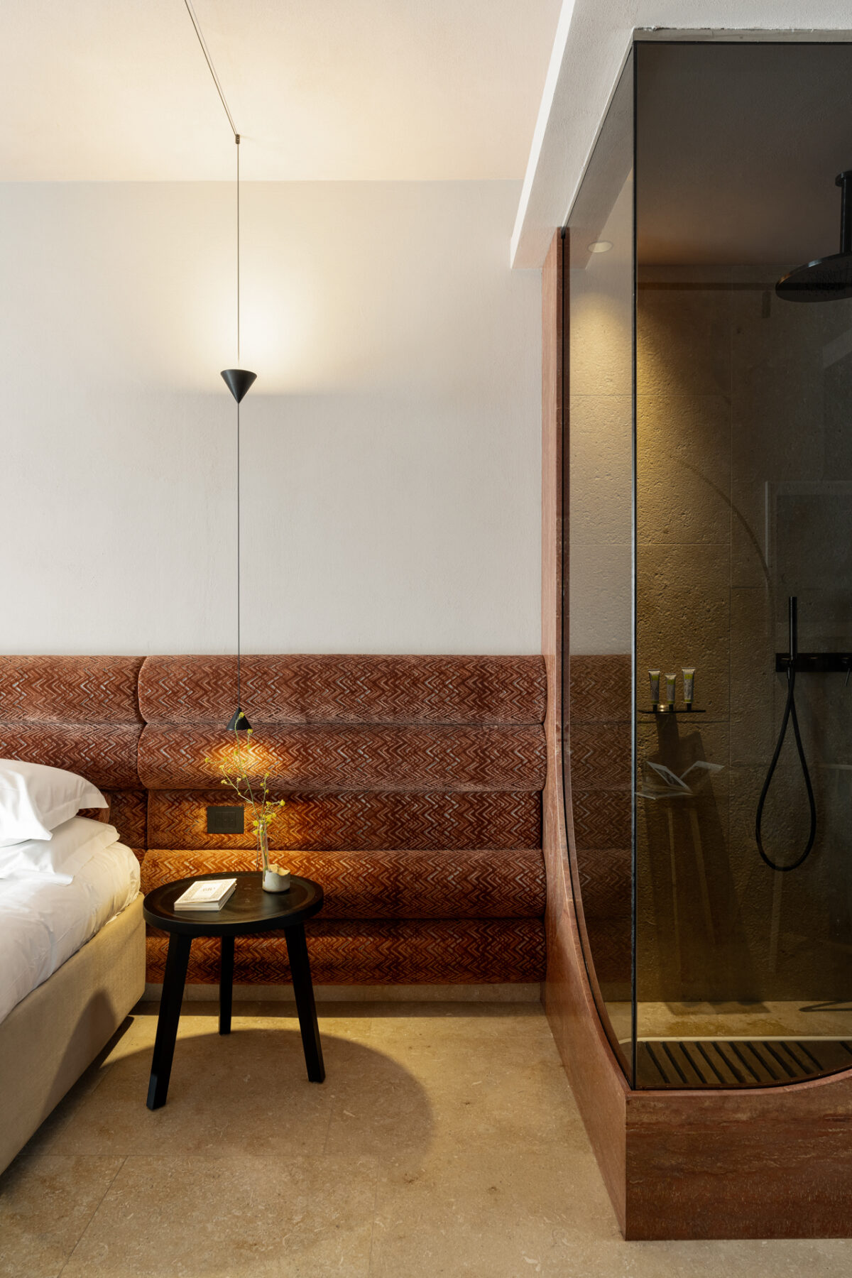 In the context of Laqua by the Sea’s rooms, as reinterpreted by the architect, a series of monolithic sculptural features in Persian red travertine take an uncontested and undisputed leading role in the design project seen in its entirety. These appealingly magnetic presences, all different yet featuring a common curved profile, create preferential visual perspectives and spectacular scenic backgrounds for the spaces expressly dedicated to elemental water and personal care – the shower area, the external whirlpool tub, and a corner with the free-standing designer basin – in a genuine ode to time taken back for oneself. The clear leading role taken by these areas within the restyling project further highlights the strong focus on well-being which has always been the driving force behind Laqua by the Sea and, more generally, all the Laqua Collection resorts.