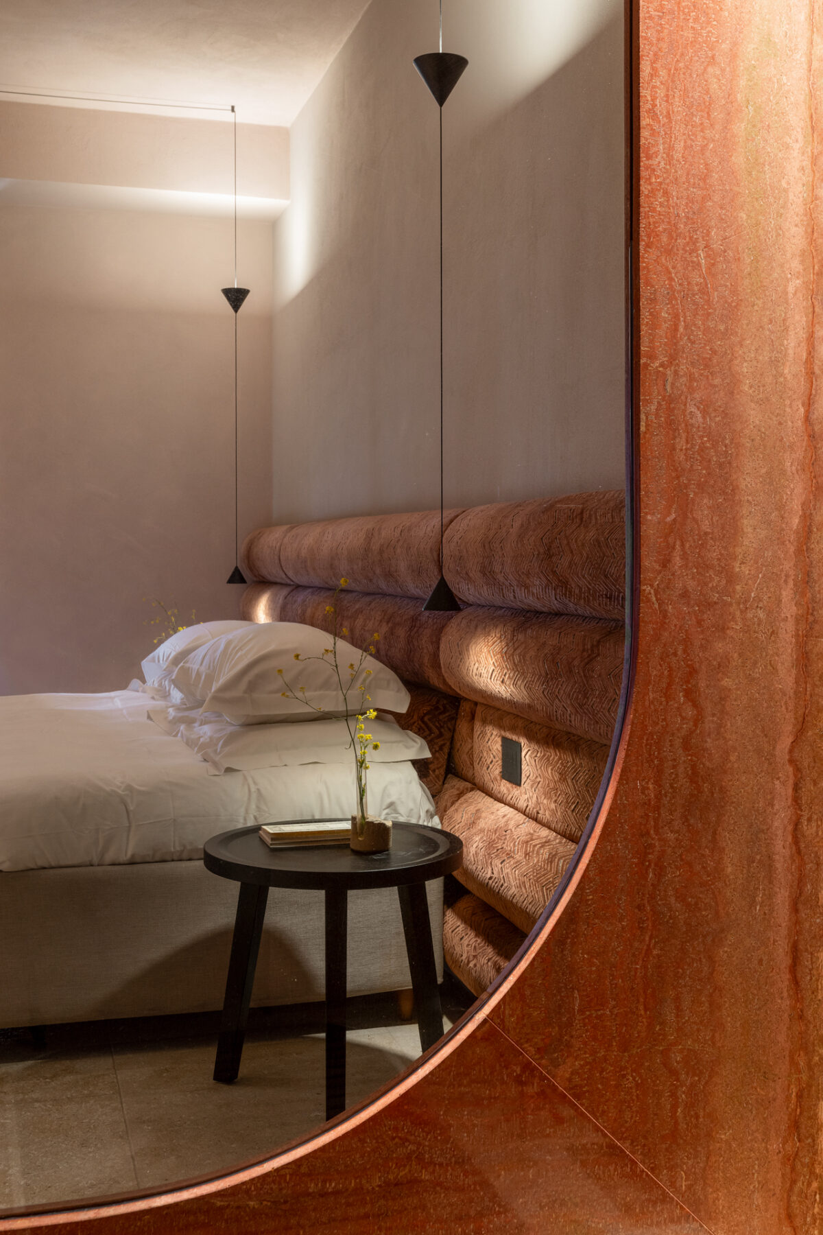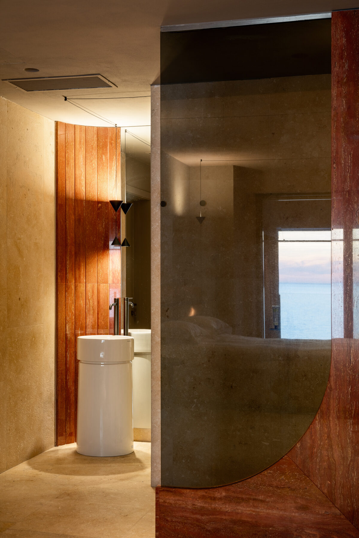 In open dialogue with the red travertine and its sinuous nature, padded and upholstered wainscoting, once again featuring deep curves, enhances a further sub-area dedicated to comfort and relaxation. Gracefully moulded, and once again a deliberate homage to the waves and their ever-changing ripples as they meet the breeze at sunset, it extends in sculptural fashion along the wall, where it defines and encompasses the sleeping area. The bed itself, located at the far end of the room and emphasised by a dedicated ceiling lighting system, thus becomes a fully fledged and privileged vantage point from which to fully enjoy the beauty which pervades the surrounding landscape.