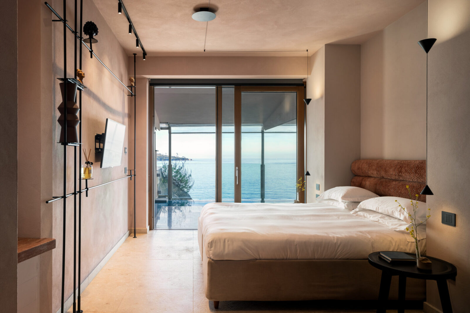 Right from the first glance, the layout of each room appears to clearly extend towards the sea below, thanks to the imposing presence of a full-height glazed partition: this spatial component breaks down the frontal perspective and is immediately suggestive of the direct and constant dialogue with the sea, to all intents and purposes the magnificent and evocative presence of the surrounding landscape and context. The architect’s new design of the rooms is thus developed in full awareness of the iridescent dynamism of the perception of the environments and atmospheres, featuring a varied palette of colours which is continually evolving, ranging from the cold blues of dawn to the fiery reds of sunset.
