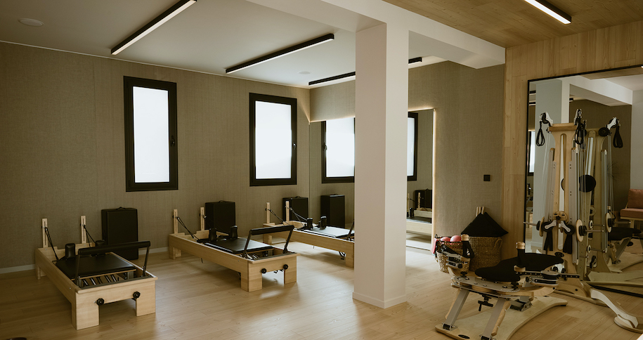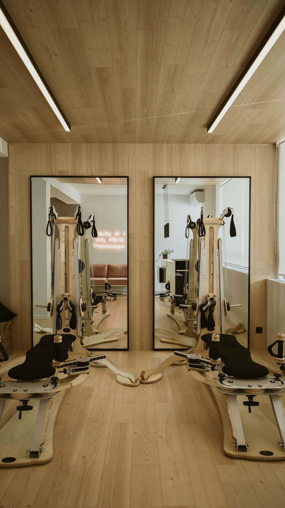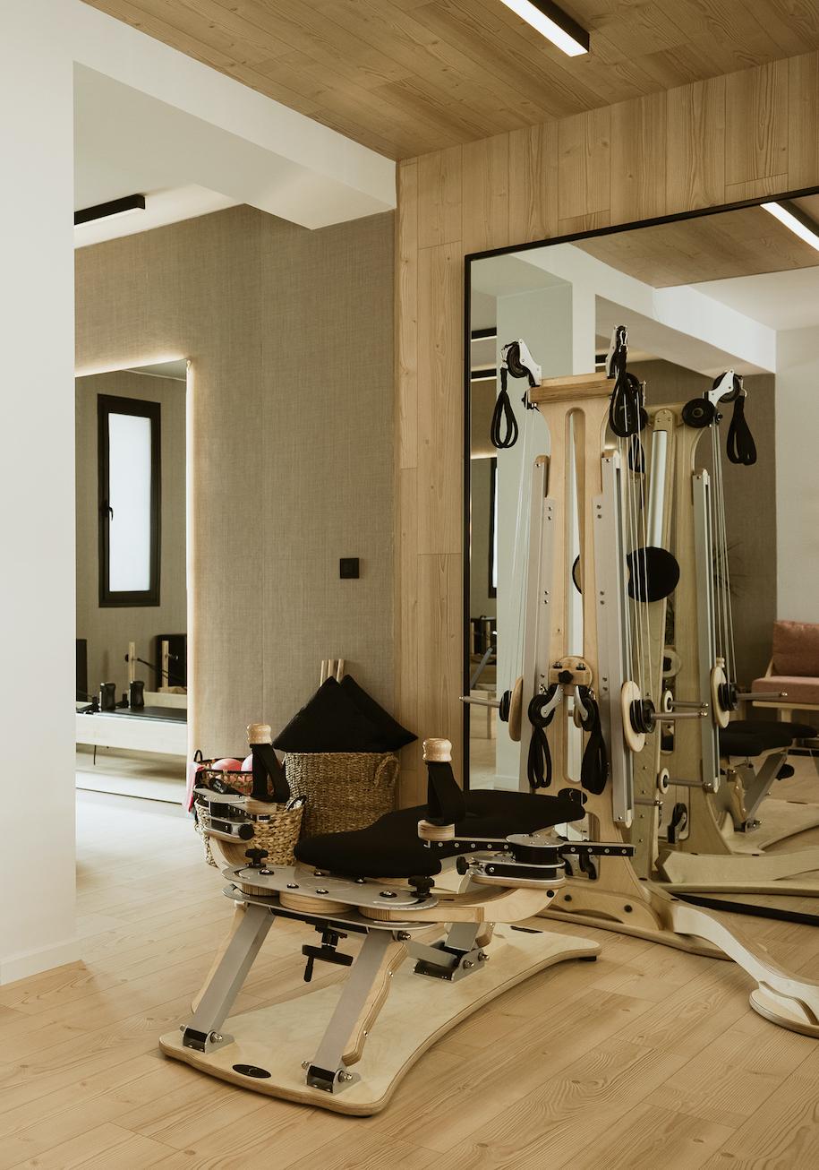 Τα μηχανήματα του Reformer ορίζονται από οριζόντιους καθρέπτες καθώς και μία επένδυση στον τοίχο όμοια με το ξύλινο δάπεδο του studio, το οποίο συνεχίζει σημειακά στον τοίχο μέχρι το ταβάνι, περιβάλλοντας τον χώρο του Gyrotonic. Αυτή η κατακόρυφη κίνηση αντιστοιχεί στην κίνηση που κάνει ο χρήστης κατά την χρήση του μηχανήματος, και ενισχύεται από τους μεγάλους κατακόρυφους καθρέπτες, χρηστικούς επίσης κατά τη διάρκεια της άσκησης.