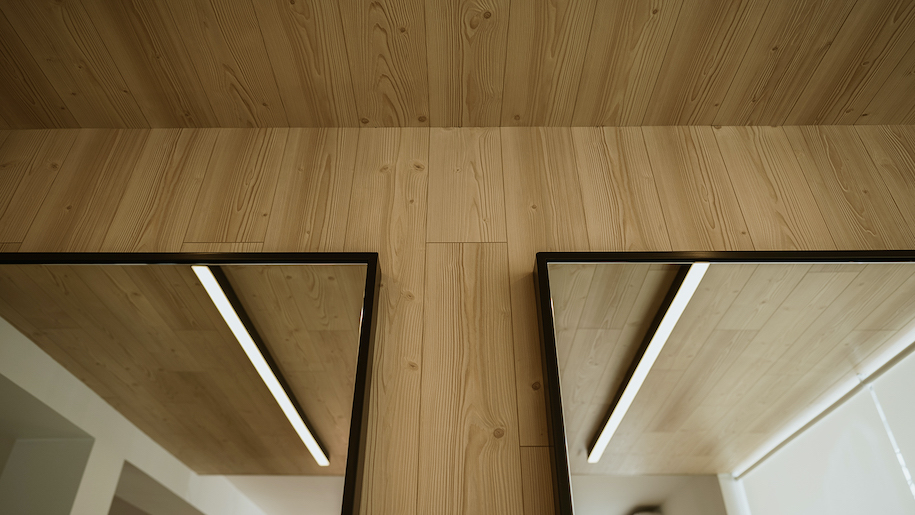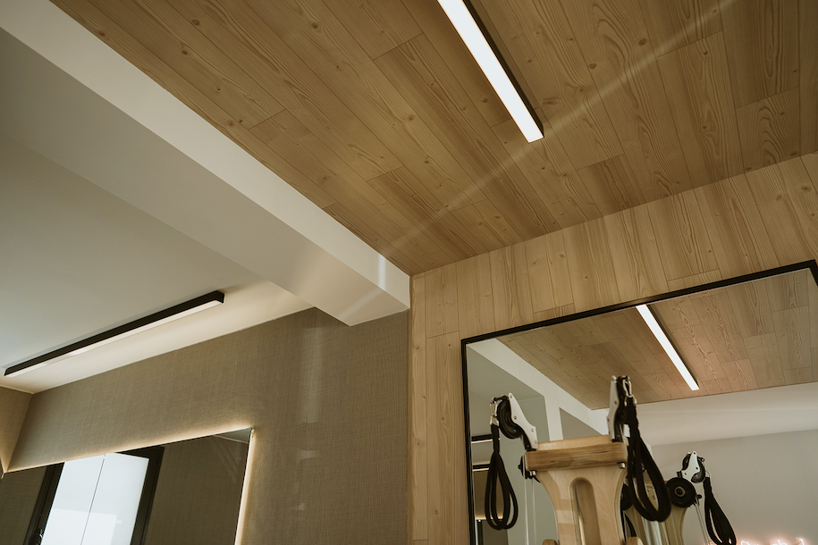This transition from the horizontal to the vertical complements the upright positioning and movement specific to the Gyrotonic’s users. Full height mirrors further accentuate this verticality and help users to properly perform their exercises. The spaces are then both unified and differentiated further by a bespoke yet cohesive lighting plan.