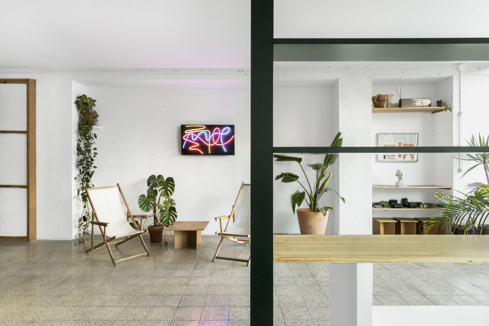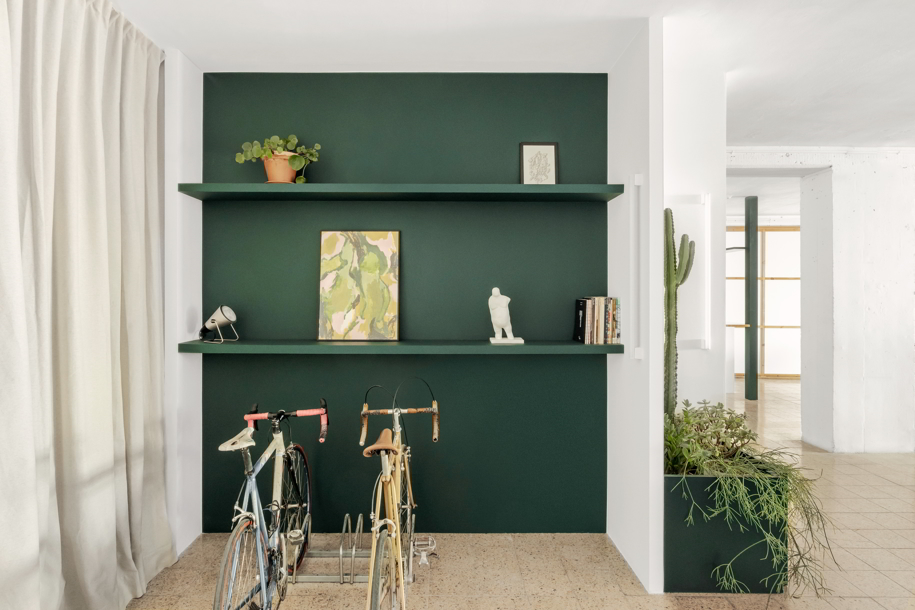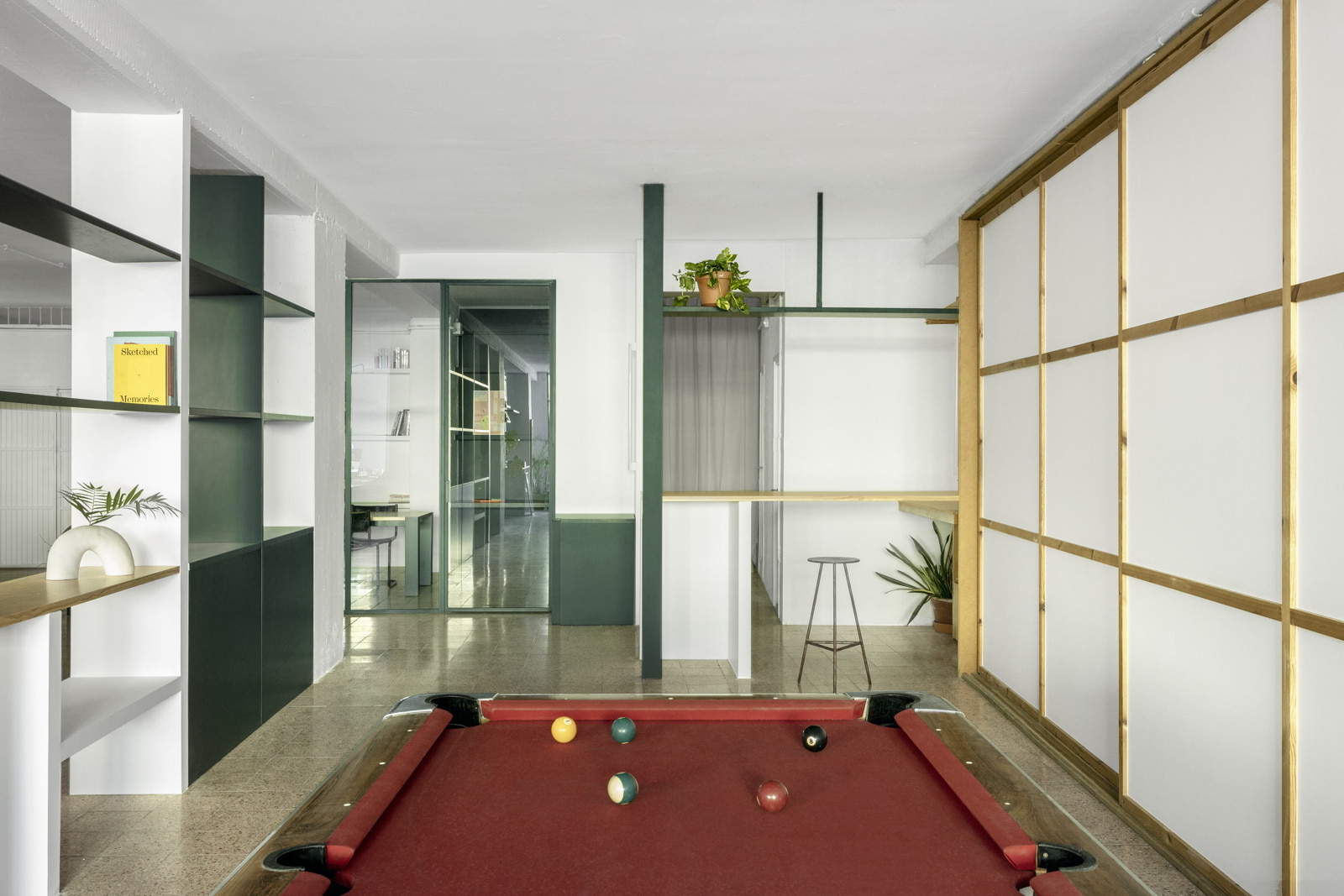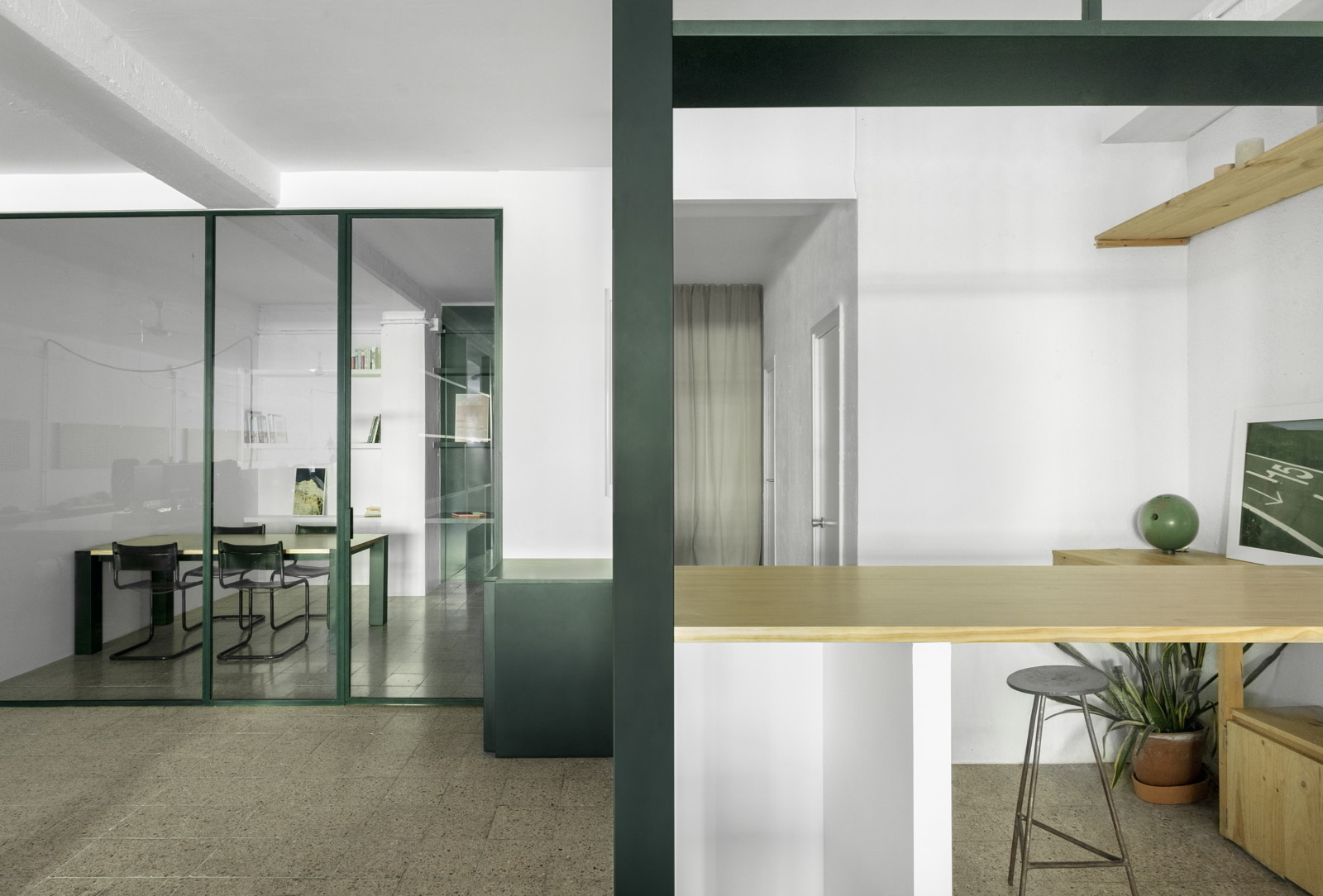 LAMA studio took over the redesign of Martes Studio audiovisual company office. This included the building of a new meeting room, together with an entrance hall and the design of different custom-made storage elements for the working space and some additional pieces for the break area. Solid elements in dark green, combined with pine wood boards, provide a distinct identity to the project.