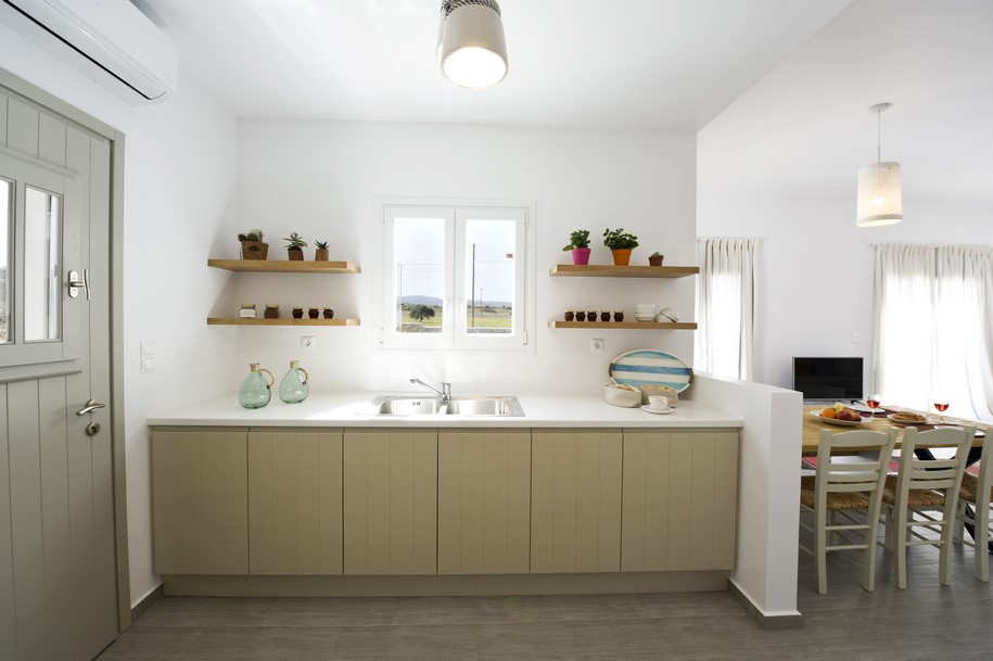 In both houses the office designed the kitchen area in such a way so as not to be directly visible from the living room but at the same time to be in close contact with it and the dining room as well, emphasizing on plenty of storage space.