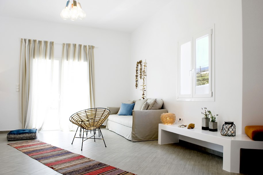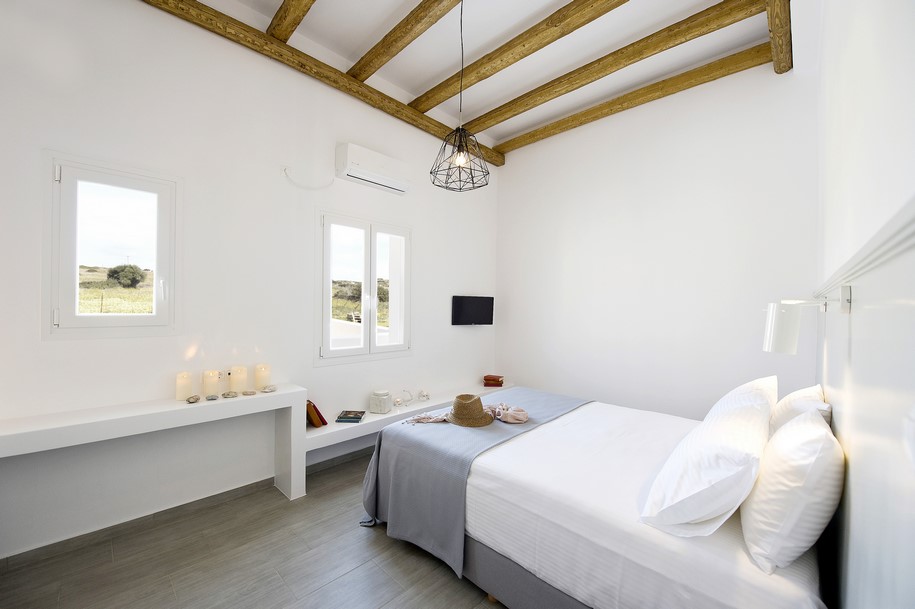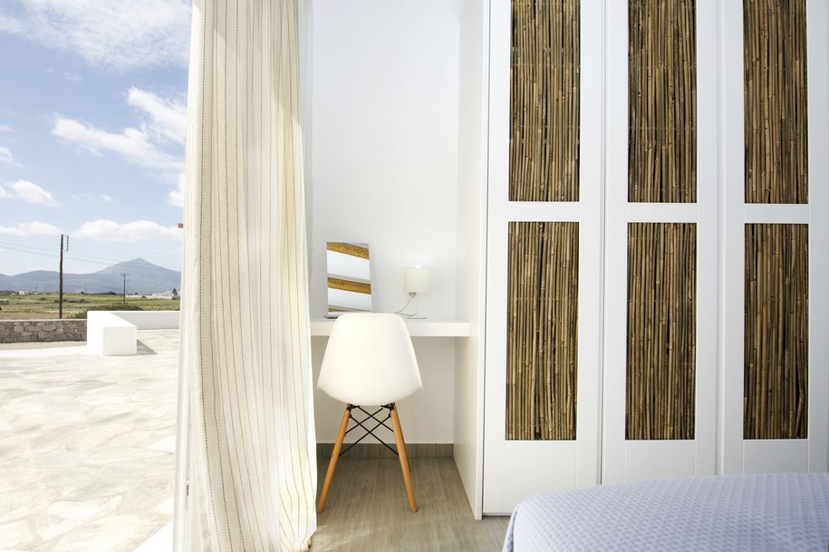 The chosen colour shades are all earthy and warm with the exception of the “touches” of blue which match perfectly the blue of the sea and the sky. All in all, the main goal was to serve the principles of contemporary design adapted to the cycladic architecture in order to satisfy the guests’ needs.