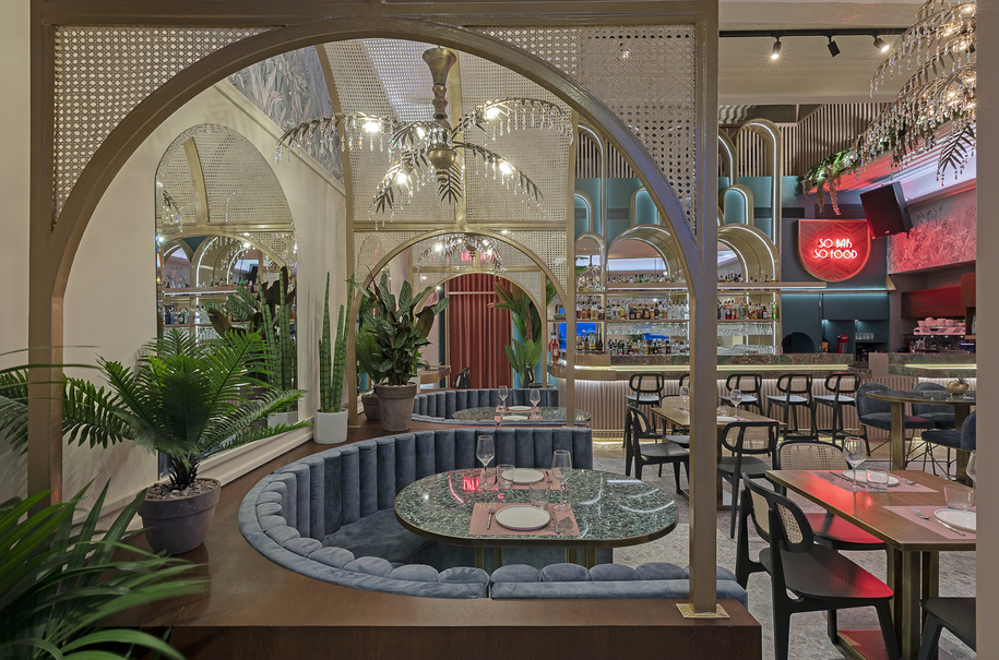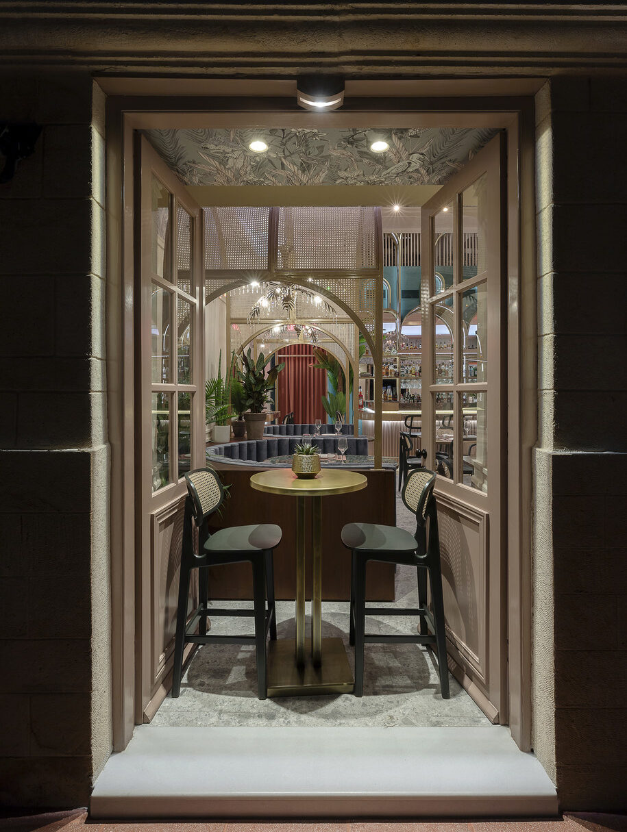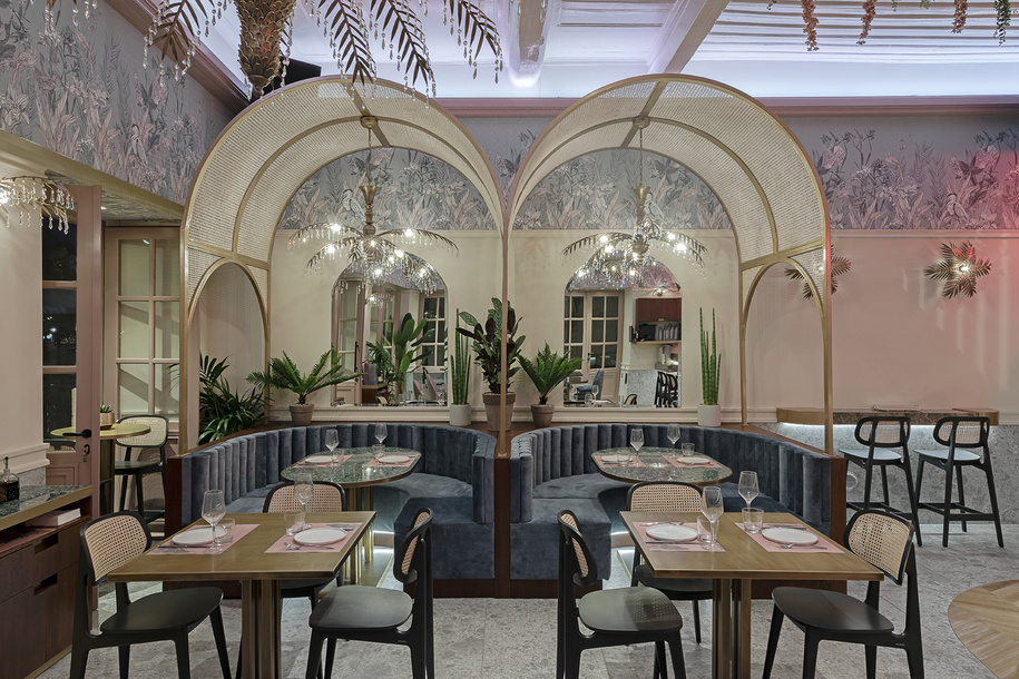 The sitting areas’ layout in the interior and exterior of Miralice consist of different setups, according to their respective use. The shape of the Art Deco inspired arches can also be found on the brass wicker structures covering the plush velvet dining area.