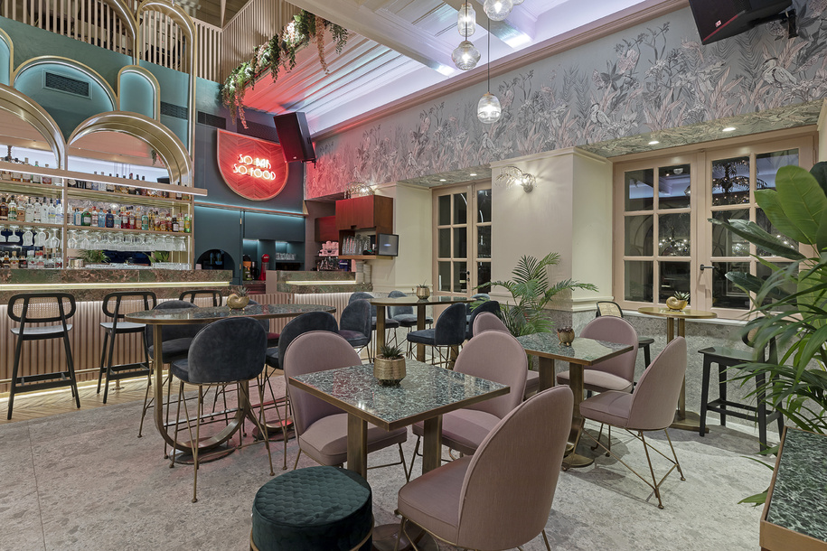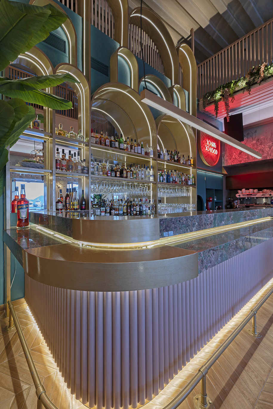 The main synthesis’ design of brass arches inspired by the Art Deco movement, due to its size and colour contrast, highlights the space’s double height, enhancing at the same time the perimetrical mezzanine.