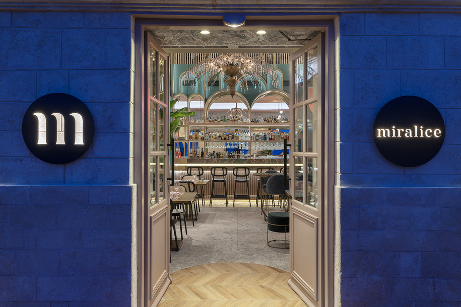 The building’s interior is cloaked with a contrasting layered décor, creating compelling frames through its openings, inviting the passers-by in the grandiose world of Miralice.