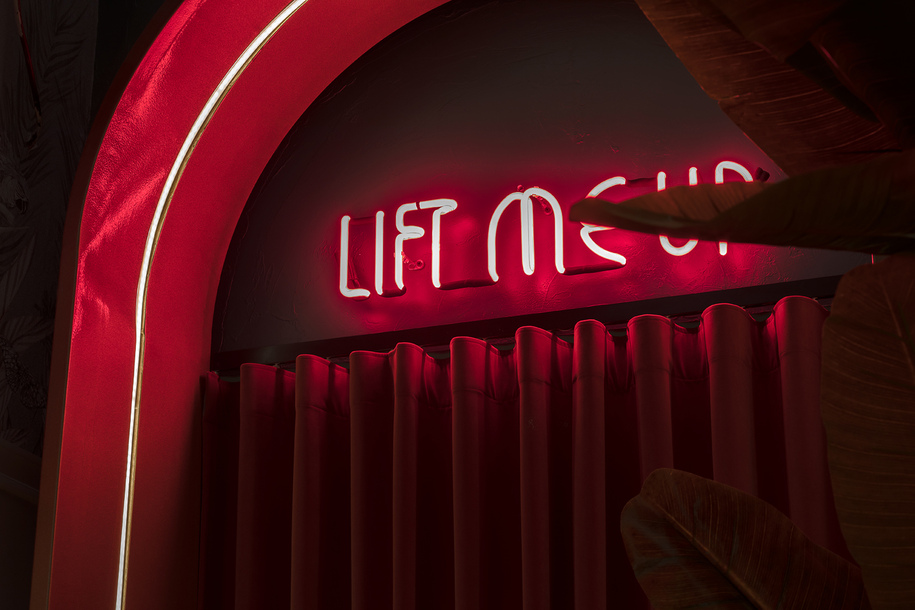 A stylish and contemporary touch is added by the presence of neon accents using the bar’s branding slogans.