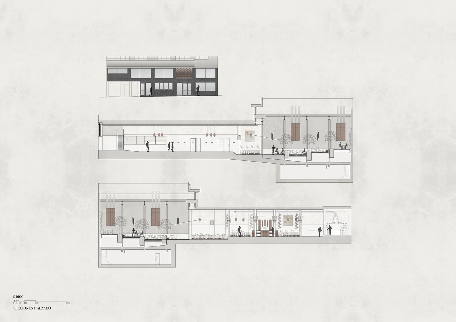 Along the space two soft ramps, one at the beginning and another at the end of the closed space lower the ground in relation to street level. Once in the patio two sets of steps elevate the floor to two parallel higher levels. Underneath those an underground storage space has been created to host stock, furniture and the water tanks and other devices that mange the water circuits.