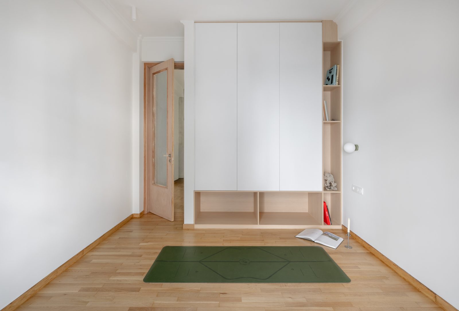 Private spaces were repositioned accordingly: the bedroom was relocated to the brightest area of the apartment, reclaiming daylight as an essential component of domestic comfort, while the bathroom was placed opposite. This inversion liberated circulation and generated an intermediate, unified zone between the two, dissolving the boundaries between movement and habitation.