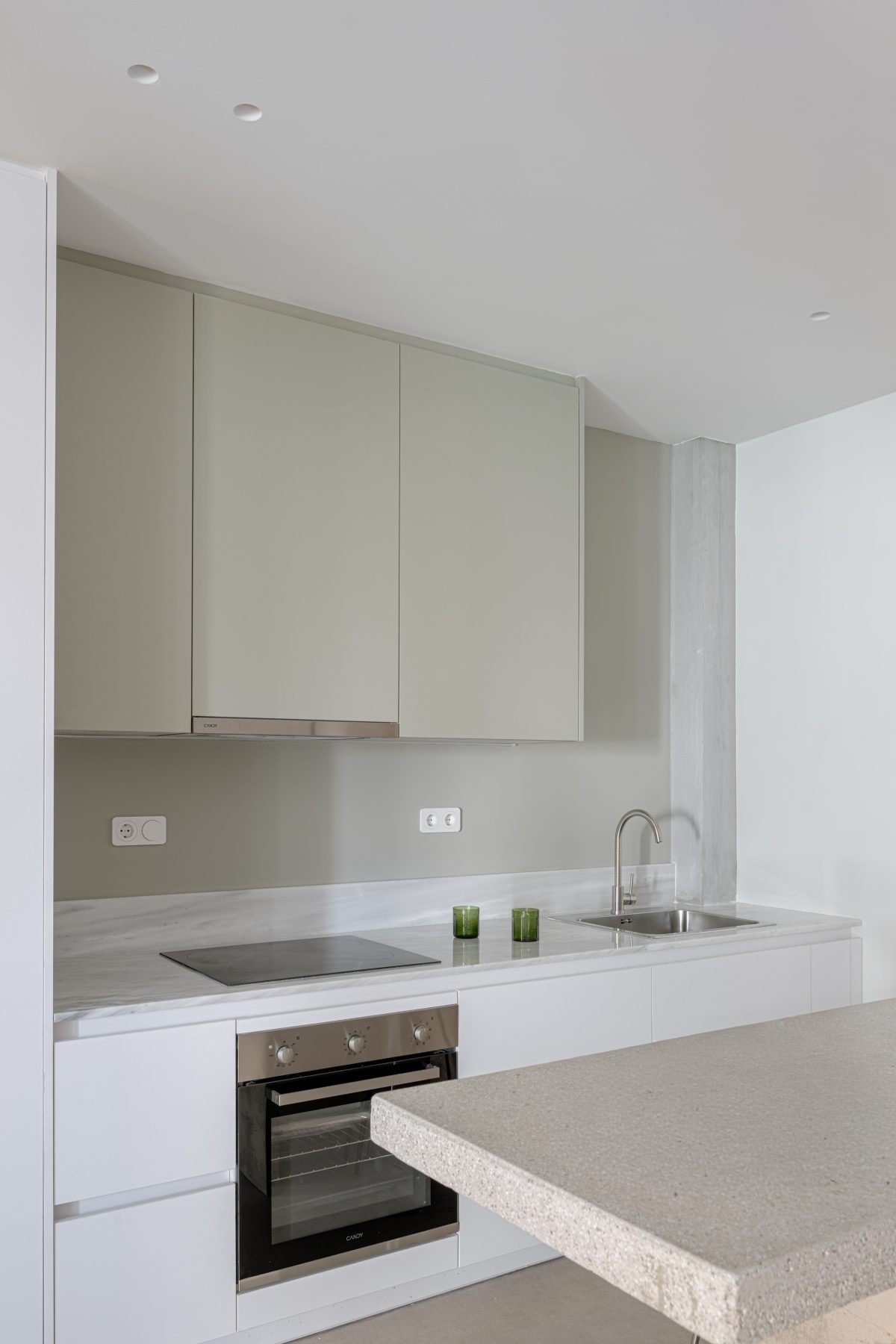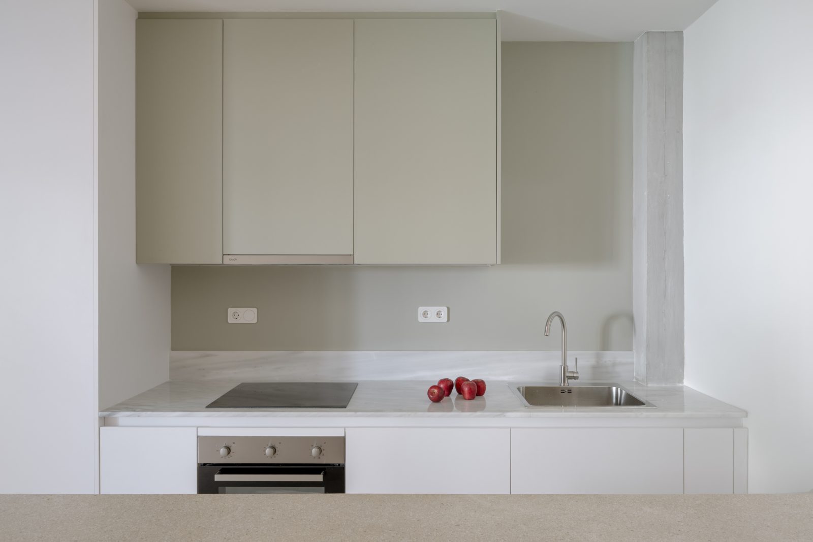 This newly formed space becomes the core of the apartment, accommodating the open living and kitchen area as a single, fluid environment. Within this bright central space, existing elements were not erased but carefully restored.