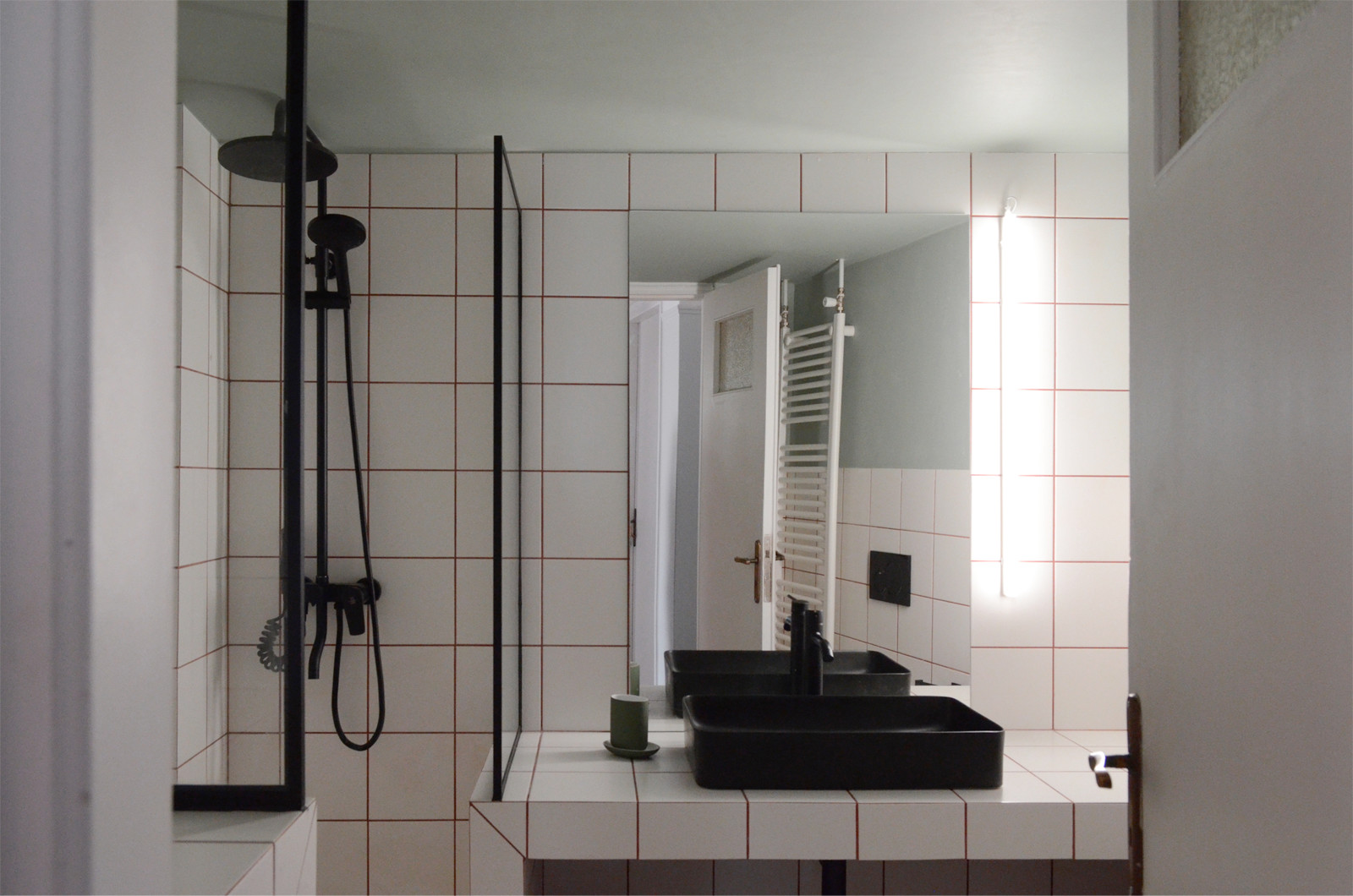 As part of an affordable renovation for a young professional we used the main colours of the floor mosaics to create a moodboard for our small yet crucial interventions. The original plan has been preserved due to its flexibility matching the unpredictability of today’s young habitants and their future needs. An entrance functioning as a filter and threshold for this 95 sqm apartment guides the user to a dining/working space which is flexibly merged with the living/library space with the old yet-of-timeless-functionality sliding wooden-glass doors. A second hall gives access to the most intimate areas of sleeping while at the same time connecting the most public spaces with the restroom and the kitchen.