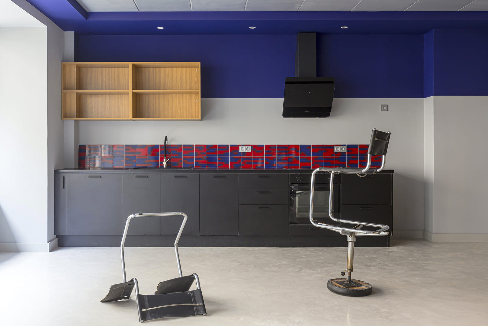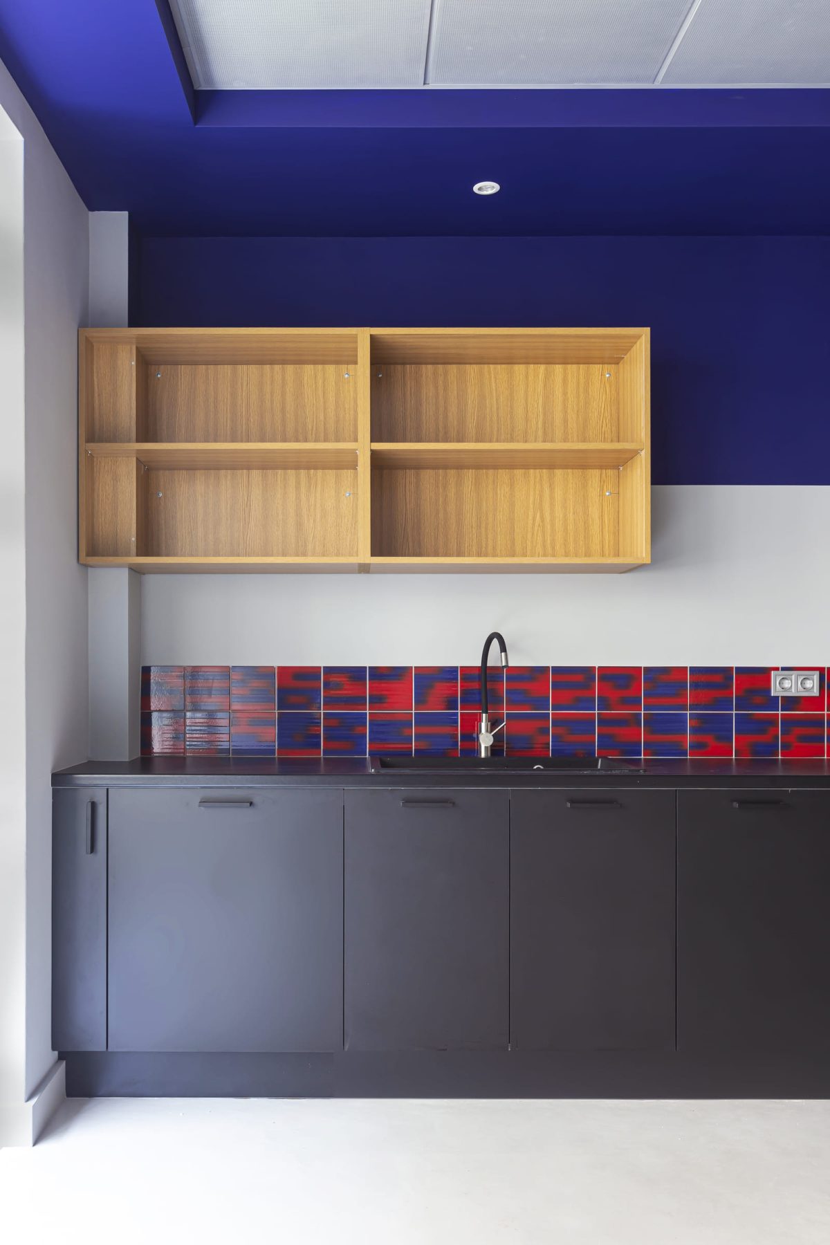 In the main working area, a linear black kitchen becomes both a utilitarian element and a sculptural insert. Above it, oak cabinets introduce warmth and material tactility, while a striking red-and-blue ceramic backsplash introduces a rhythmic visual field—an element that shifts with light and movement. The tiles, with their blurred, almost digital patterning, bring a sense of motion to an otherwise minimal composition.