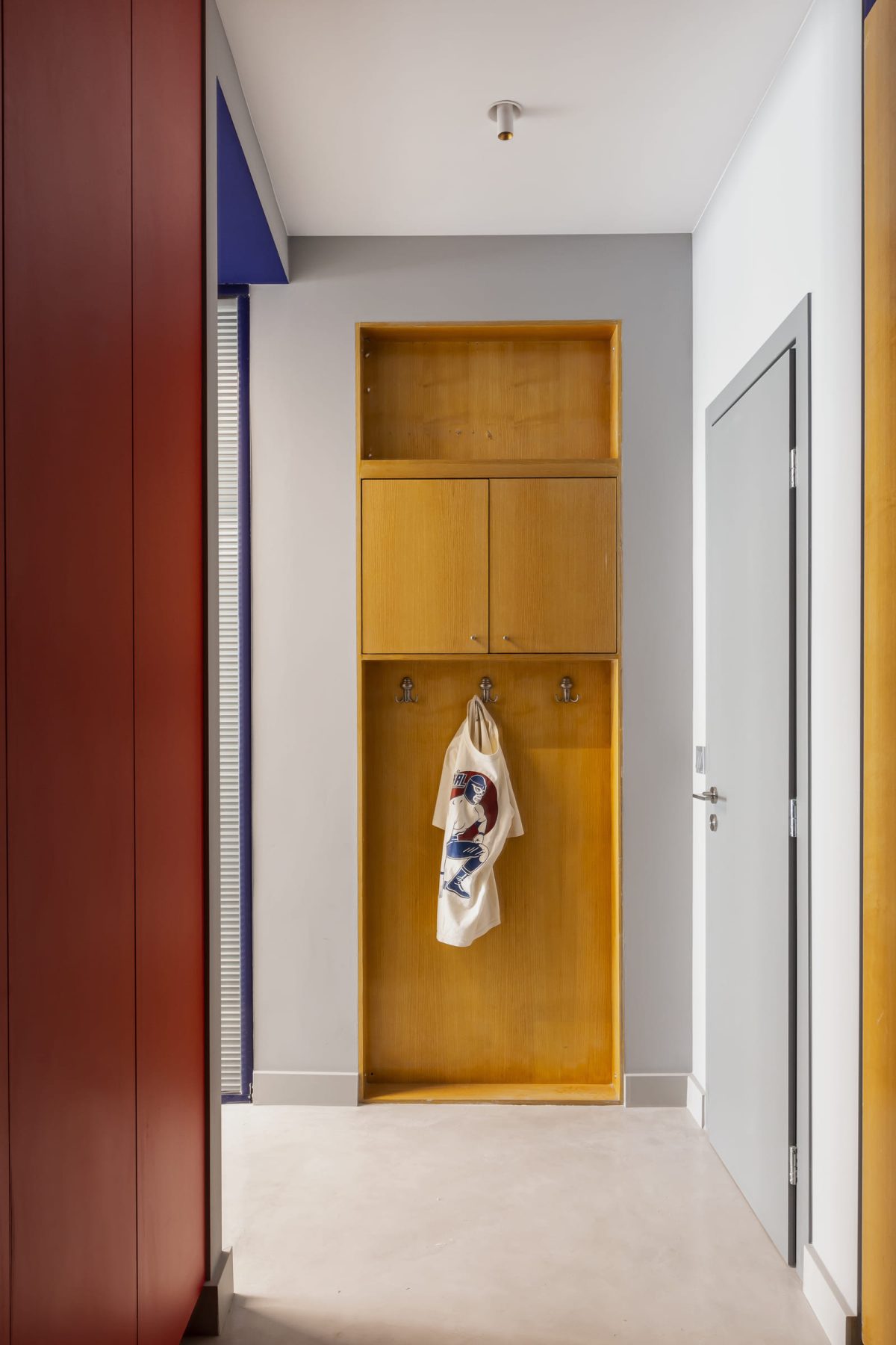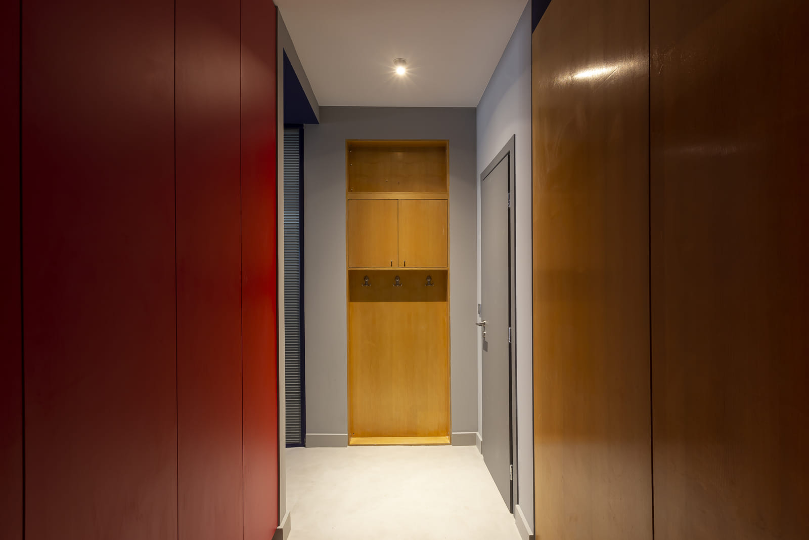 Σε συνδυασμό με ουδέτερες επιφάνειες και ένα συνεχές δάπεδο, επιτρέπει στο περιβάλλον να παραμένει ήρεμο και ευέλικτο, αλλά ταυτόχρονα έντονα αναγνωρίσιμο. Η ζώνη της κουζίνας, με τα μαύρα ντουλάπια, τα ξύλινα ράφια και τα δυναμικά κόκκινο-μπλε πλακίδια, λειτουργεί ως το συναισθηματικό κέντρο του έργου—οικείο, λειτουργικό και εκφραστικό.
