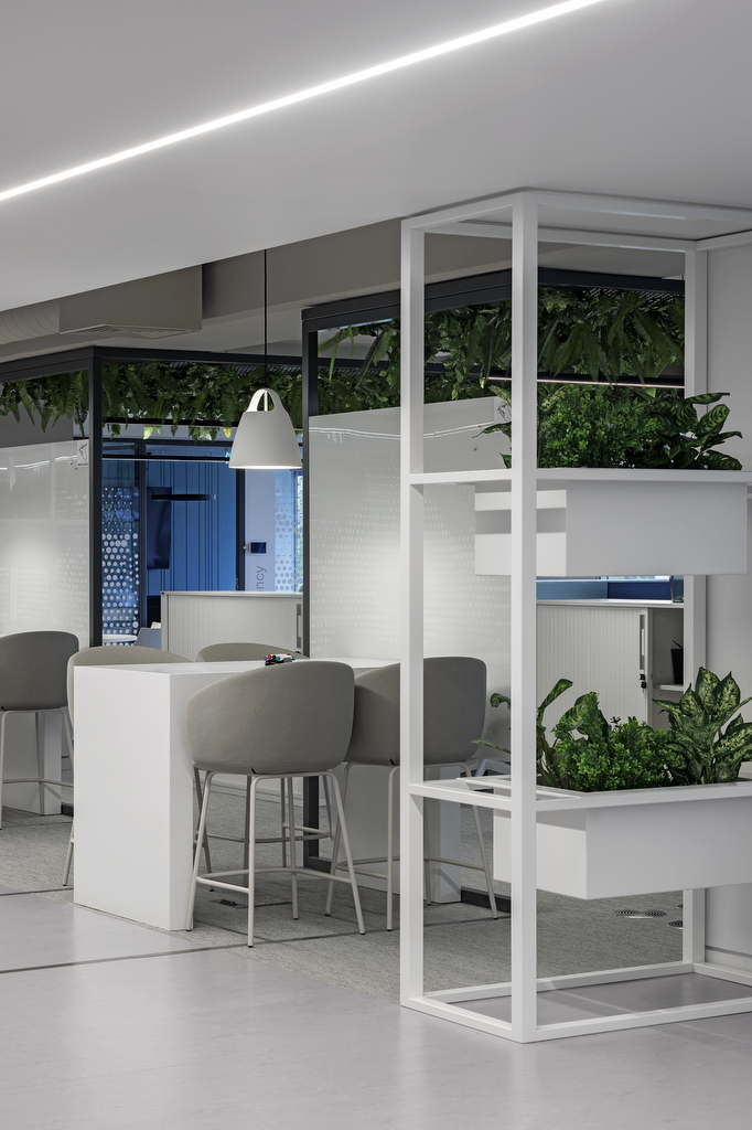 In Bayer’s new offices the design of spaces with many alternative uses, the enhancement of colors, the variety of materials and the formation of green zones all promote biophilia and the well-being of employees and visitors. Circulation within the office space is organized around a core of meeting and focus rooms, while workstations are located next to the buildings’ facades to benefit from natural lighting. A metal structure connects the open plan on both sides of the meeting room core zone and creates multiple visual and functional units, with suspended plants above the workstations and the integration of other functions (writing surfaces, office equipment) when it is vertical in the space.