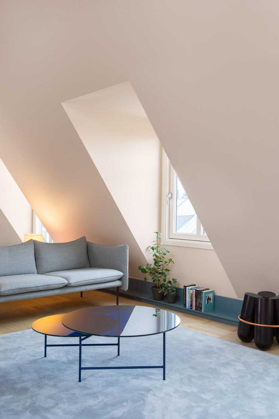 The blue-gray line works as a storage unit and becomes a base for the ceiling height to shoot off from. We utilize the loft’s steep niches in a simple way by filling them with really deep drawers. This framing of the rooms create a classic salon atmosphere, and becomes a wink to architecture of the old days.