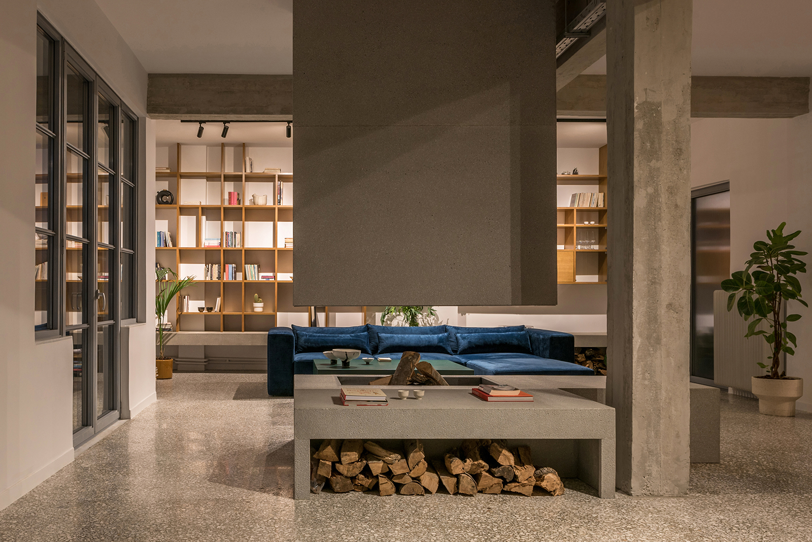 Η προσθήκη του ανοιχτού τζακιού από μπετόν στο κέντρο του, αποτέλεσε τη βασική ιδέα της αρχιτεκτονικής μελέτης.