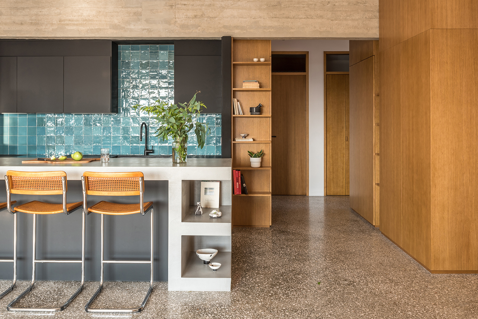 Overcoming the floor plan’s constraints with its irregular endings, the project is characterized by a strong linearity and clarity of form, reinforced by the strict lines of the wooden structures in bookshelves and concealed storage spaces. The furnishings were based on a mid-century aesthetic, with carefully selected vintage pieces, completing the creative vision of the studio for this project.