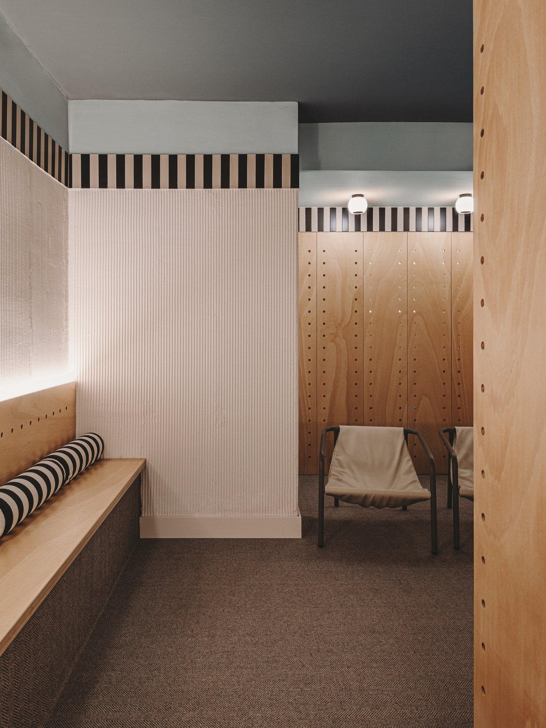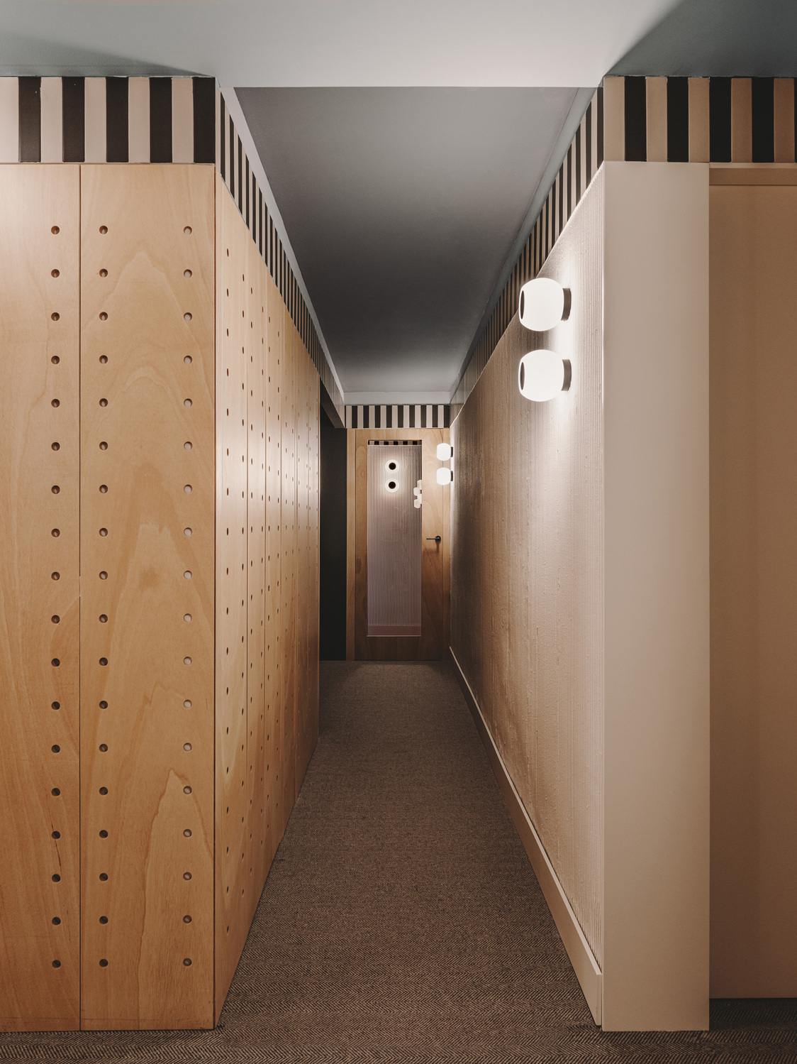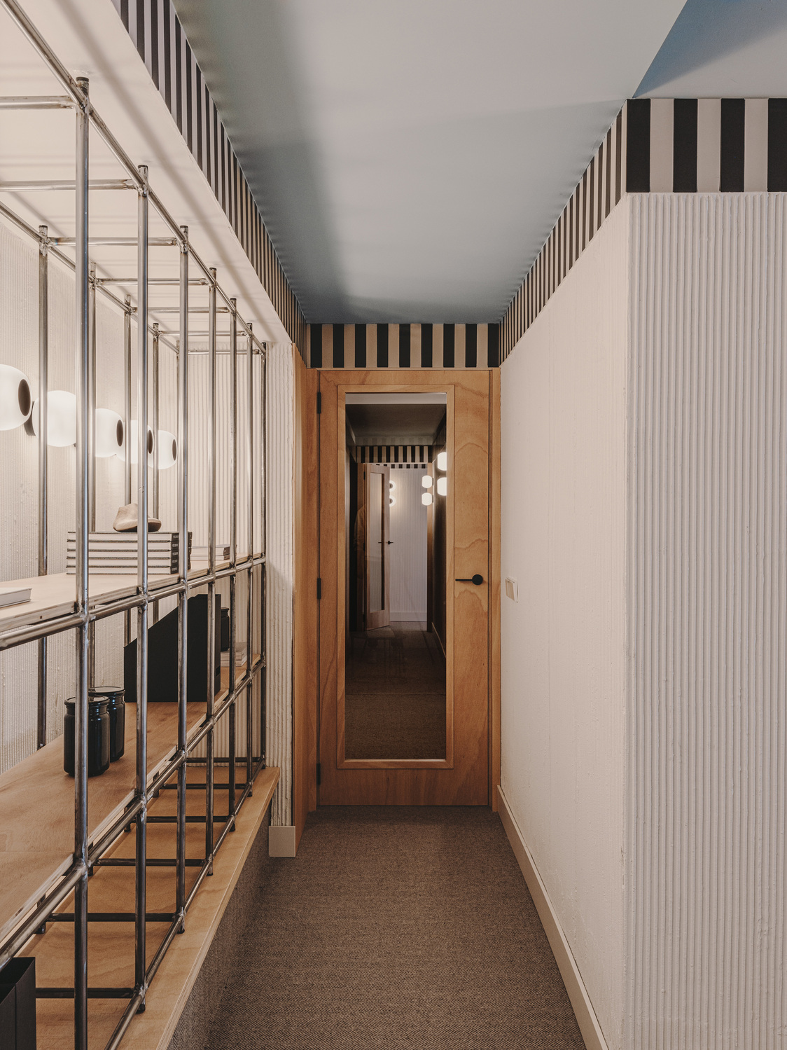 Moreover, Viruta Lab has opted for deliberate imperfection, using blue tones paints to create depth and individual porcelain plaques in beige and black to regularize the project’s height. Perforated marine wood and dark carpet on the floor add warmth and calmness to the space, while the lighting program proposes a play of indirect light to elevate the feeling of intimacy and comfort.