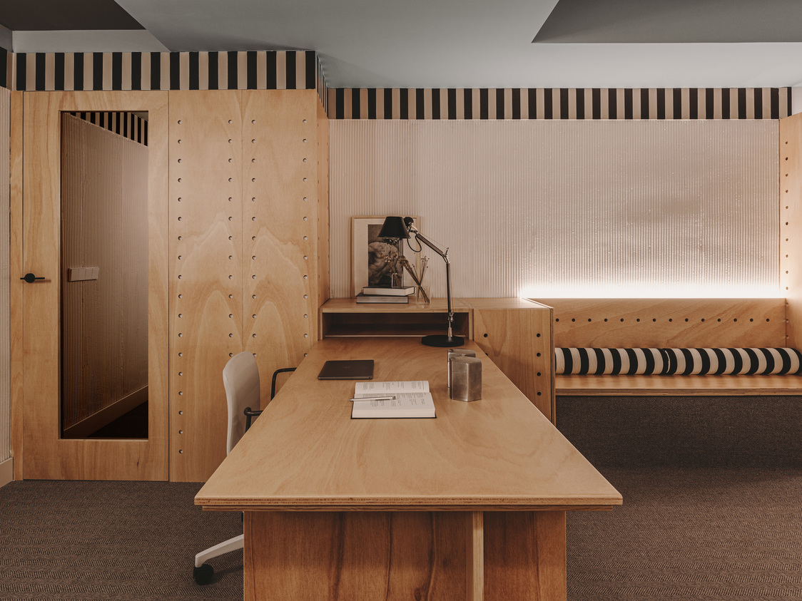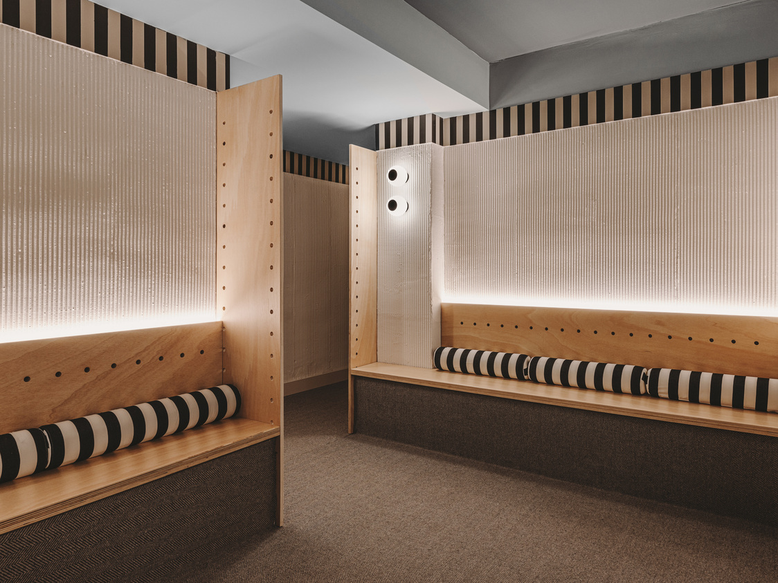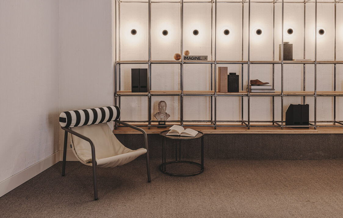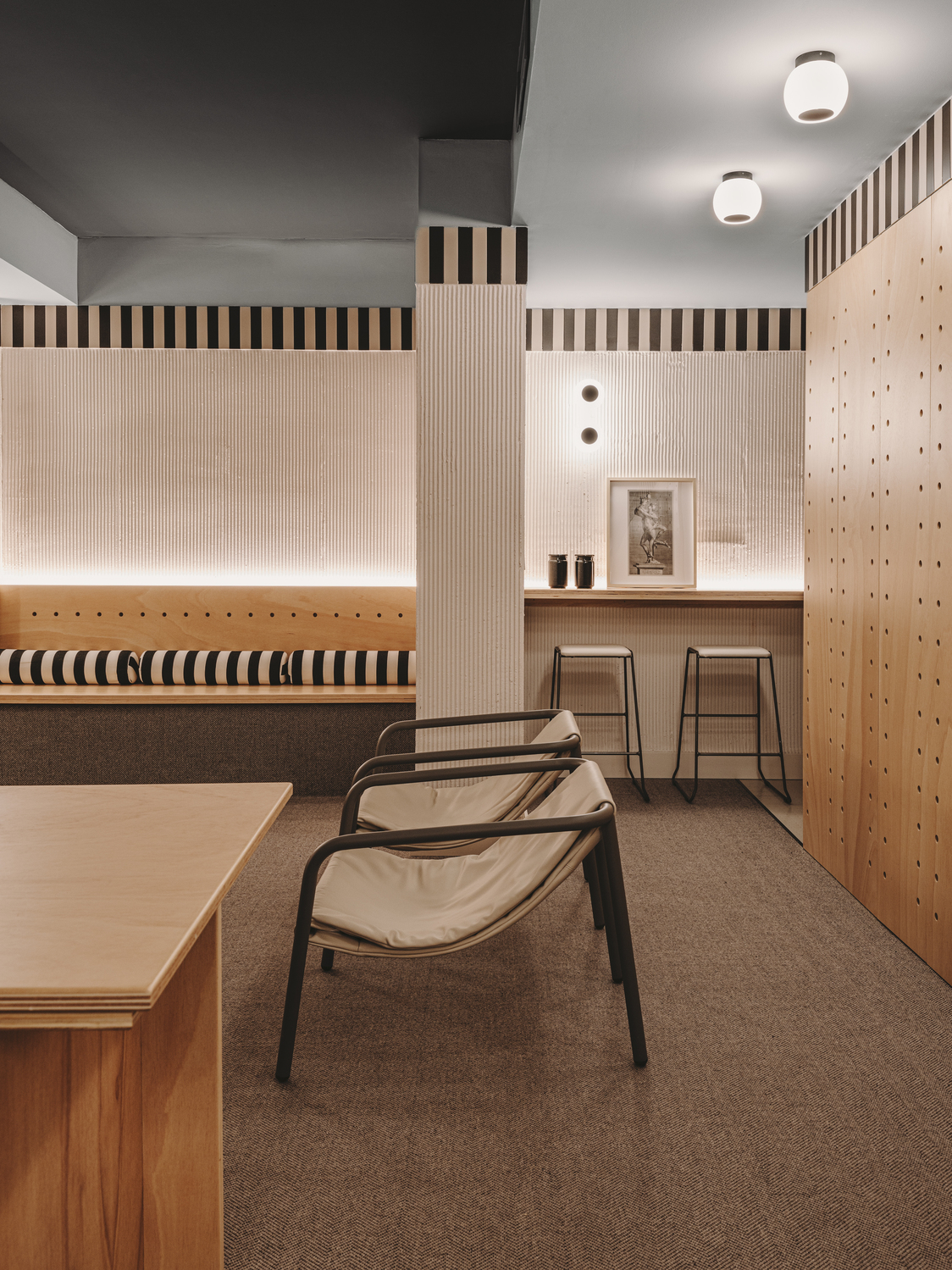 Moreover, Viruta Lab has opted for deliberate imperfection, using blue tones paints to create depth and individual porcelain plaques in beige and black to regularize the project’s height. Perforated marine wood and dark carpet on the floor add warmth and calmness to the space, while the lighting program proposes a play of indirect light to elevate the feeling of intimacy and comfort.