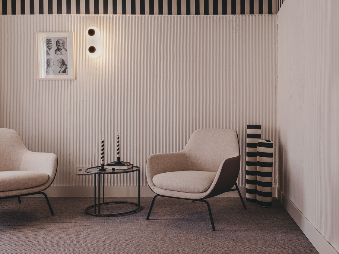 A black-and-white frieze, like a canvas where destinies intertwine, runs perimetrically throughout the space, dividing it visually into two parts and reserving most of it for the earthly realm, for overcoming problems and the challenging journey proposed by Plato represented in the black horse. This architectural element speaks of that balance between opposites, where a subtle line delineates the darkness from the light. The color palette on the ceiling plays with two shades of blue, creating a sense of depth in the space. On the other hand, the dark carpet covering the floor imbues the space with calmness and warmth and acts as an anchor to the mundane and earthly. In certain areas, the carpet extends in the form of a baseboard, creating fluid transitions.