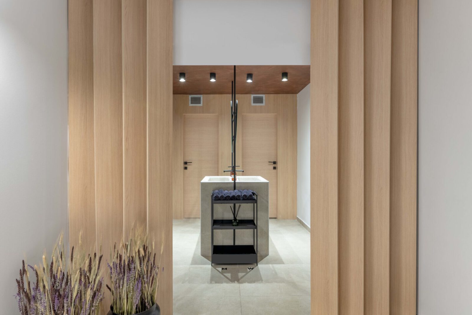 The wooden floor was sanded and varnished. The materials used are tile glue to create texture on the central wall, a special paint technique named ‘’Rusten” on all metal elements and plastic colors on the walls. Wooden constructions and linings were used in various places to create spatial boundaries but also to create a warm atmosphere. We designed built- in flower planters from plasterboard which were protected with geotextile. Inside they have dried aromatic plants placed on a styrofoam base, covered with soil and pebbles.