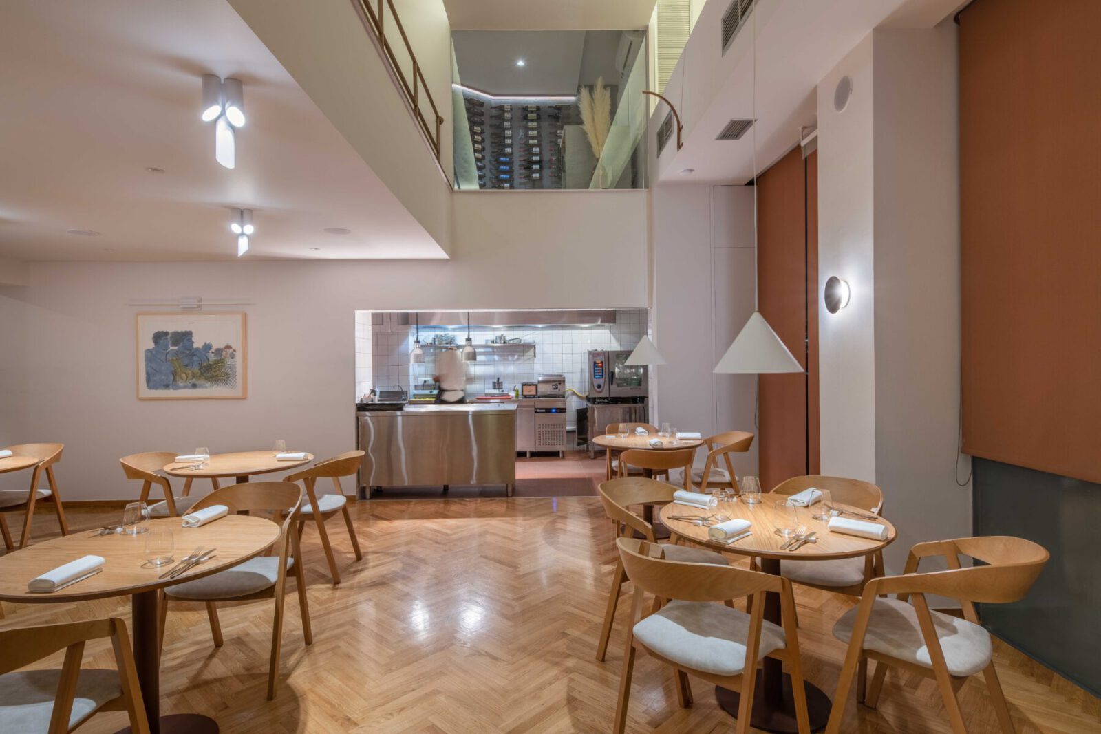 The space consists of two levels. On the ground floor is the walk-in kitchen that has direct visual contact with the hall area.Wooden round tables are placed in the hall to determine the appropriate flow and route throughout the space but also to create a more intimate sitting arrangement.