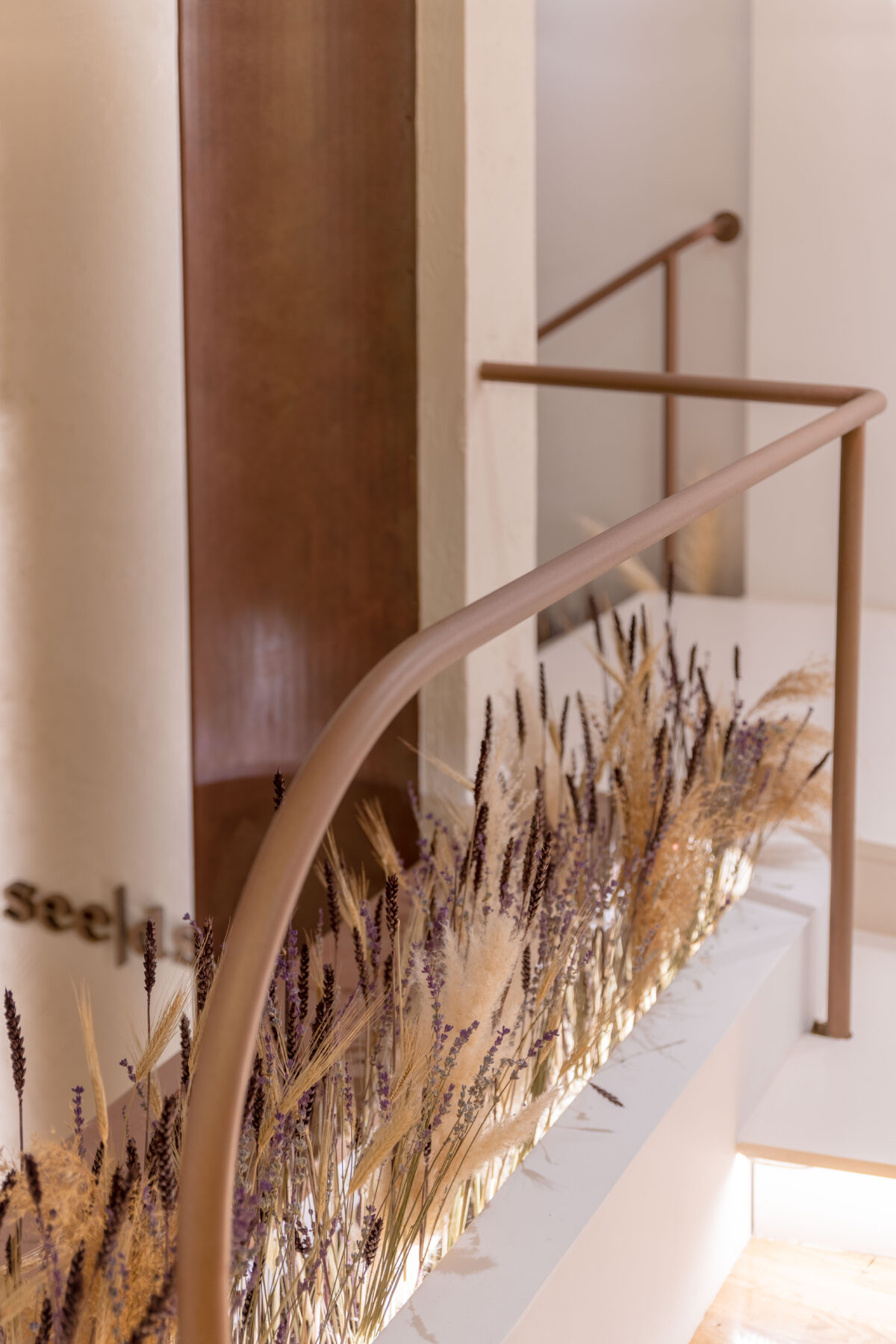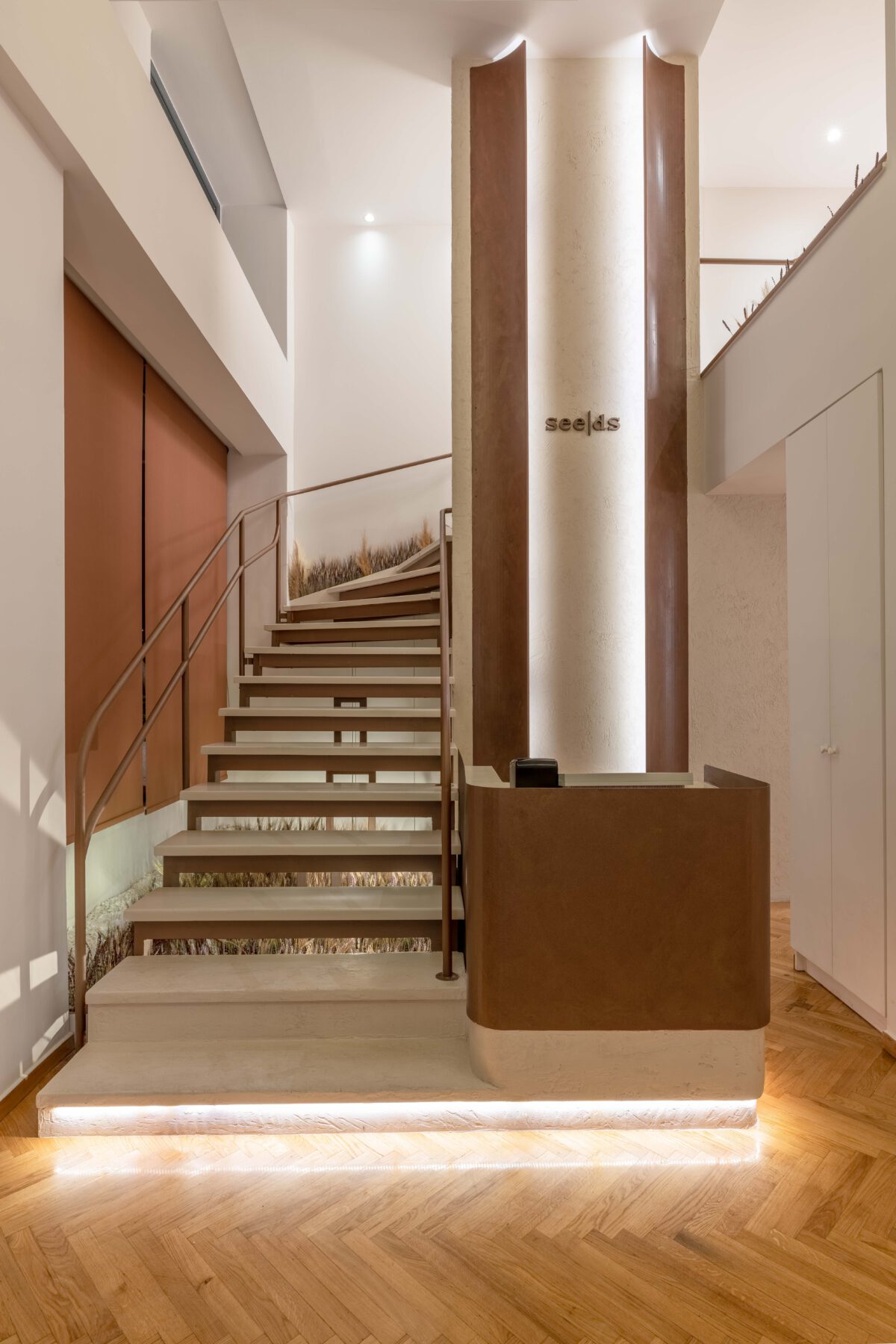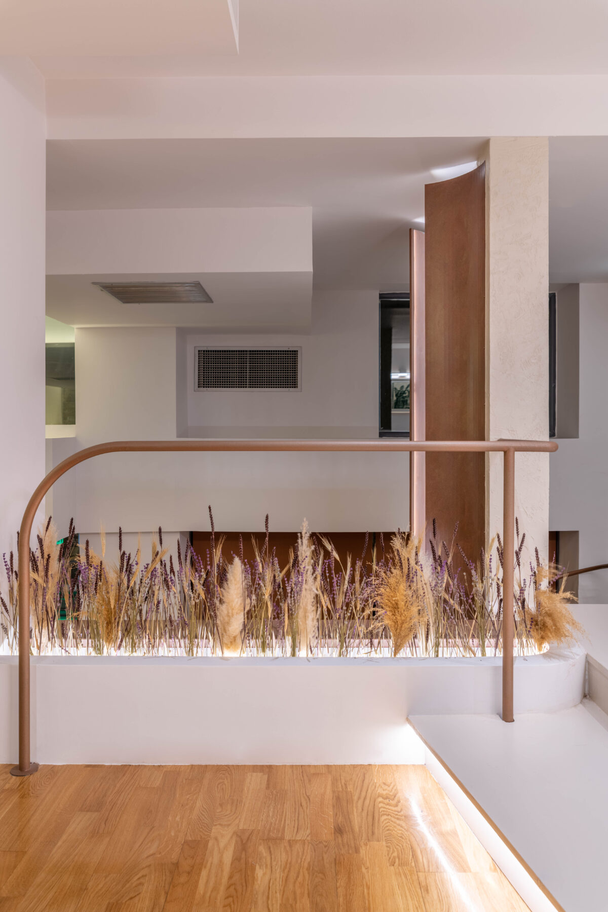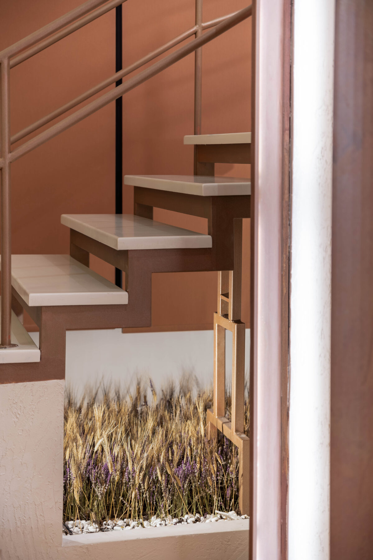 We used curved lines in the areas of the new handrail, custom furniture and the specially designed reception area. The texture of oxidized copper in combination with wood, red tone details and dried aromatic plants create a complete culinary experience that starts from the sense of space and ends with the sense of taste.