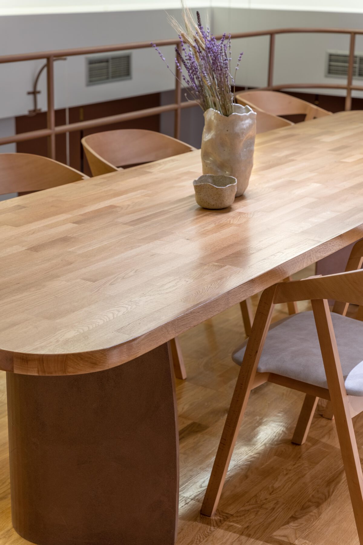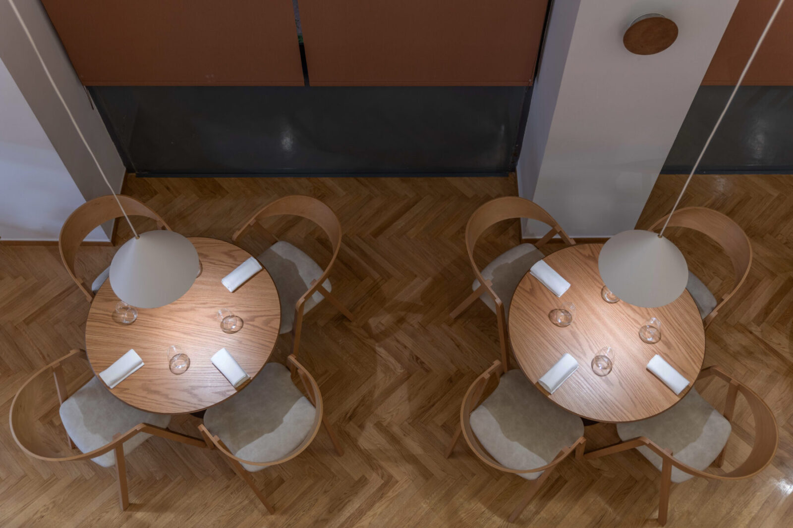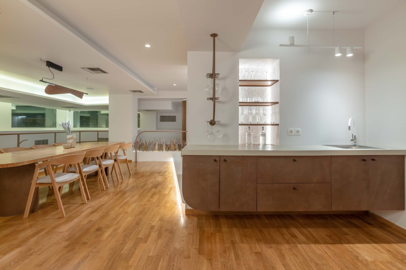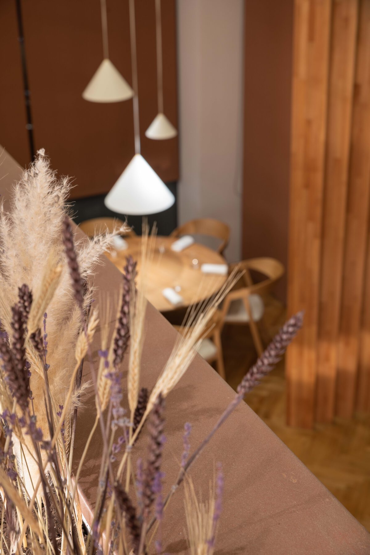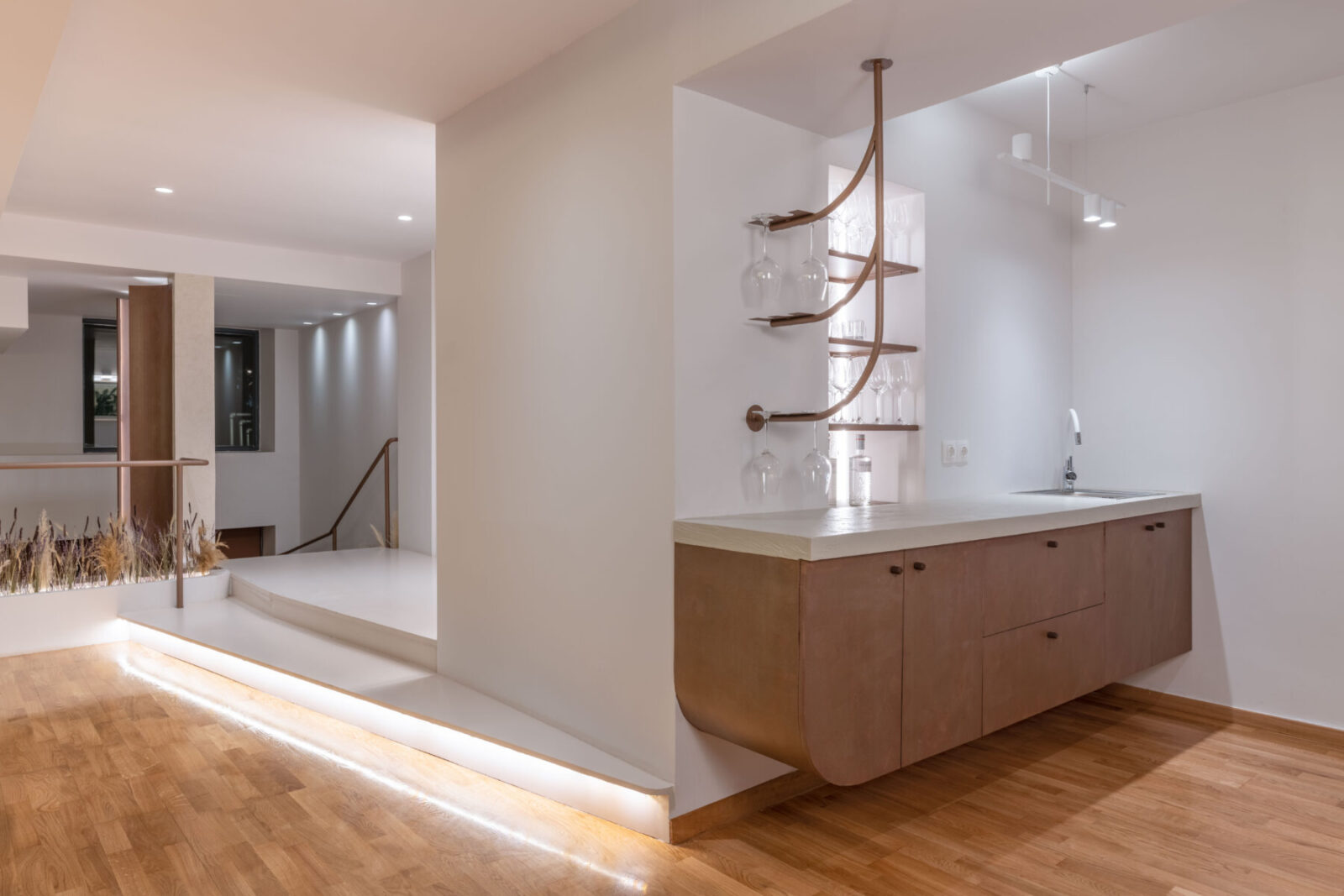 We used curved lines in the areas of the new handrail, custom furniture and the specially designed reception area. The texture of oxidized copper in combination with wood, red tone details and dried aromatic plants create a complete culinary experience that starts from the sense of space and ends with the sense of taste.