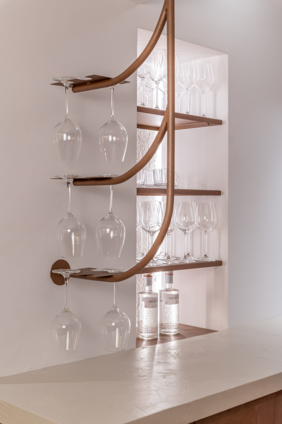 Οι καμπύλες γραμμές αποδίδονται στο χώρο μέσω της νέας κουπαστής, των custom επίπλων και του ειδικά διαμορφωμένου χώρου υποδοχής. Η υφή του οξειδωμένου χαλκού σε συνδυασμό με το ξύλο, τις κεραμιδί λεπτομέρειες και τα αποξηραμένα αρωματικά φυτά δημιουργούν μια ολοκληρωτική γαστρονομική εμπειρία που ξεκινάει από την αίσθηση του χώρου και καταλήγει στην αίσθηση της γεύσης.