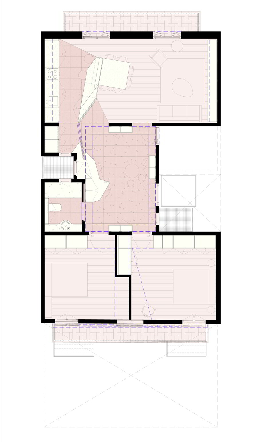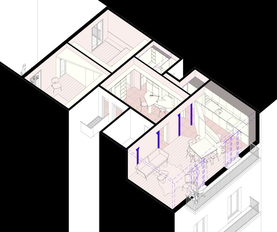 Thirdly, by defining the uses of the other two spaces and identifying the space towards the street as a daytime space (living room-dining room-kitchen) and the space towards the inner courtyard of the block as a night space (2 bedrooms).